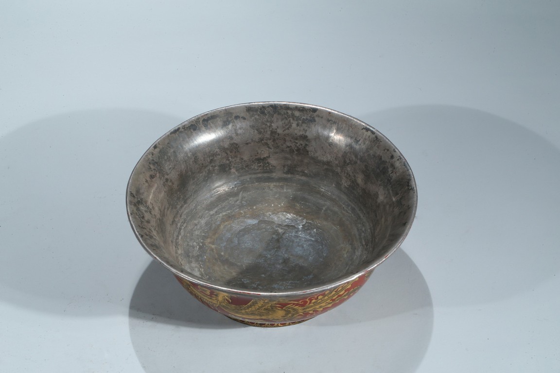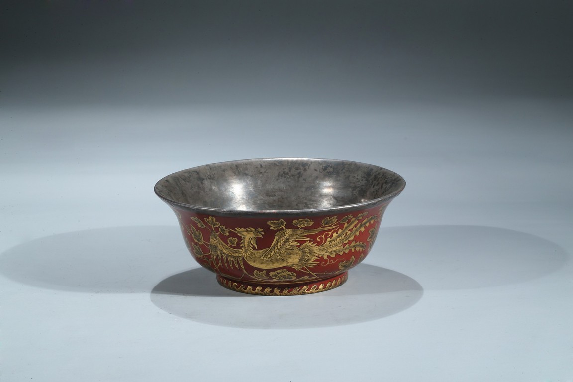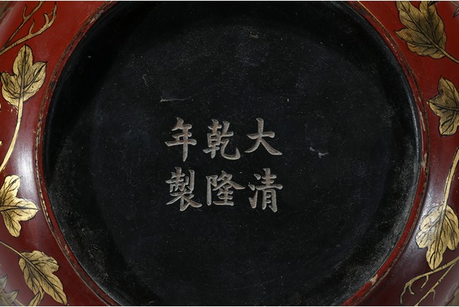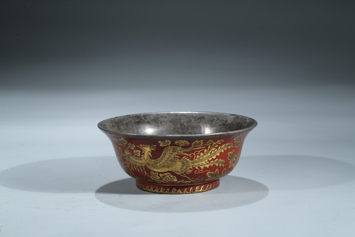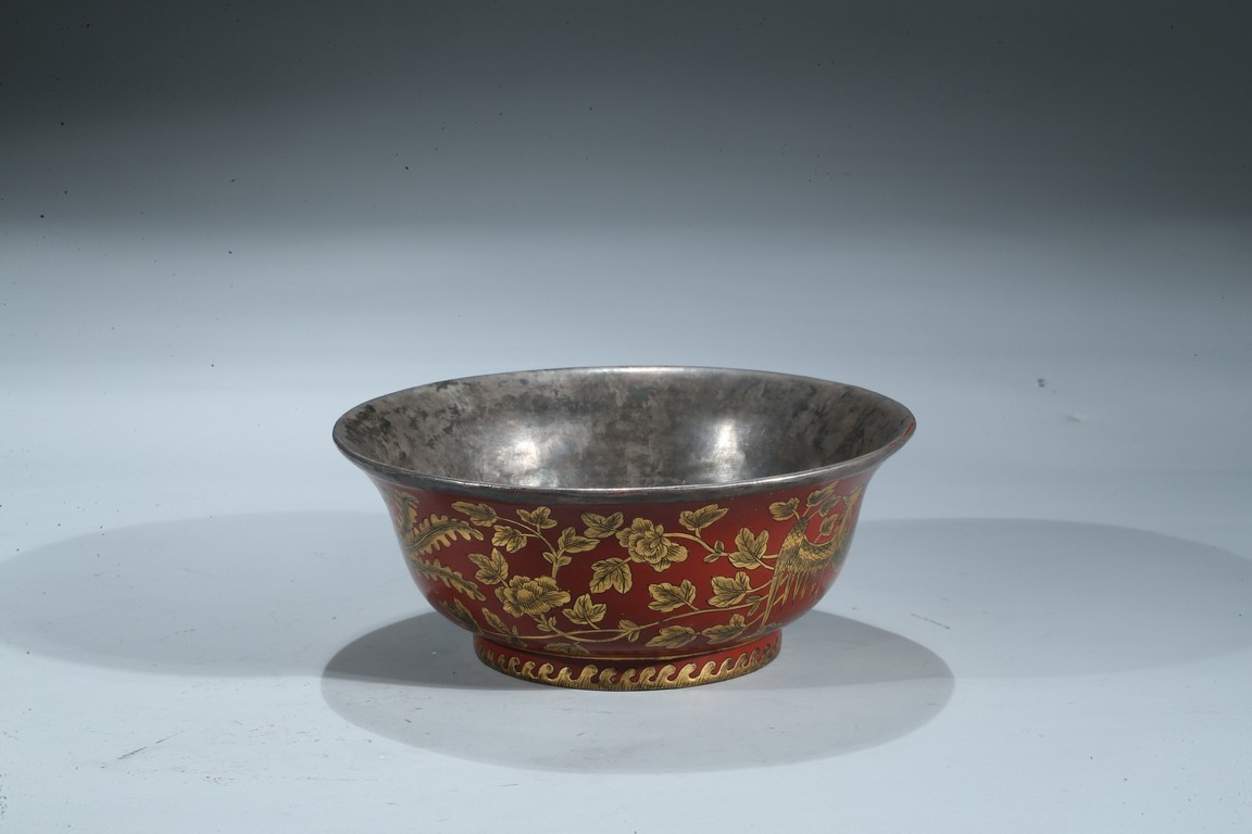 Of rounded sides and rising to everted rim, the exterior delicately painted in gilt to depict phoenix amidst meandering leafy scrolls, all reserved in red lacquer ground, the base inscribed with six character mark. Qing Dynasty period.