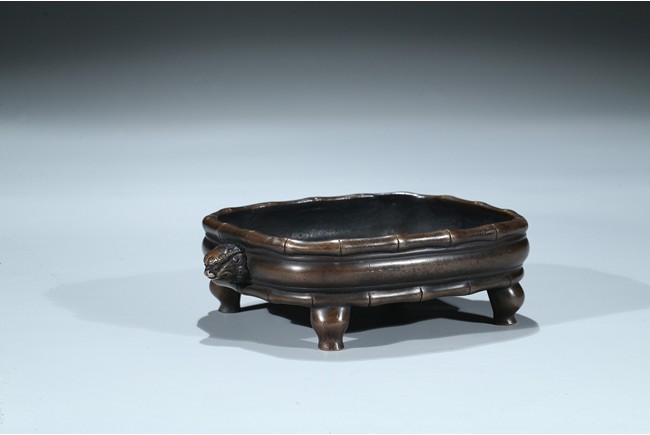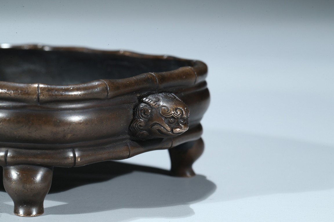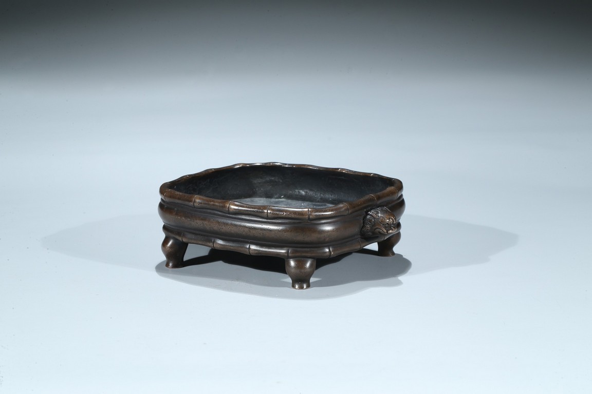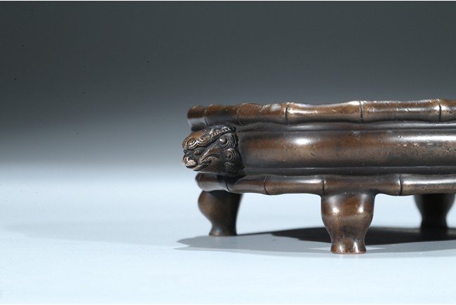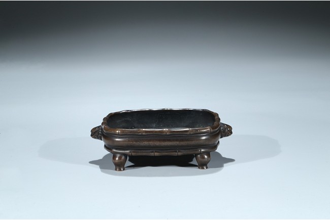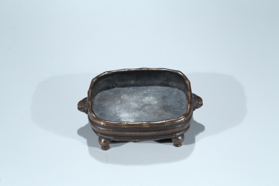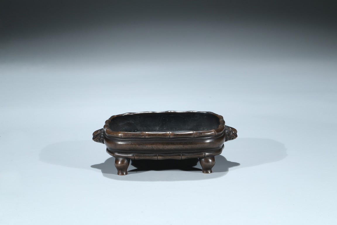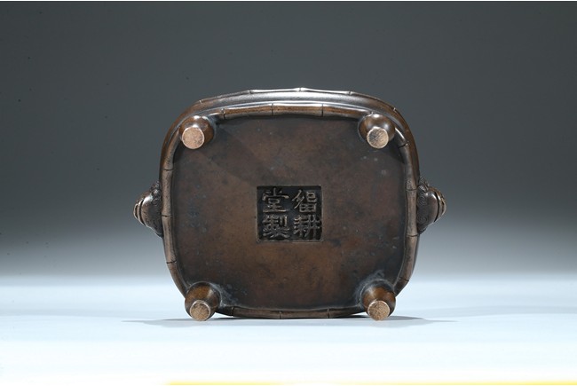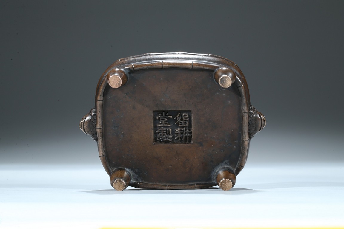 Of compressed rectangular form, the rim and base cast to resemble bamboo sections, the sides flanked by two raised mythical beast heads, the base centered with a four character mark. Qing Dynasty period.