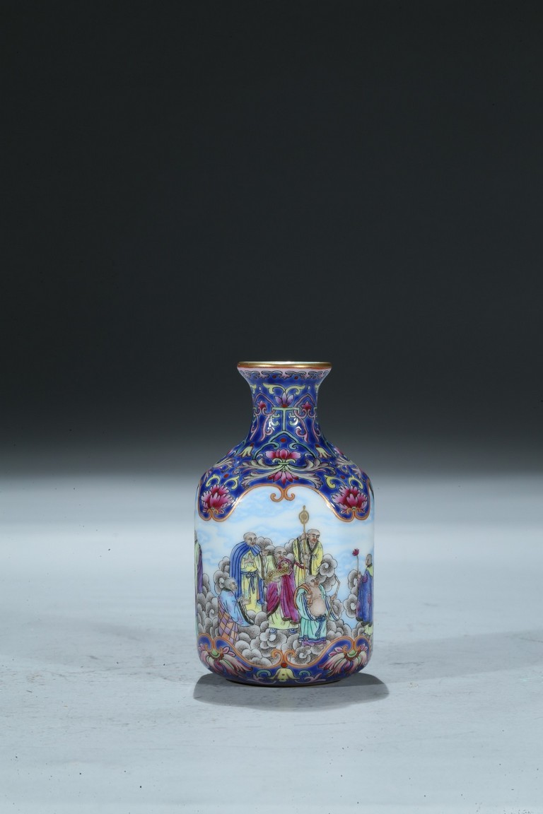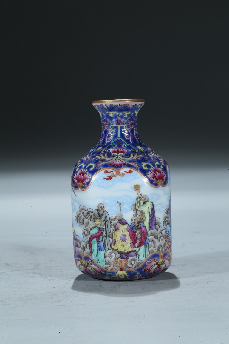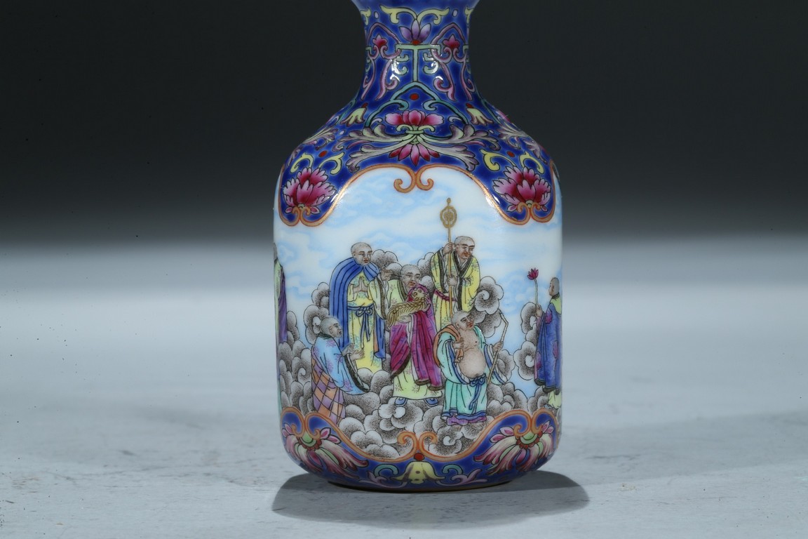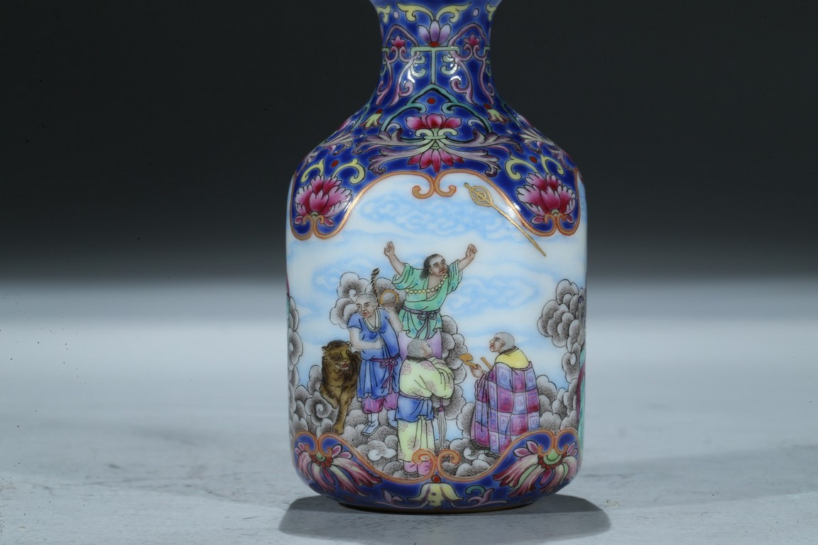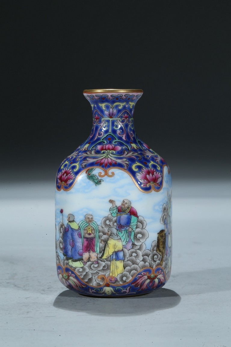 The vase is enamelled to the exterior various arhat figures above clouds. The shoulders are decorated with stylized lotus scroll reserved on blue ground, the mouth rim gilt painted, the underside inscribed with a six character Qianlong mark. Qing Dynasty period.