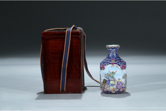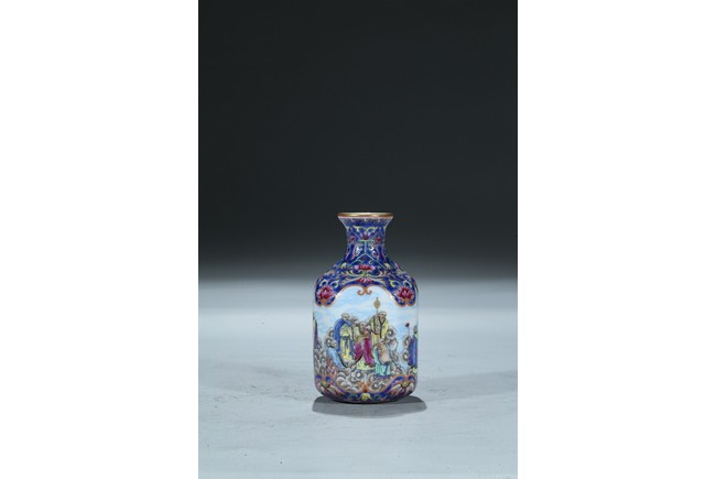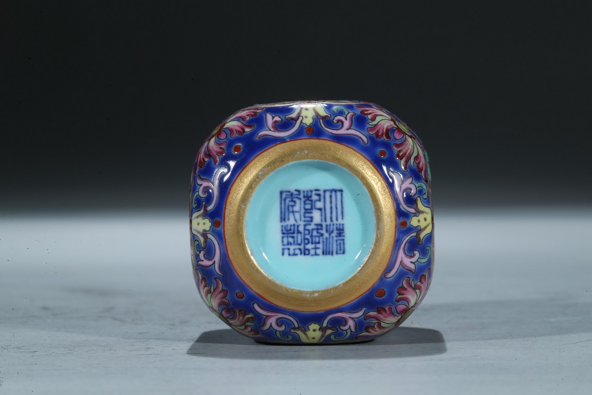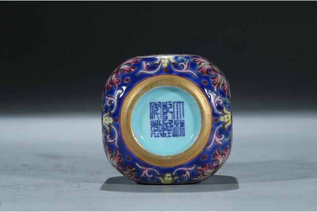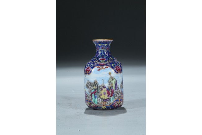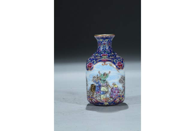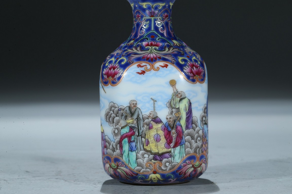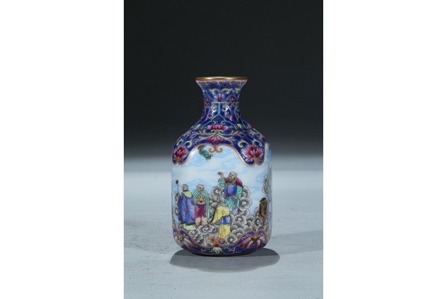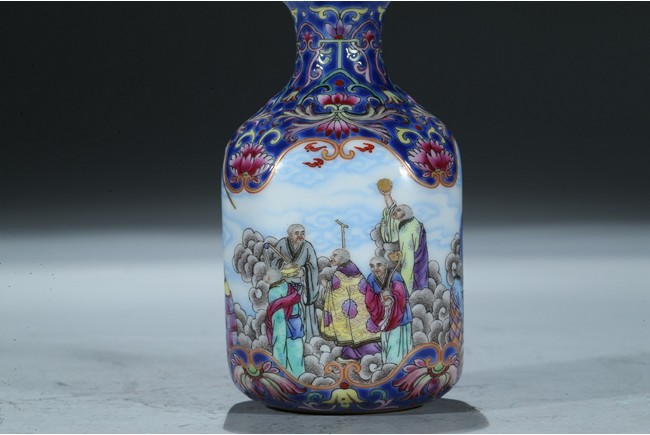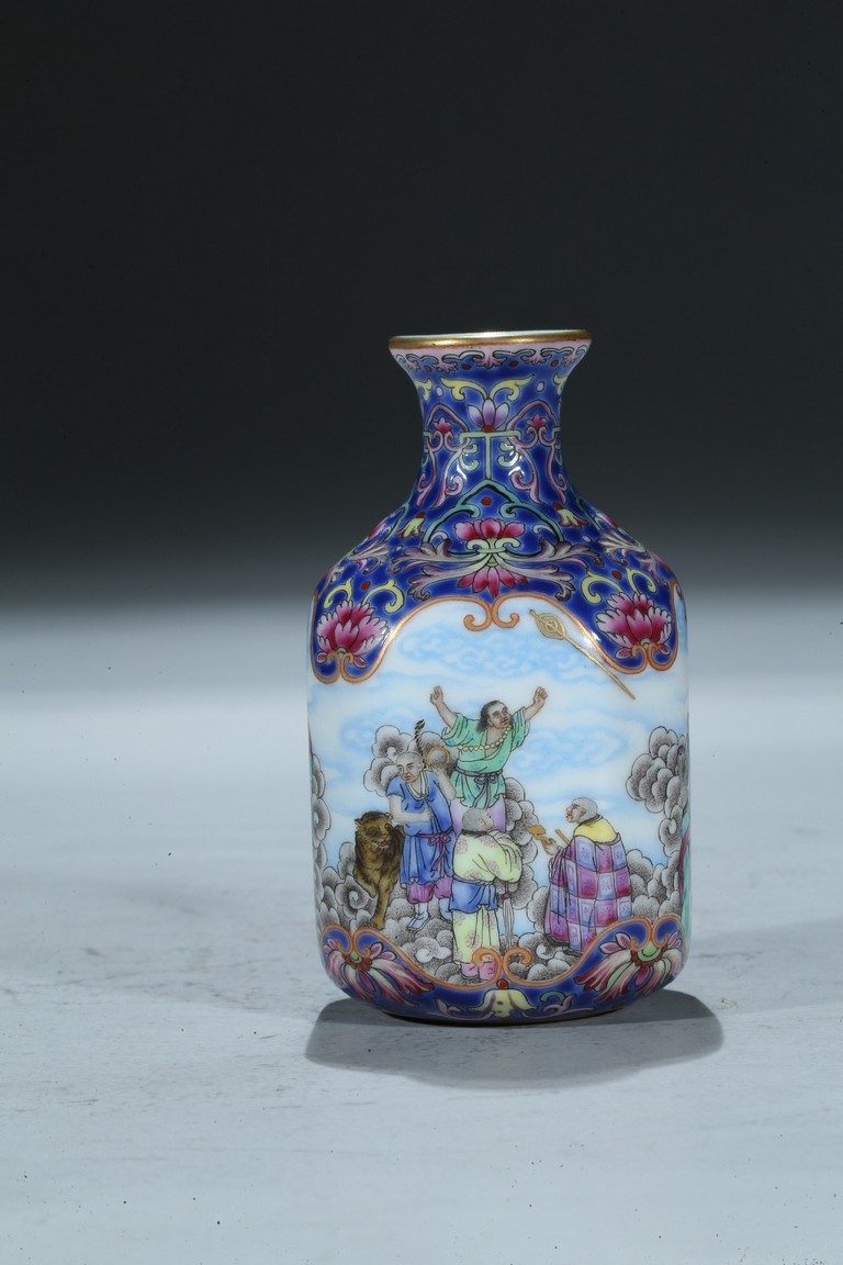 The vase is enamelled to the exterior various arhat figures above clouds. The shoulders are decorated with stylized lotus scroll reserved on blue ground, the mouth rim gilt painted, the underside inscribed with a six character Qianlong mark. Qing Dynasty period.