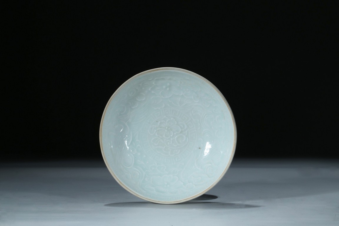 The dish is raised on a short circular foot ring, to the shallow rounded sides , the interior carved with dense plum blossom with sterms and key-fret pattern , overall covered with a celadon glaze. Song Dynasty period.