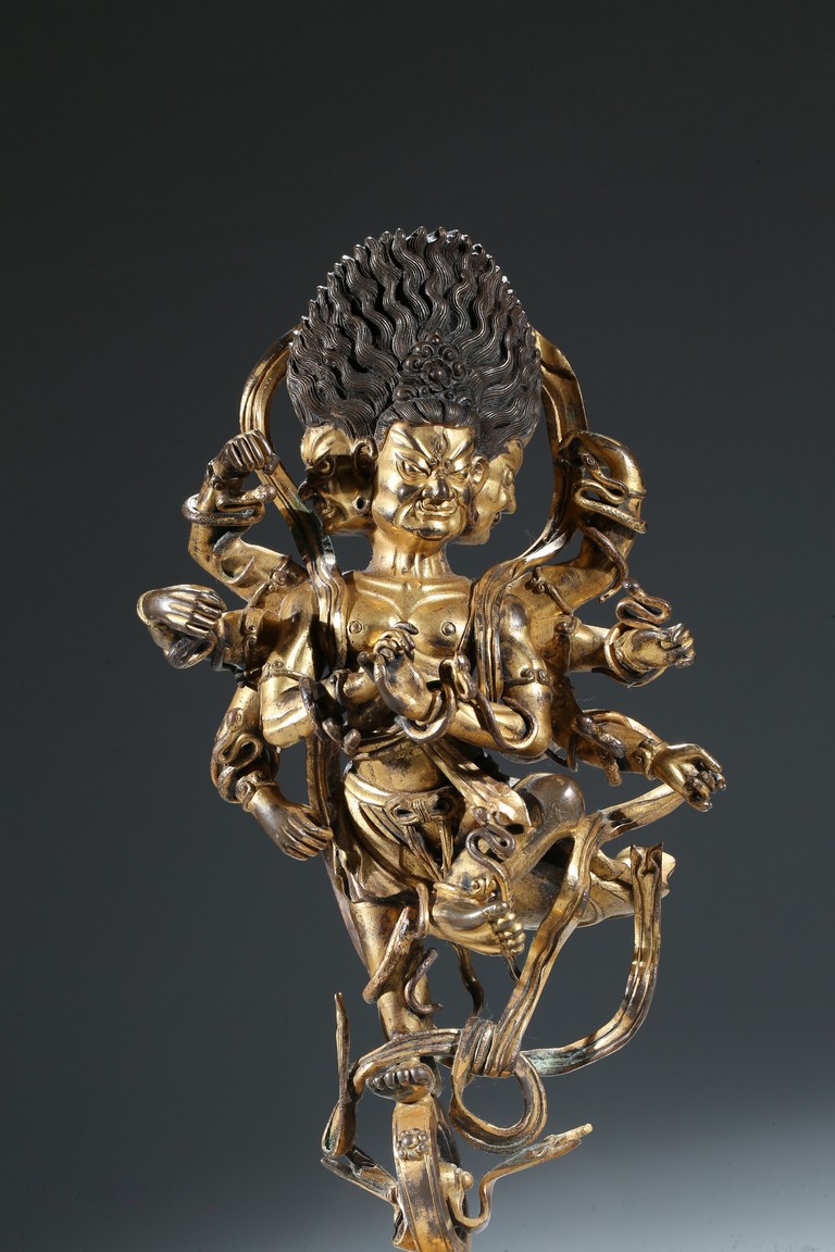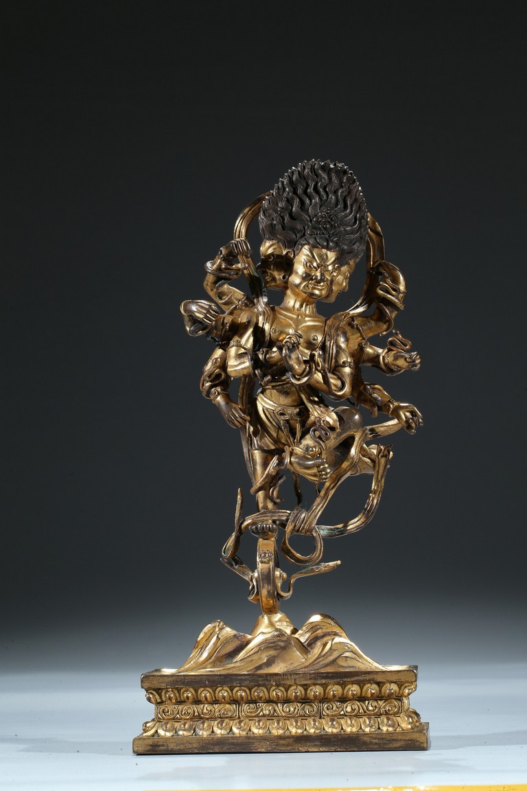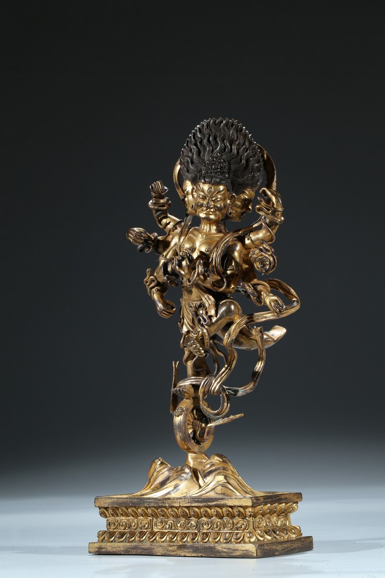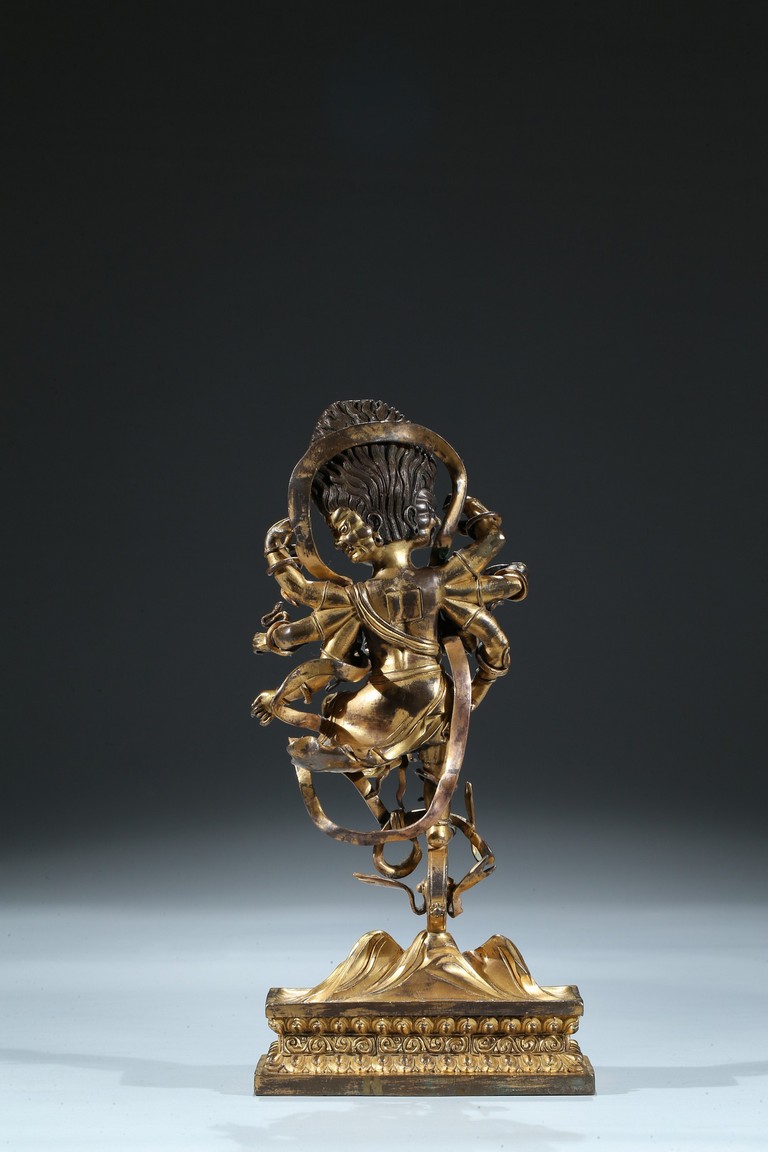 The figure is shown standing on one foot upon a wheel on top of raised hill-like stand, with multiple arms and primary hands raised in front of chest in mutra, body with celestial ribbons across shoulder and arms, with three faces in ferocious expression and flame-like hair, all supported on a rectangular double lotus throne. Qing Dynasty period.