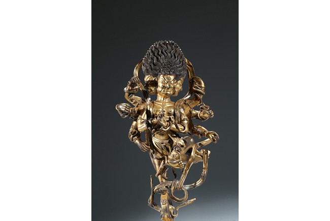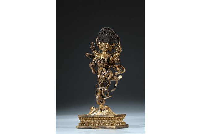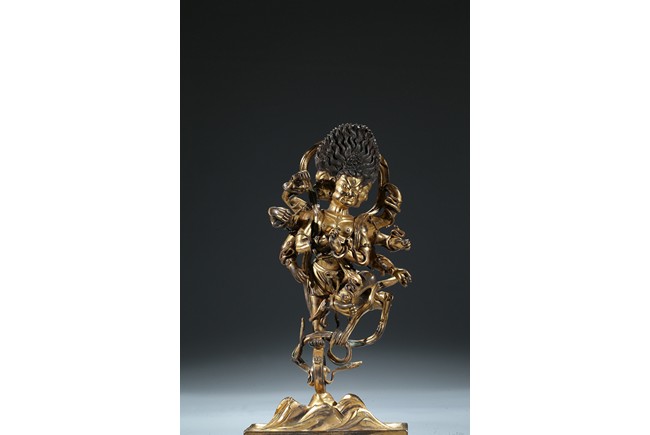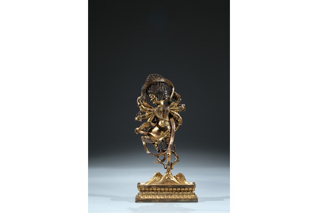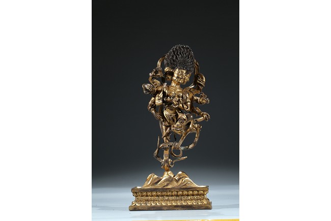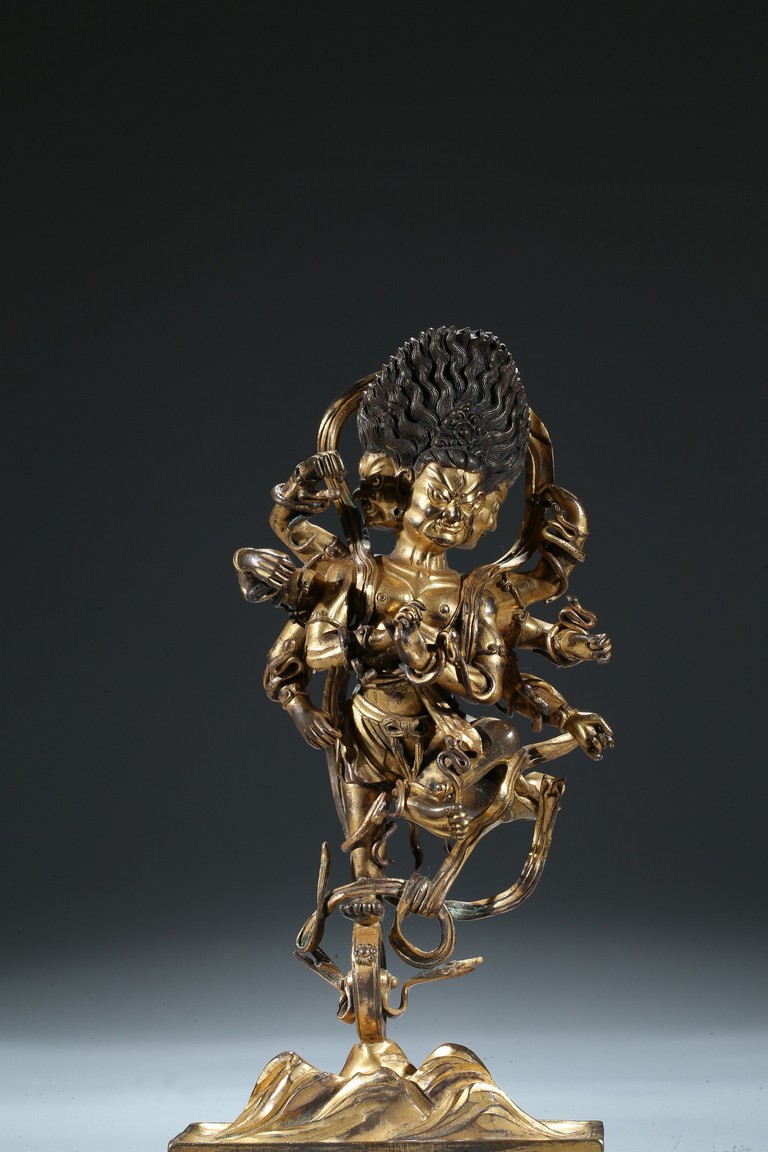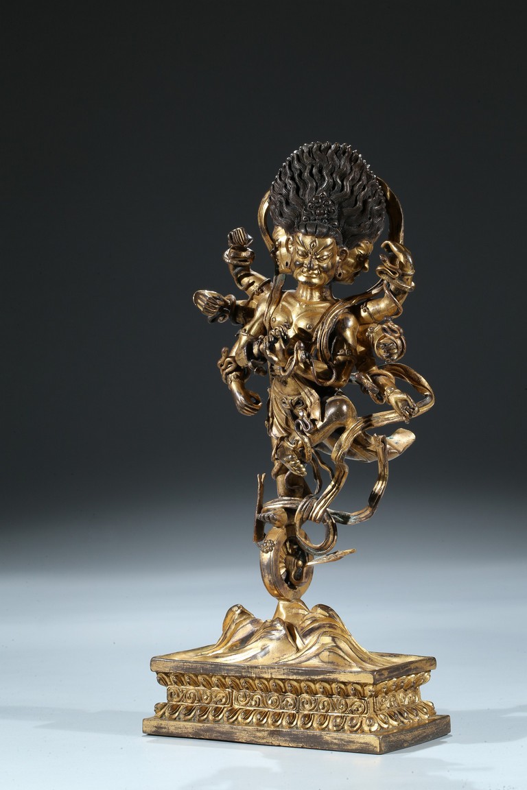 The figure is shown standing on one foot upon a wheel on top of raised hill-like stand, with multiple arms and primary hands raised in front of chest in mutra, body with celestial ribbons across shoulder and arms, with three faces in ferocious expression and flame-like hair, all supported on a rectangular double lotus throne. Qing Dynasty period.