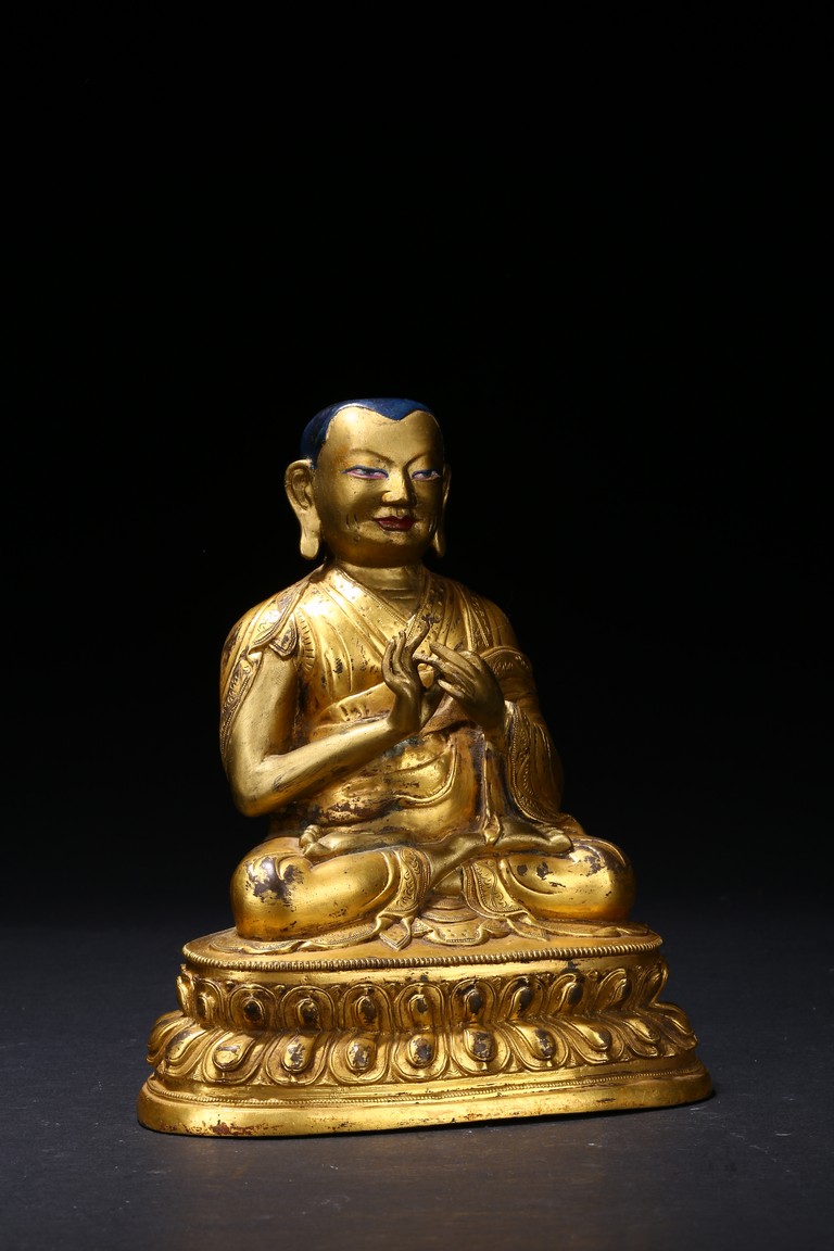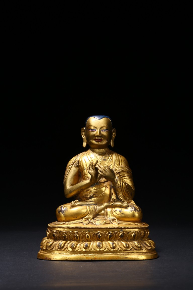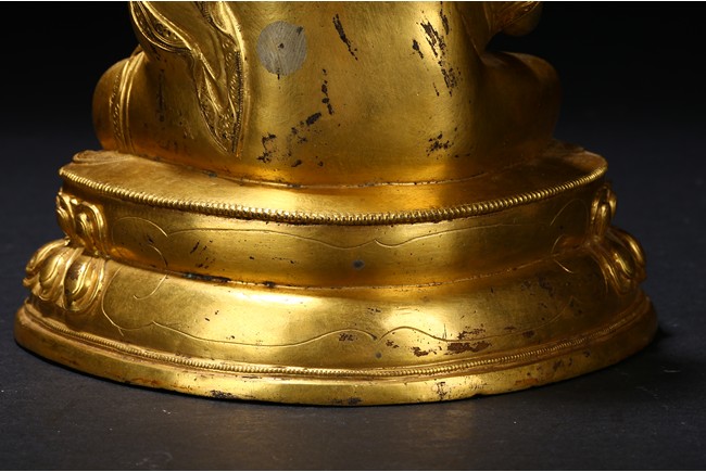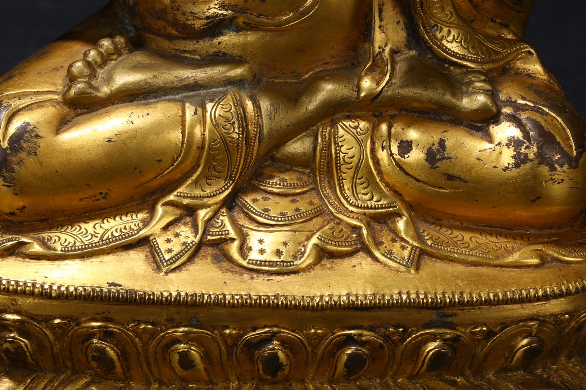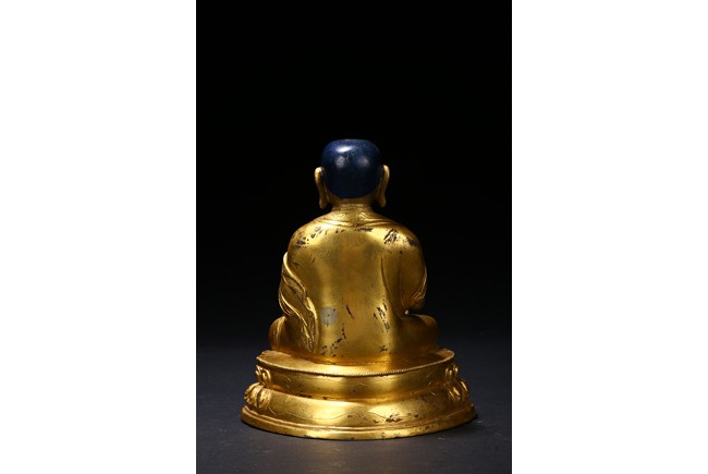Seated on a double-lotus base in dhyanasana and wearing long robes,the hands are held in Dharmachakra Mudra,the face with serene expression. Qing Dynasty period.