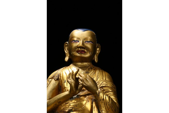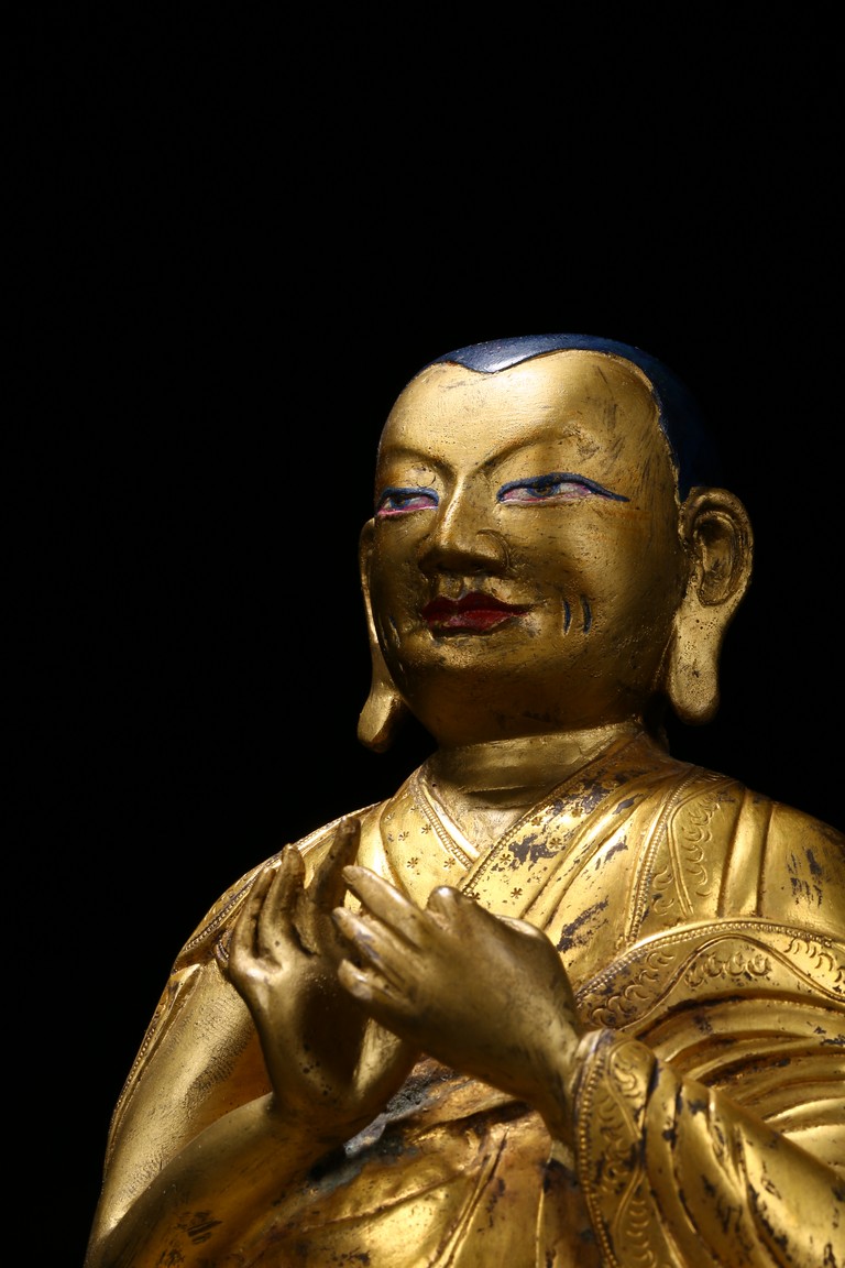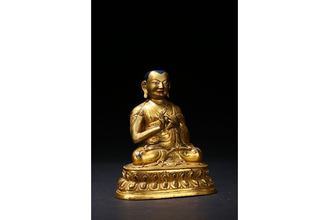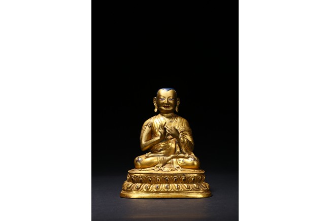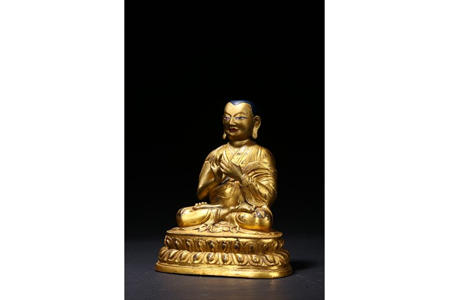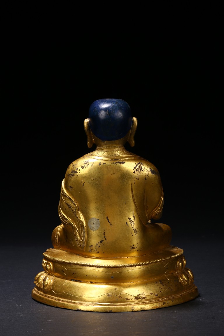 Seated on a double-lotus base in dhyanasana and wearing long robes,the hands are held in Dharmachakra Mudra,the face with serene expression. Qing Dynasty period.