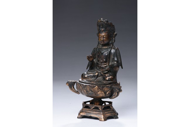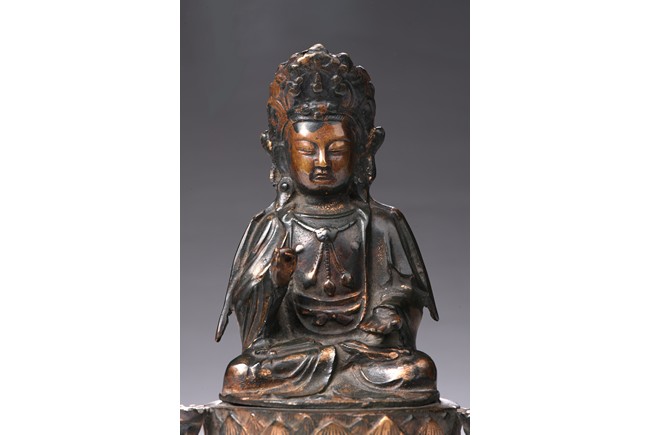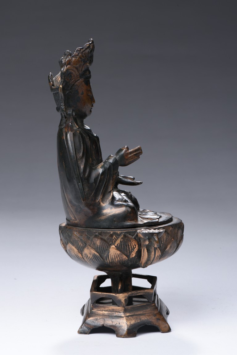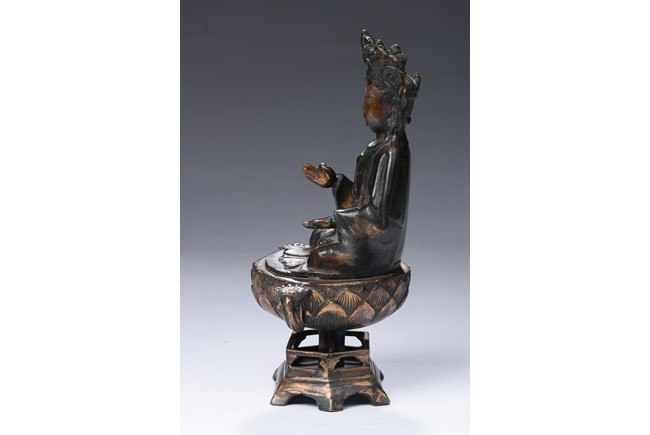 Shown seated on a lotus throne supported by a stand,the bodhisattva is shown in dhyanasana,hands in abhaya mudra ,wearing long and voluminous robe,chest adorned with beaded jewelry,the face shown in meditative expression,wearing a crown with a seated Amitabha at center. Qing Dynasty period.
