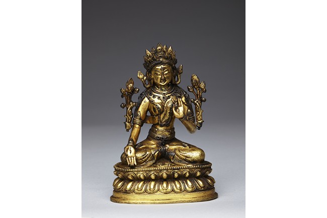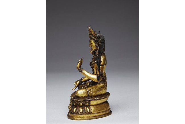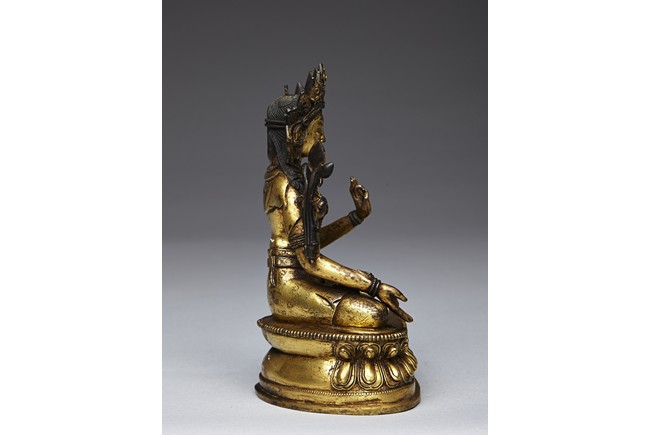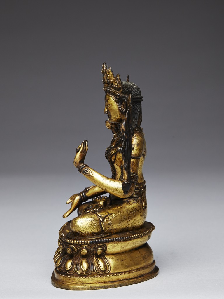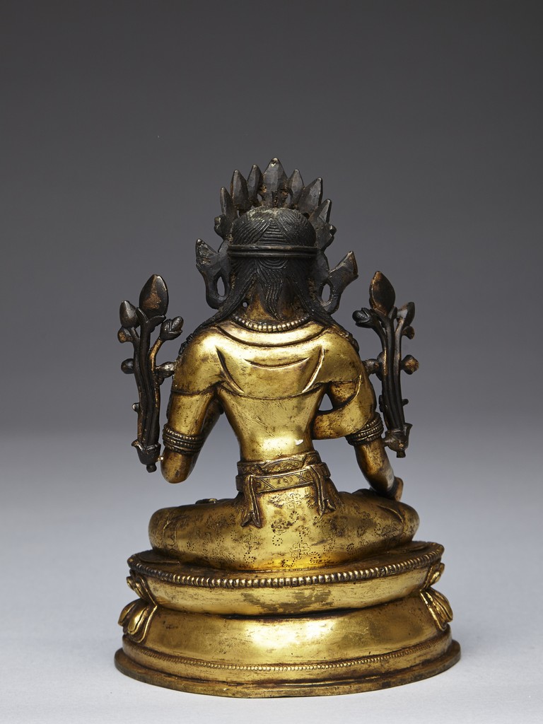 Shown seated in padmasana on double lotus throne,his right hand extended in varada mudra and the left is held in vitarka mudra,body adorned in beaded jewelry and hems incised with floral pattern. His face shown with meditative expression and surmounted with pointed tiara. Qing Dynasty period.