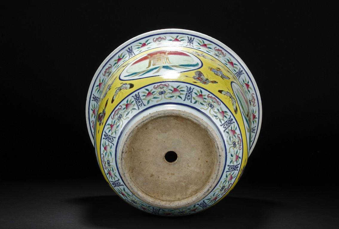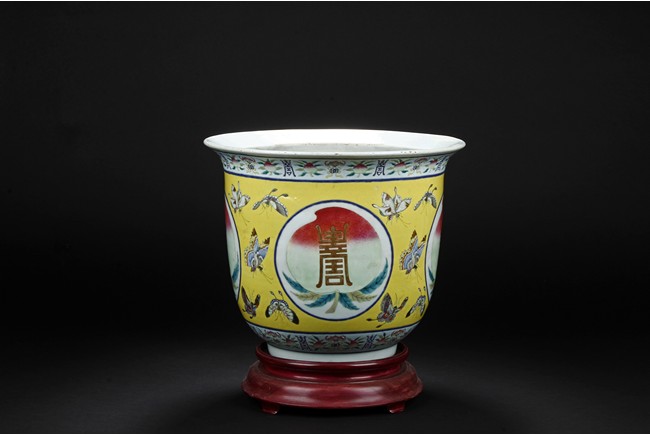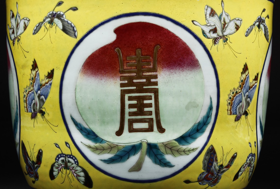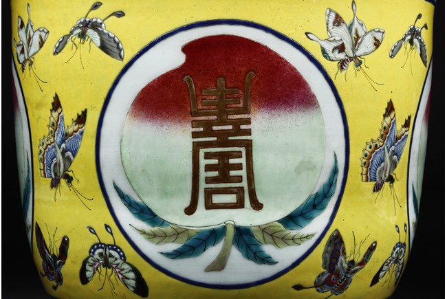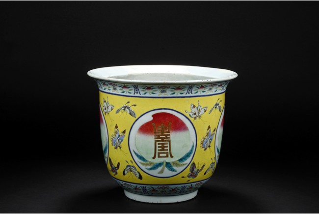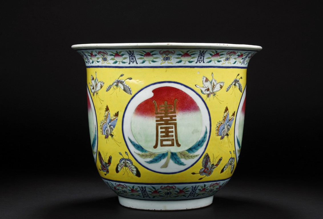 The Jardinière is finely enamelled with roundel panels enclosing a peach with a stylized 'Shou' character in the center,flanked by flying butterflies reserved on yellow ground,with a continuous band of auspicious peach,bat,and 'shou' character below and above. The bottom is unglazed. Qing Dynasty period.