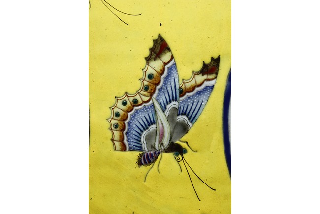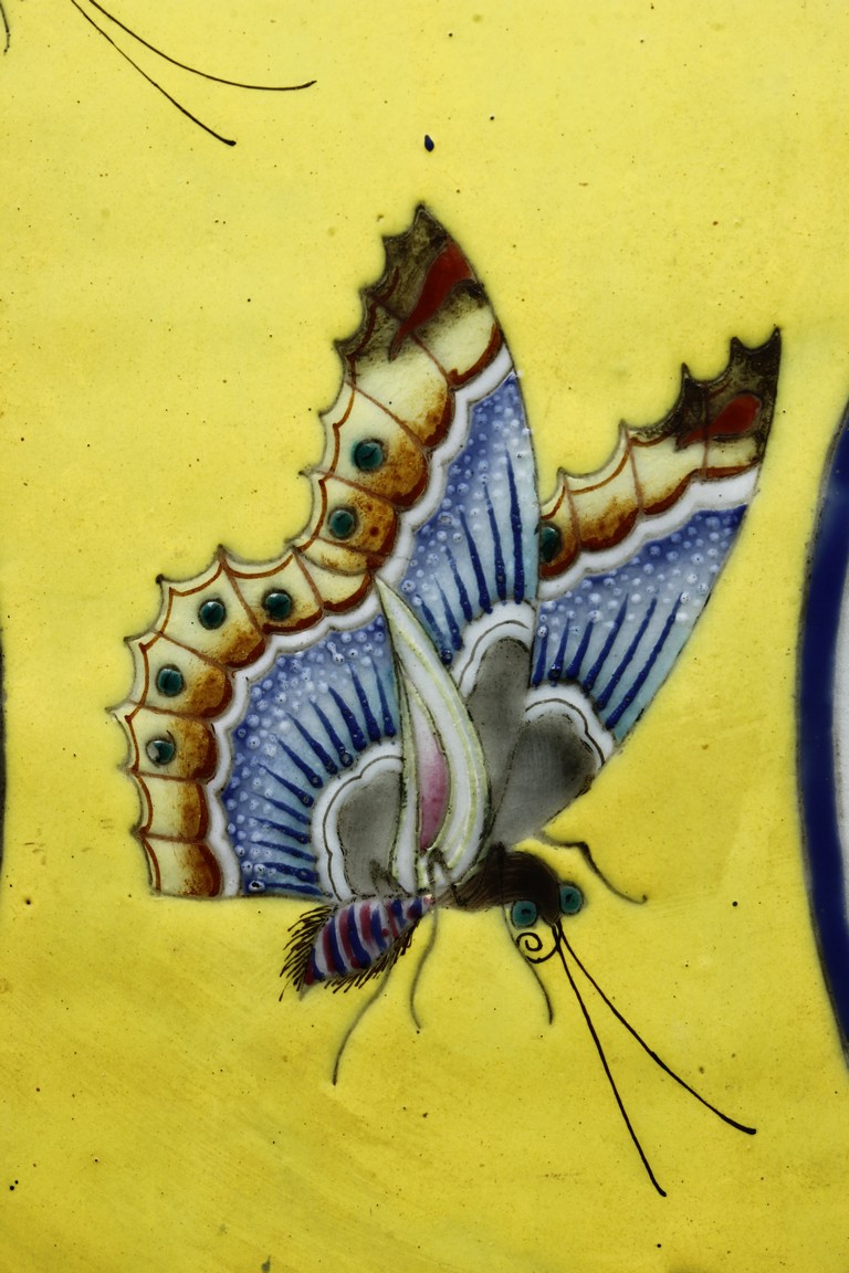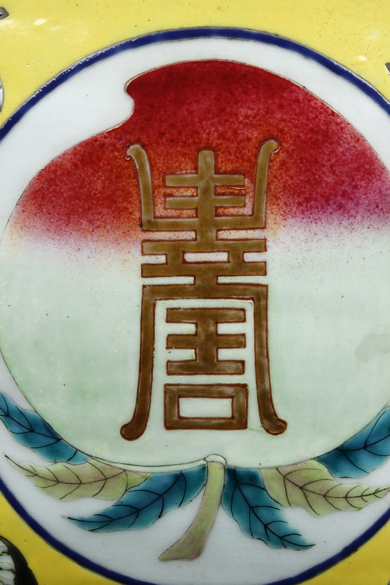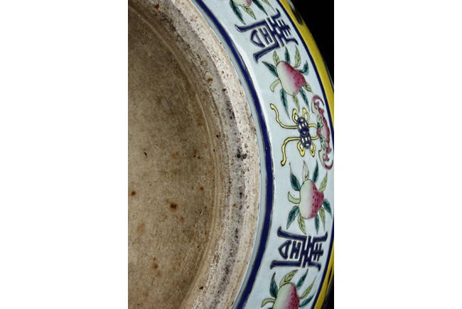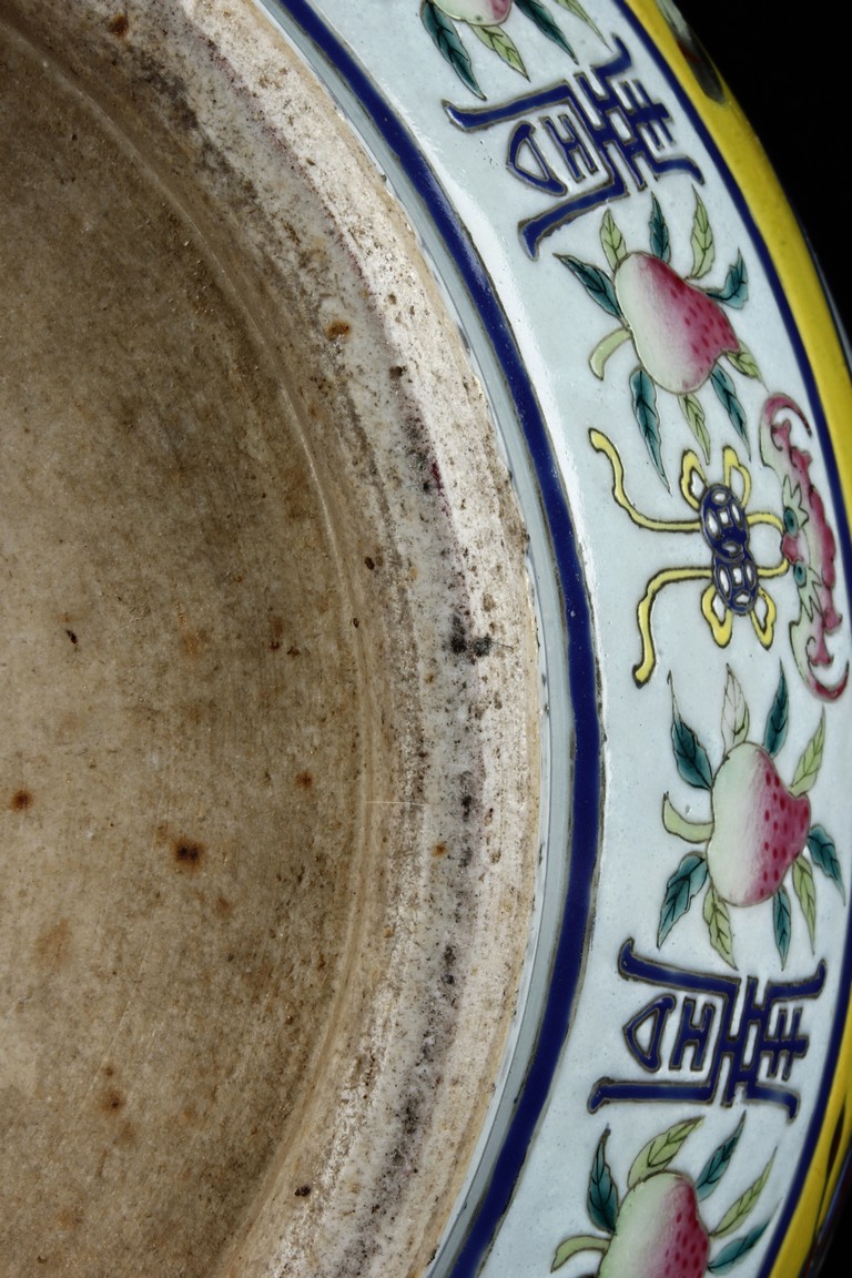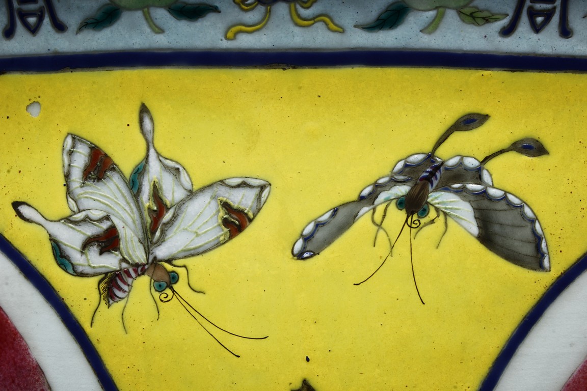 The Jardinière is finely enamelled with roundel panels enclosing a peach with a stylized 'Shou' character in the center,flanked by flying butterflies reserved on yellow ground,with a continuous band of auspicious peach,bat,and 'shou' character below and above. The bottom is unglazed. Qing Dynasty period.