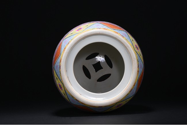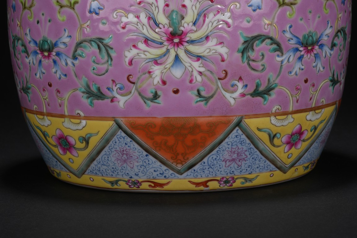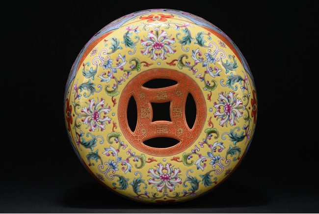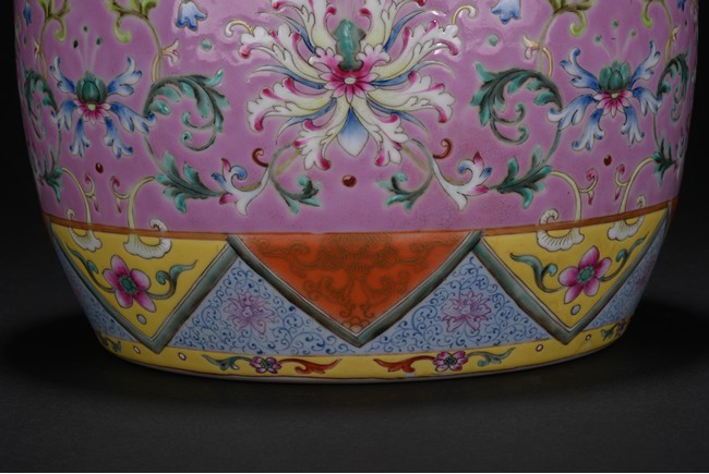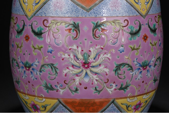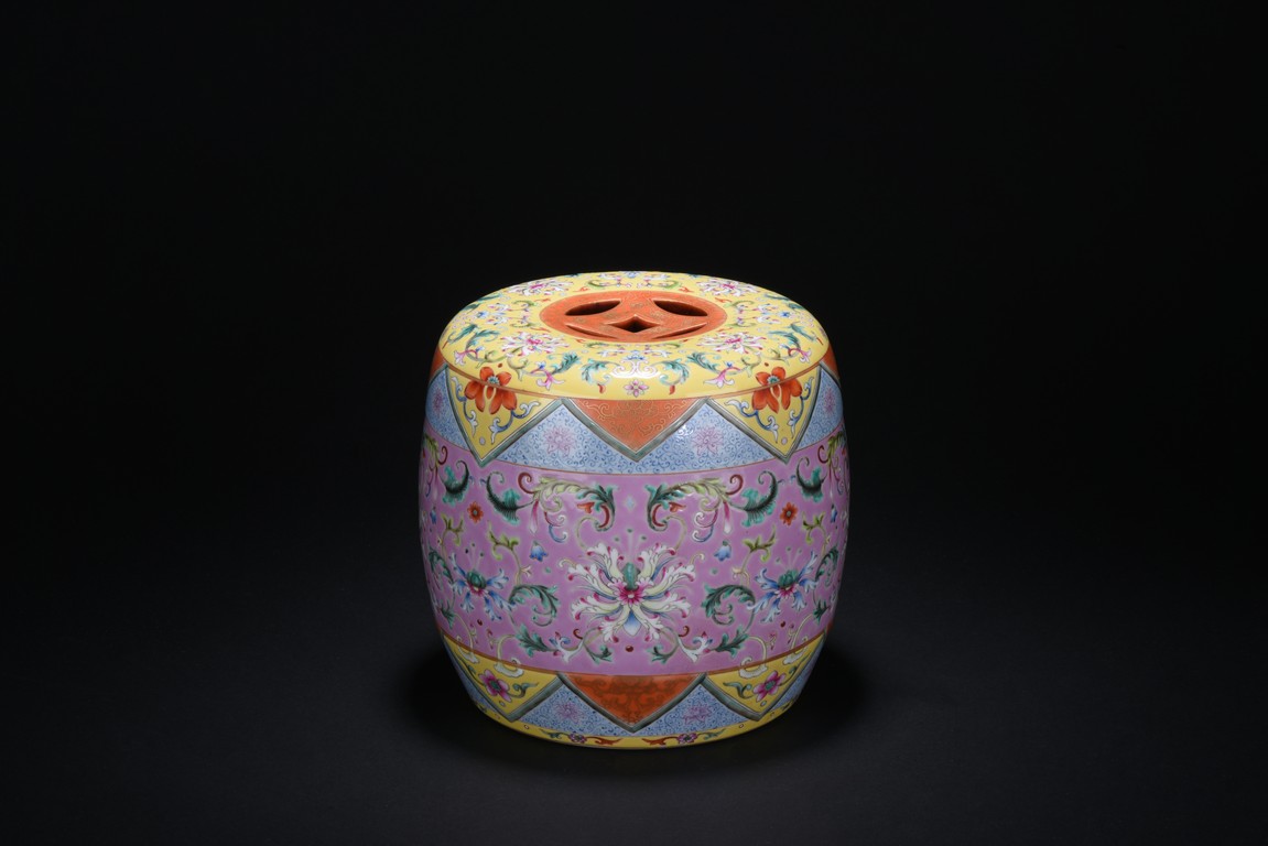 The barrel-shaped stool with a pierced 'coin' motif on the slightly convex top,painted in famille-rose palette with a floral motif of chrysanthemums on a yellow ground draping over the sides terminating in eight triangle pattern enclosed scrolled ruyi or peonies,the body finely enamelled with meandering lotus scrolls reserved on pink ground,close to the base with the similar triangle pattern to the stool top rim. Qing Dynasty period.