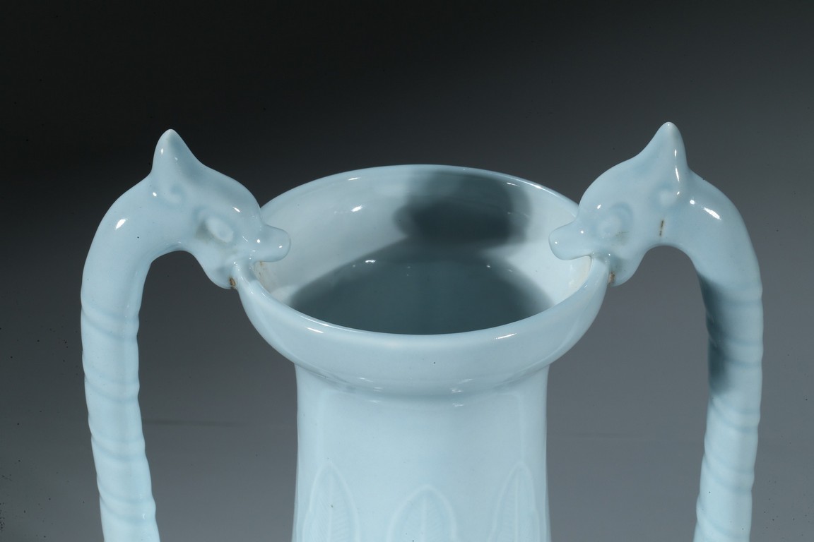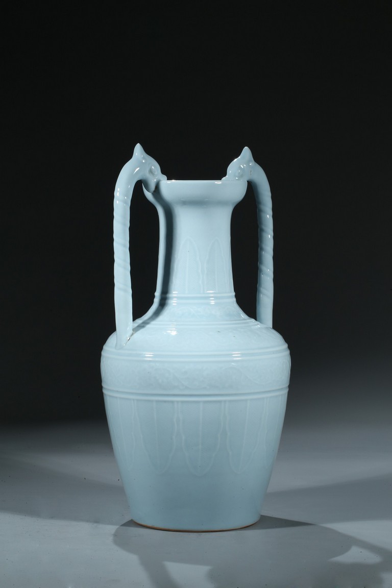 The baluster body is moulded with three sets of lotus foliate scrolls bands, all above a band of stiff lappets, the shoulder set with a pair of handles rising to the dragon-head terminal which bites the cup-shaped mouth, covered overall with an even glaze of soft sky blue tone thinning on the extremities, the underside inscribed with six character Yongzheng mark. Qing Dynasty period.