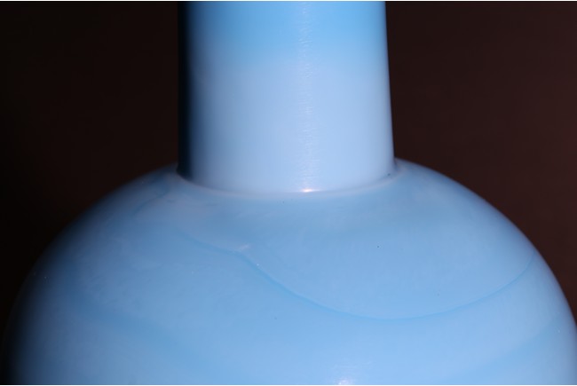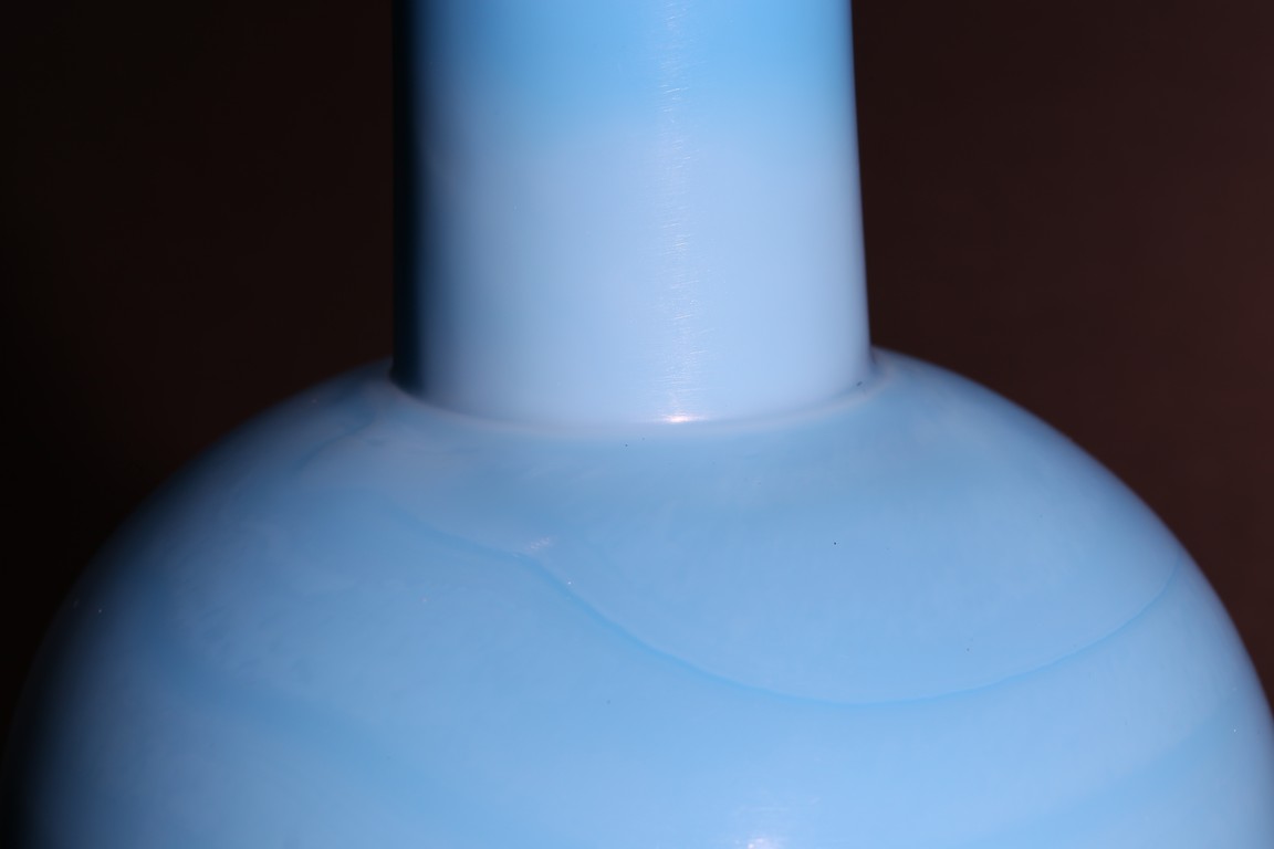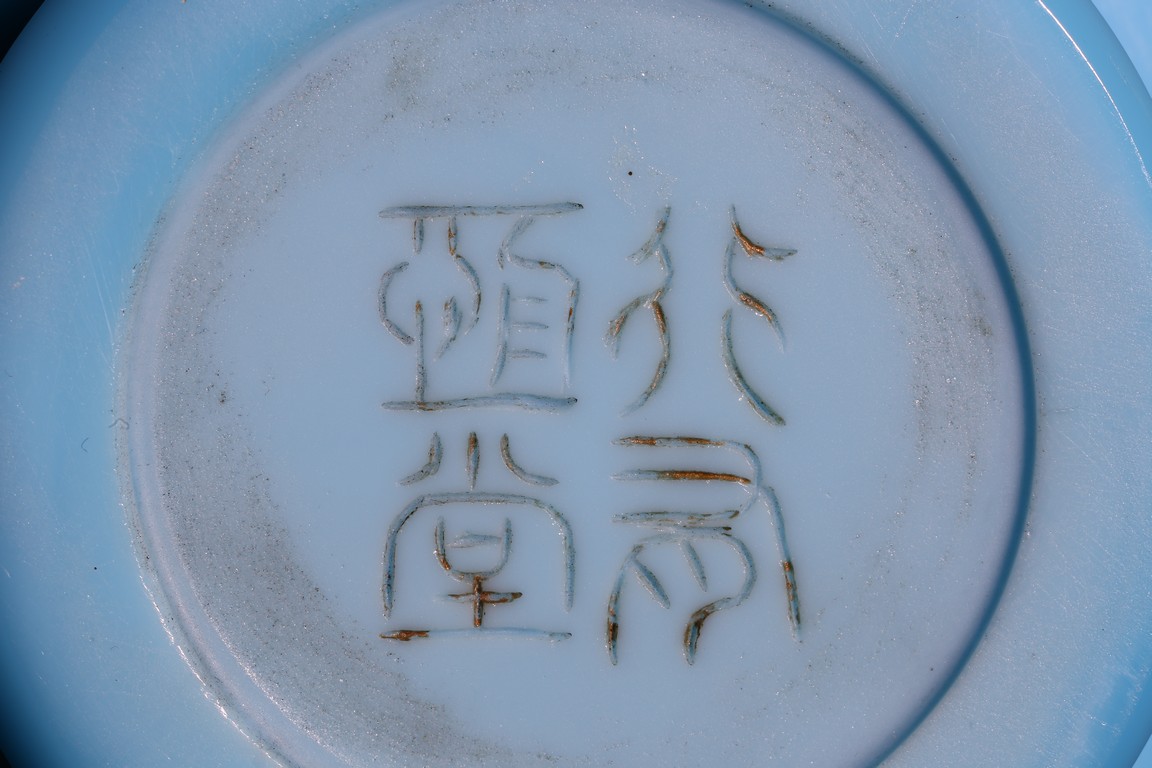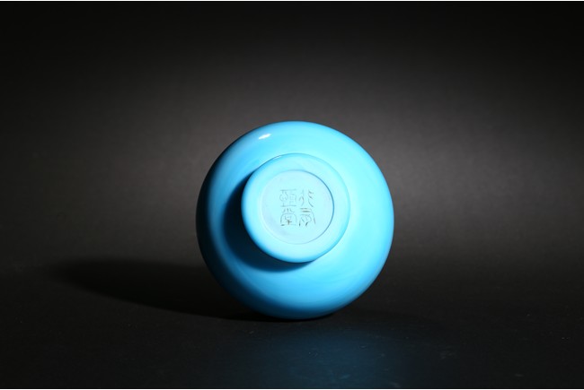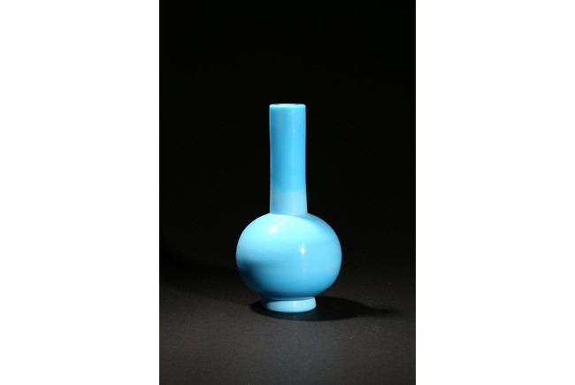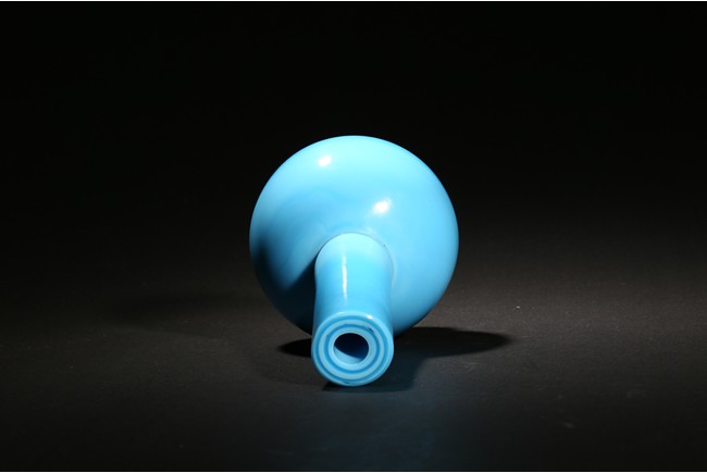 Of lobular form with a tall,tubular neck and raised on a circular foot ring,the glass is of opaque sky-blue tone,the base with a four-character Xing You Heng Tang mark. Qing Dynasty period.