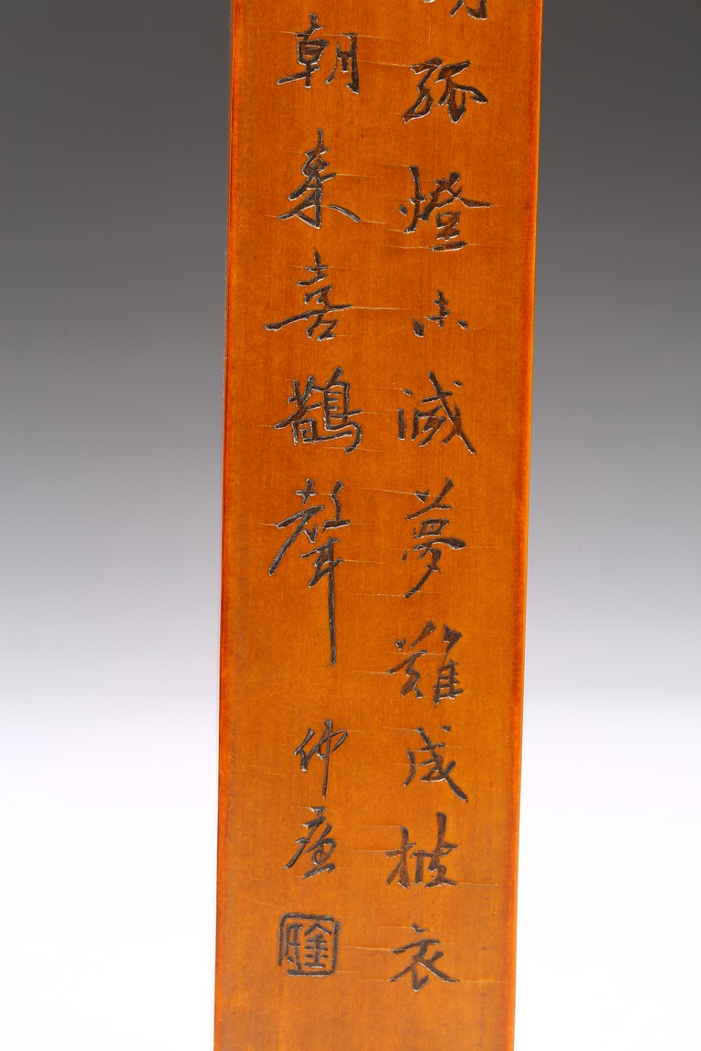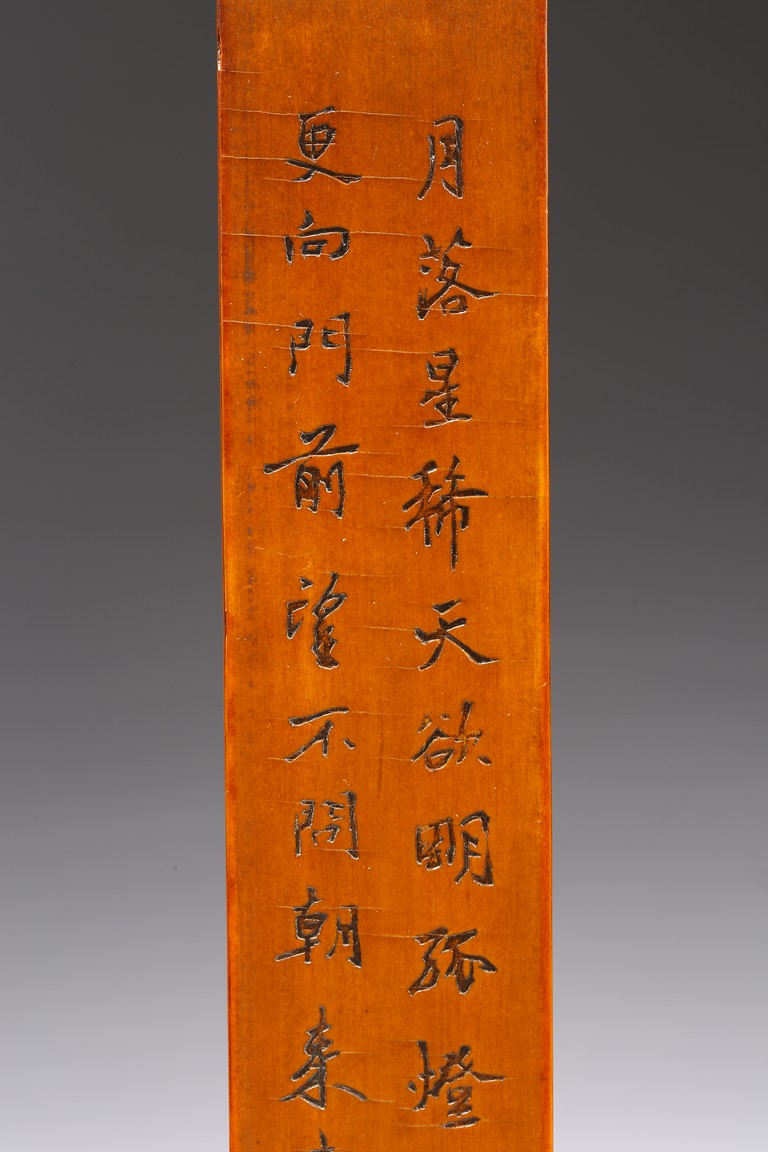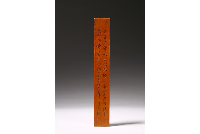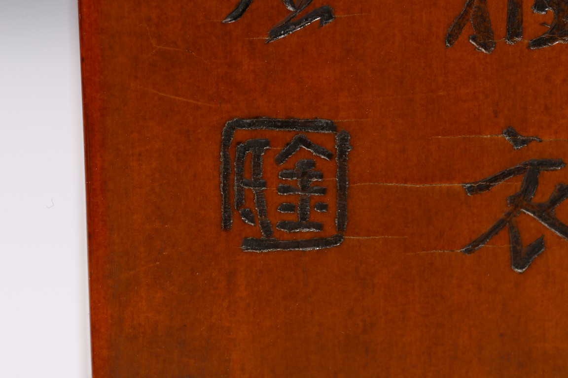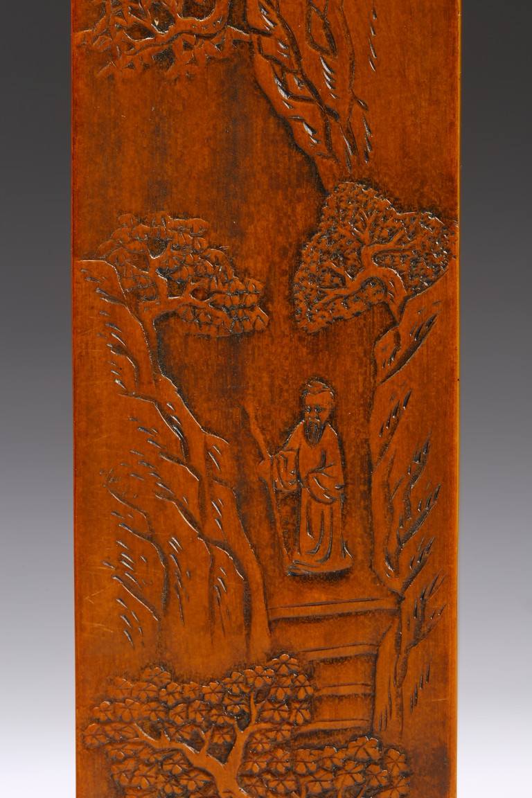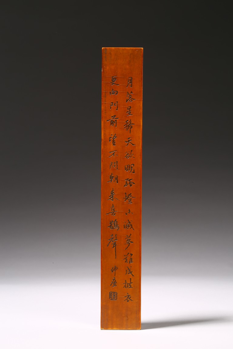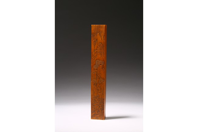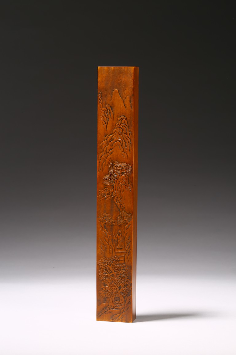 Of rectangular form, one side carved in relief with an elderly figure in a deep mountain landscape setting, the reverse inscribed with poetic inscriptions. Qing Dynasty period.