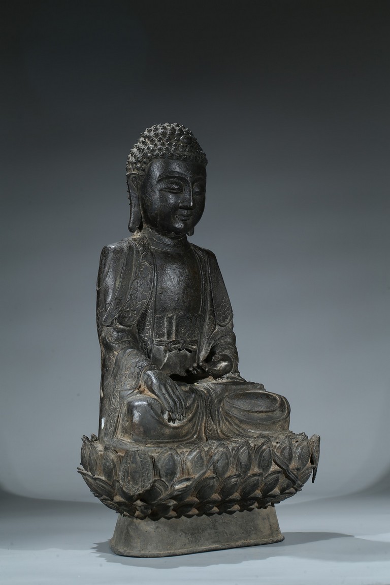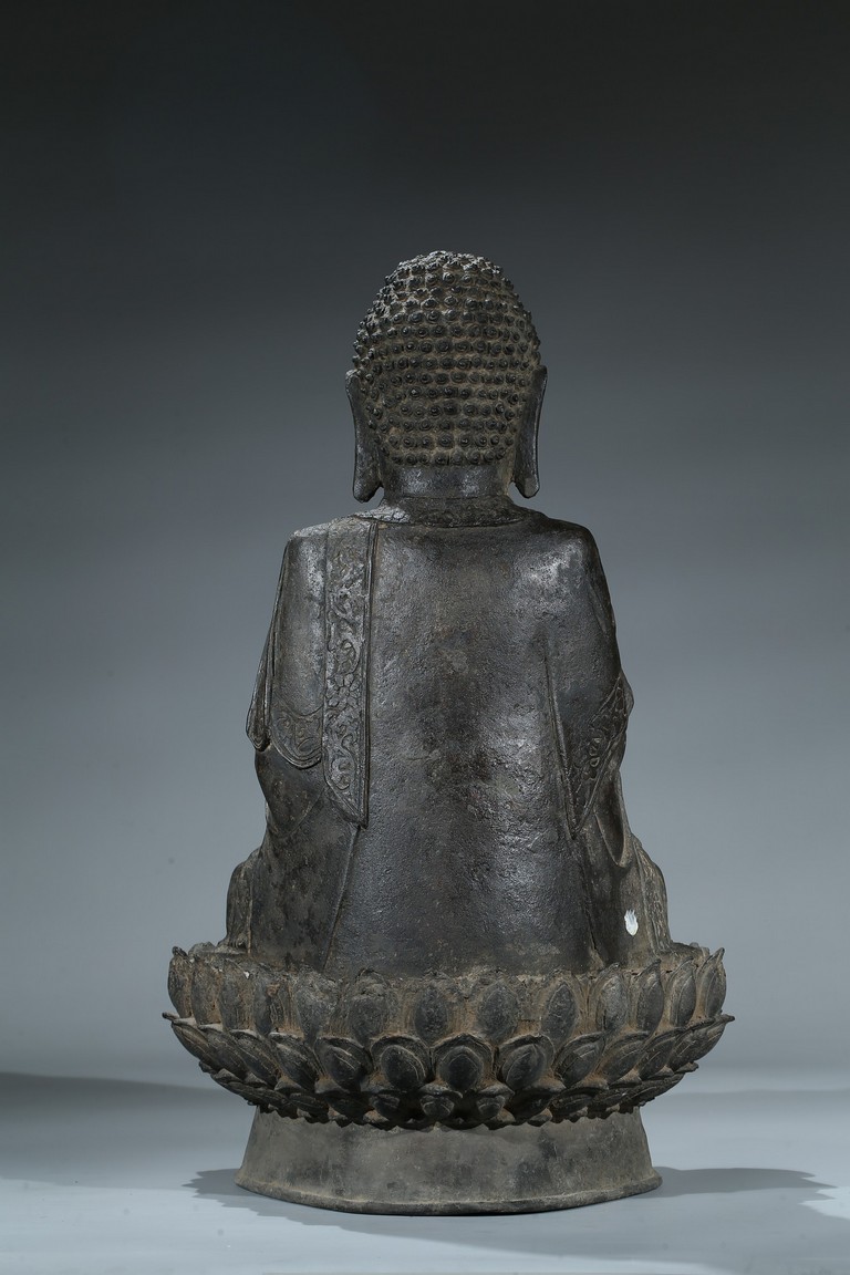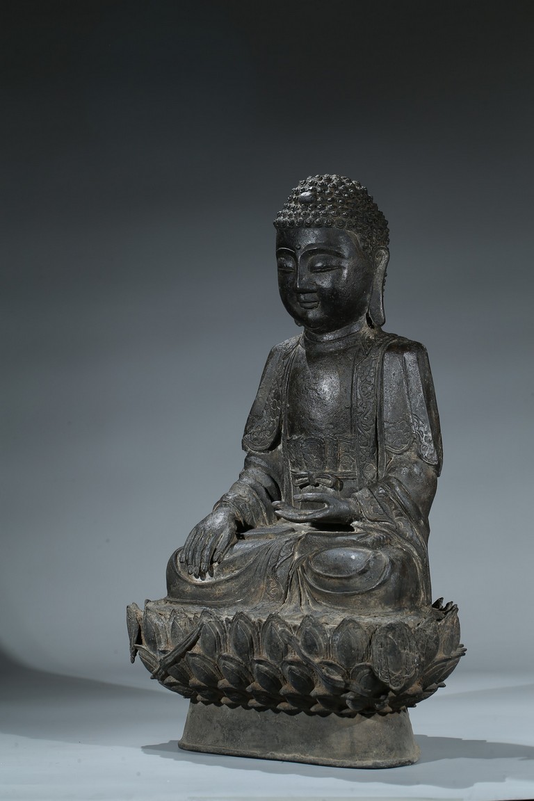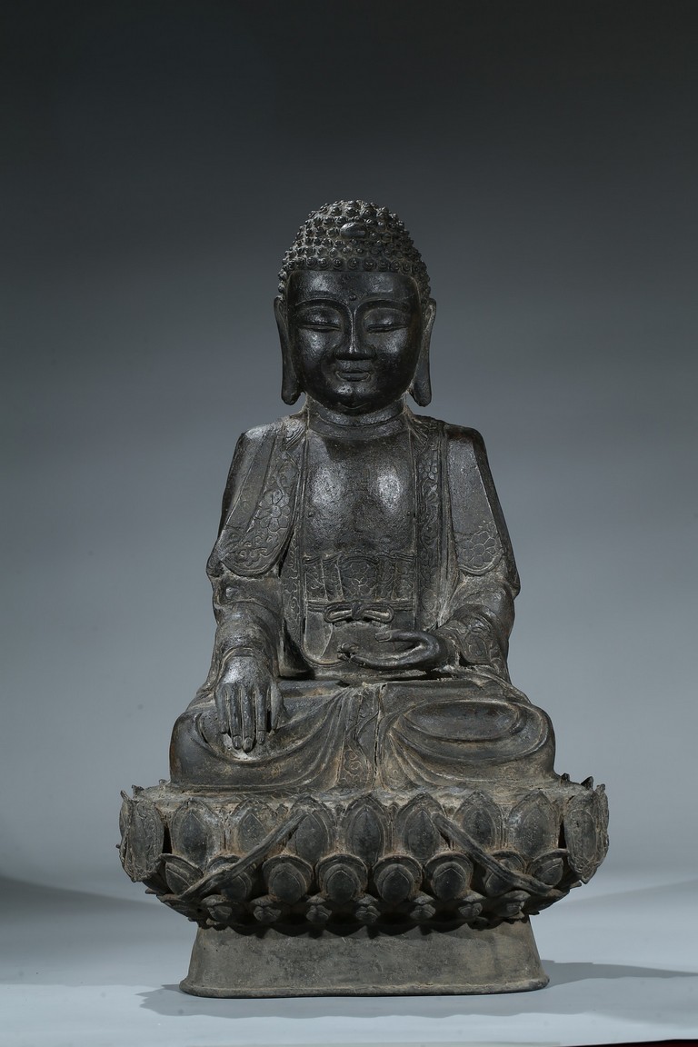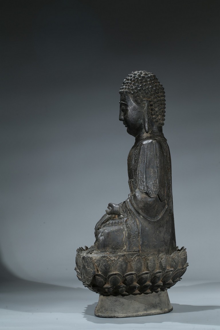seated in dhyanasana with hands in bhumisparsa- and avakasha mudra, the robes chased with floral borders, the head and ushnisha covered with tight curls above an urna centering the forehead, all supported on an associated lotus throne. Ming Dynasty period.
