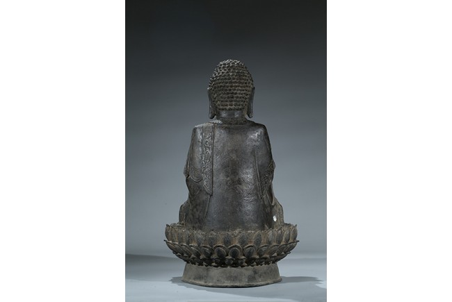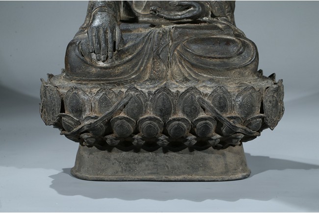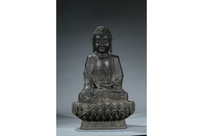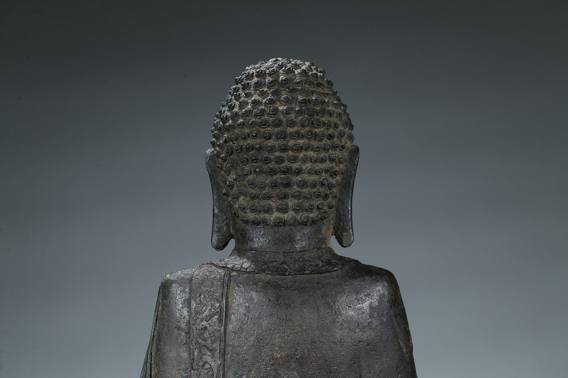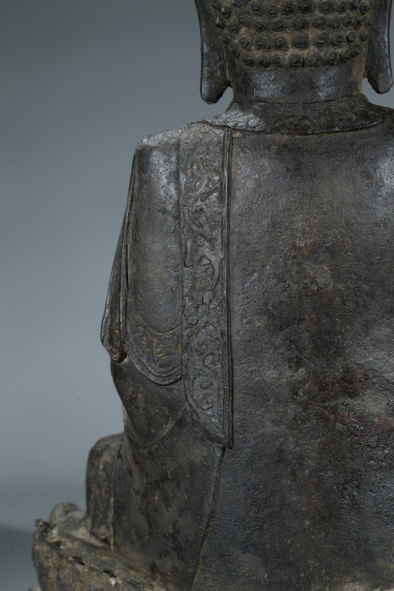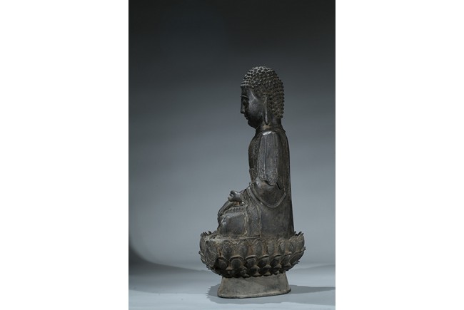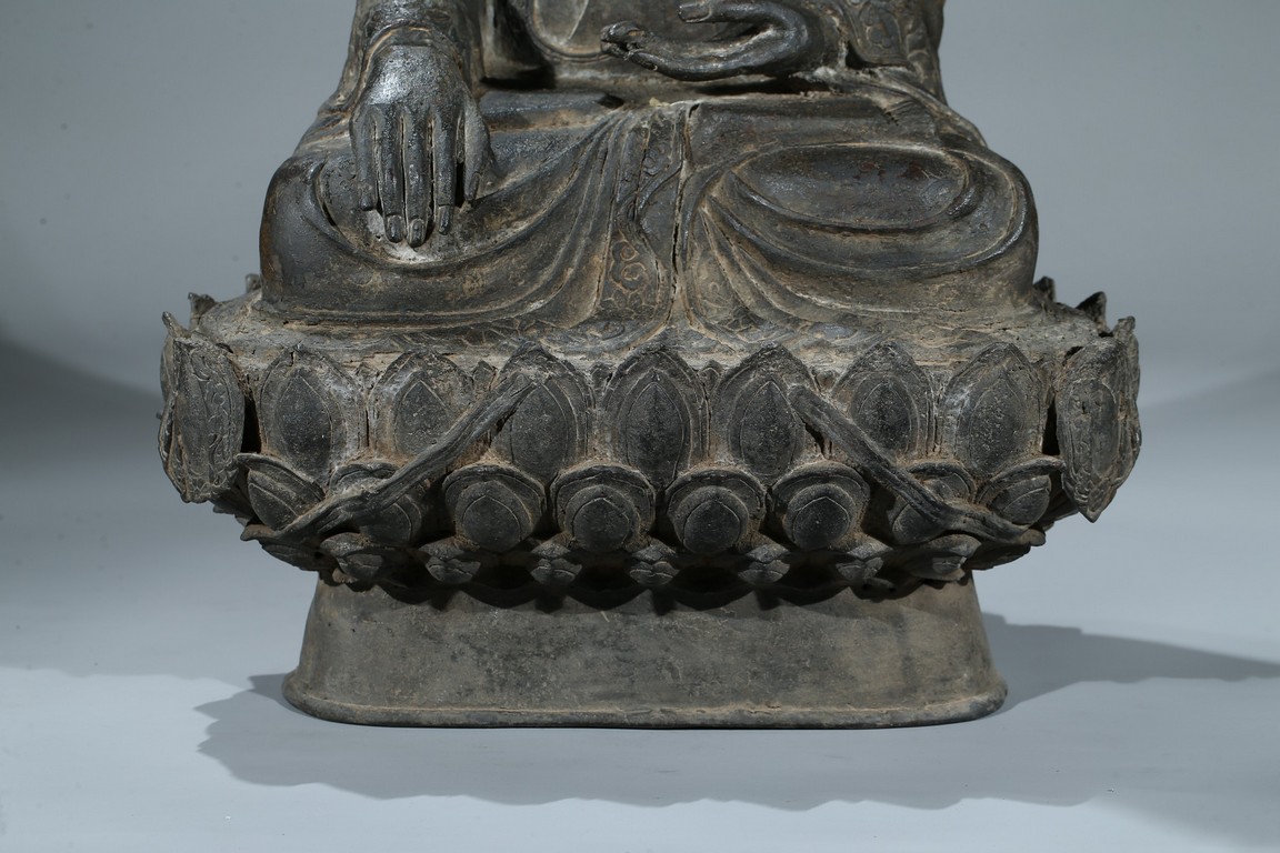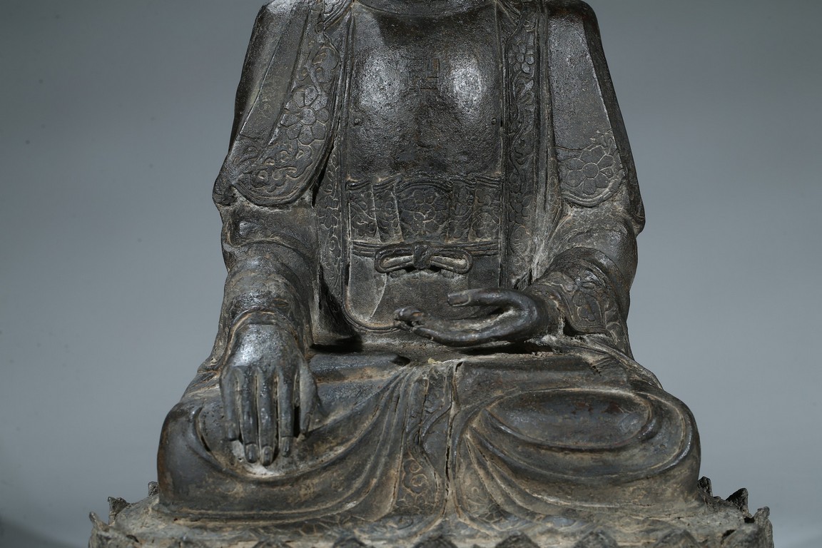 seated in dhyanasana with hands in bhumisparsa- and avakasha mudra, the robes chased with floral borders, the head and ushnisha covered with tight curls above an urna centering the forehead, all supported on an associated lotus throne. Ming Dynasty period.