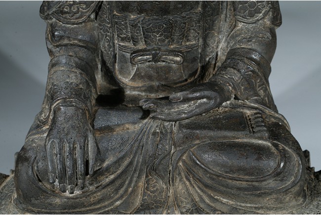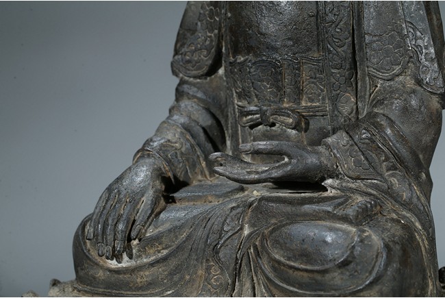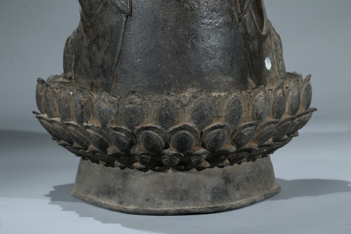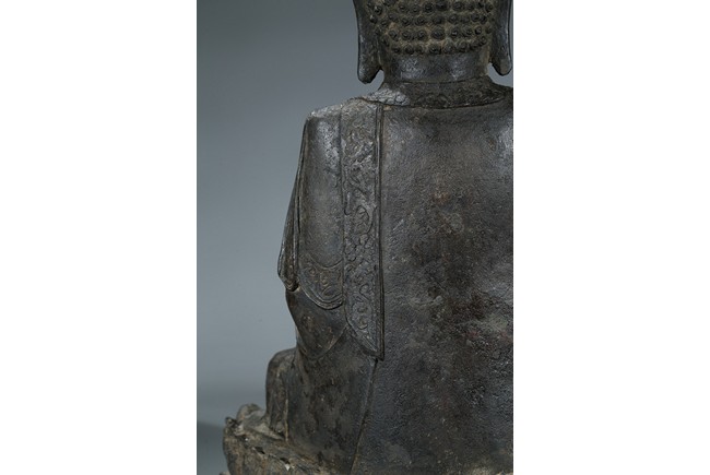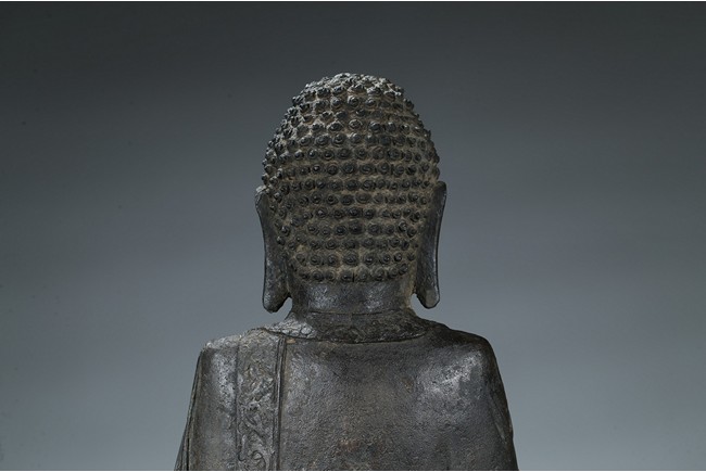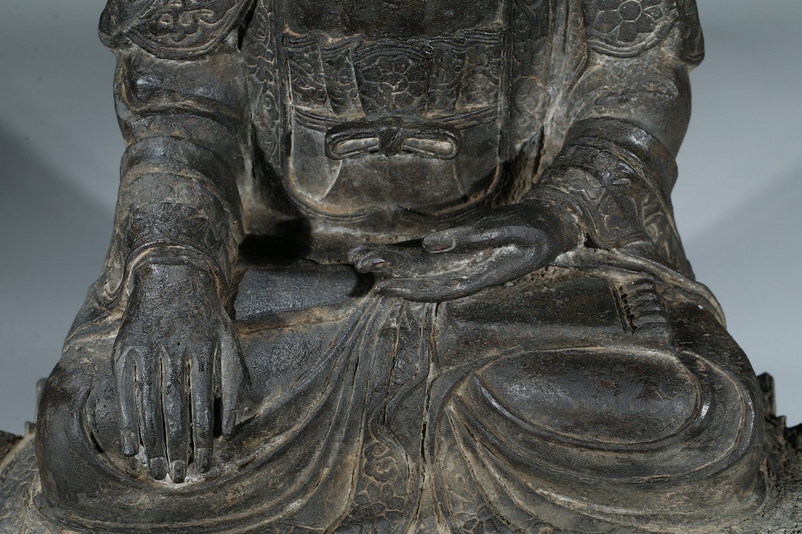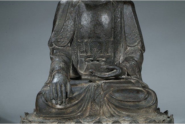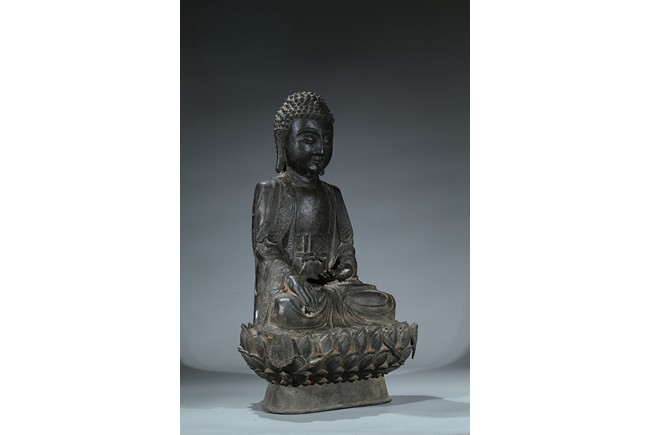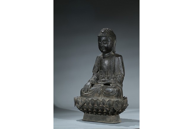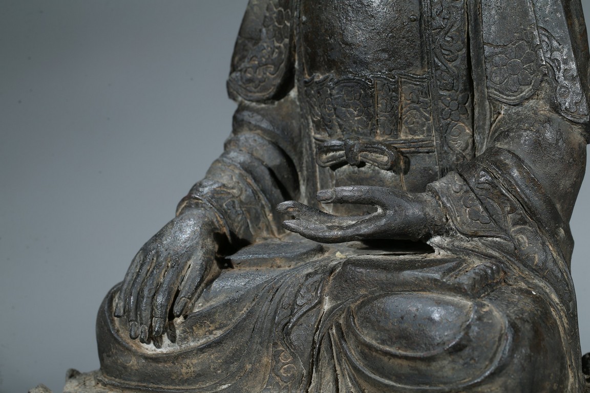 seated in dhyanasana with hands in bhumisparsa- and avakasha mudra, the robes chased with floral borders, the head and ushnisha covered with tight curls above an urna centering the forehead, all supported on an associated lotus throne. Ming Dynasty period.
