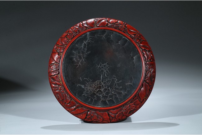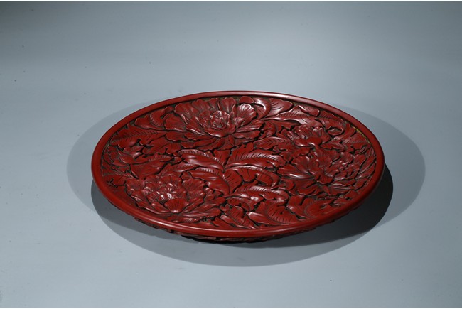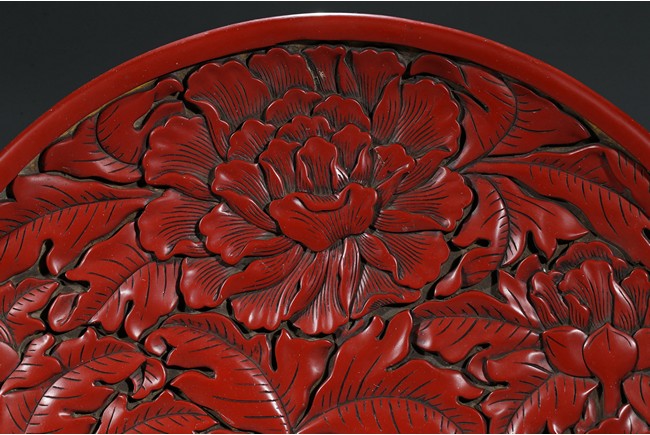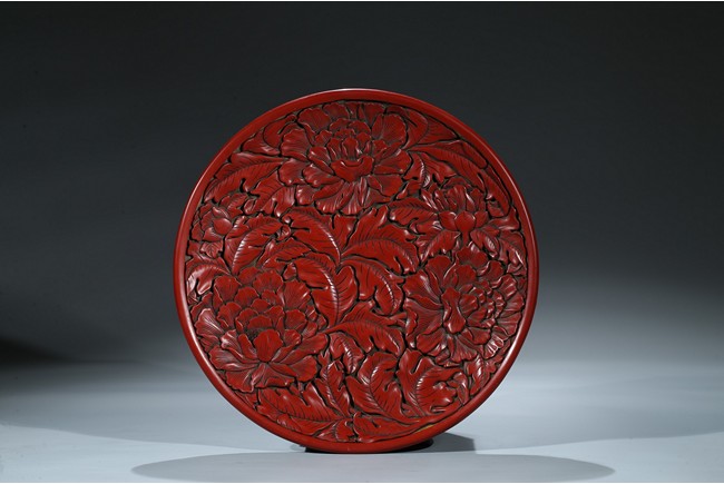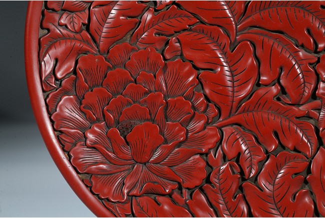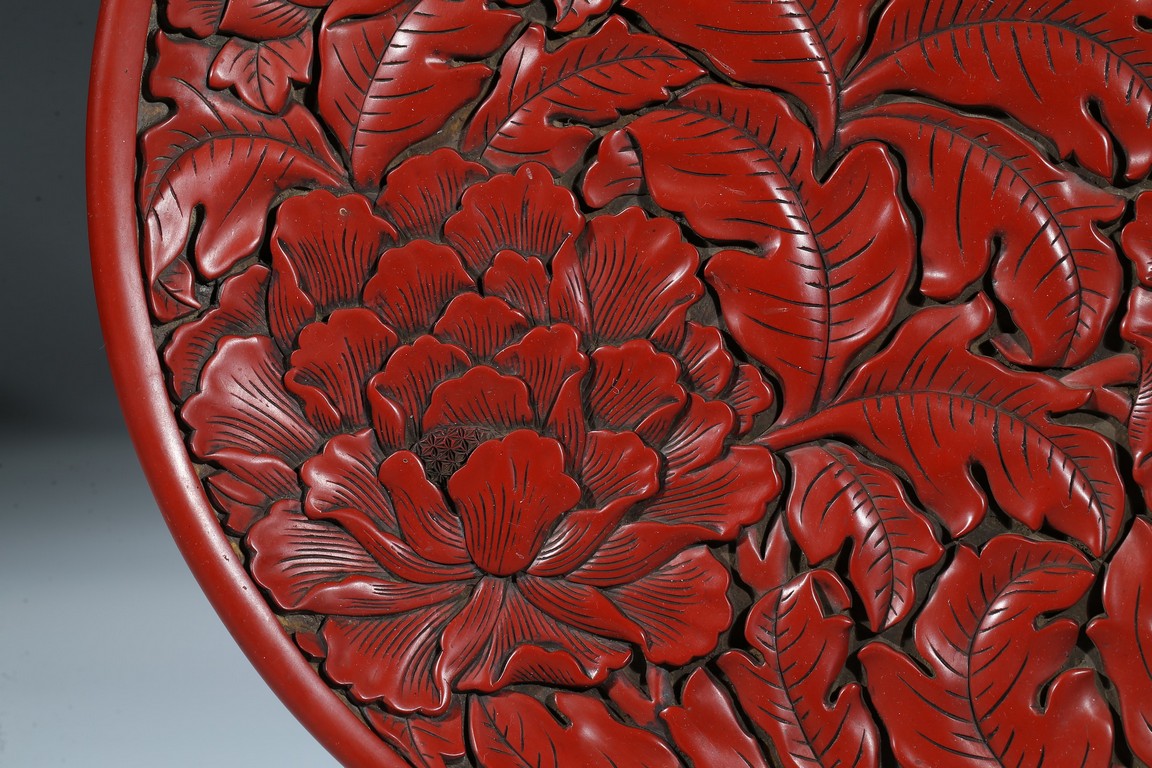 "“剔紅”又稱為“雕紅漆”或“紅雕漆”,是中國漆器工藝的一種,此技法成熟於宋元時期,發展於明清兩代。常以木灰為胎,在胎骨上層層髹紅漆,少則幾十層、多達上百層,待半幹時描上畫稿,然後再雕刻花紋。花紋隱起、華美富麗。形制有圓盒、長方盒、圓盤、八方盤、葵瓣盤、樽等,以盤、盒居多。裝飾圖案有花卉、山水、人物和花鳥等。明曹昭《格古要論·古漆器論·剔紅》有雲:“剔紅器皿無新舊,但看似厚色鮮紅潤堅重者為好,剔劍環香草者尤佳。” 此牡丹紋大盤為圓形木胎,漫淺式,圈足。盤內外皆朱漆素地上雕牡丹花紋,花大葉肥,刀法圓熟,藏鋒不露,質樸有力,流暢的線條讓大盤更加多了富貴之氣。盤背後邊緣也為牡丹錦花,圈足內髹黑漆。如此大件作品在元代漆器中能屆指稱其為傑作。""可參考香港佳士得 2017年5月 拍品號3229 成交價625,000港幣。" Compare a recent sale of a similar cinnabar lacquer charger, sold in Christie’s Hong Kong on May 31, 2017, Lot 3229, for HKD 625,000