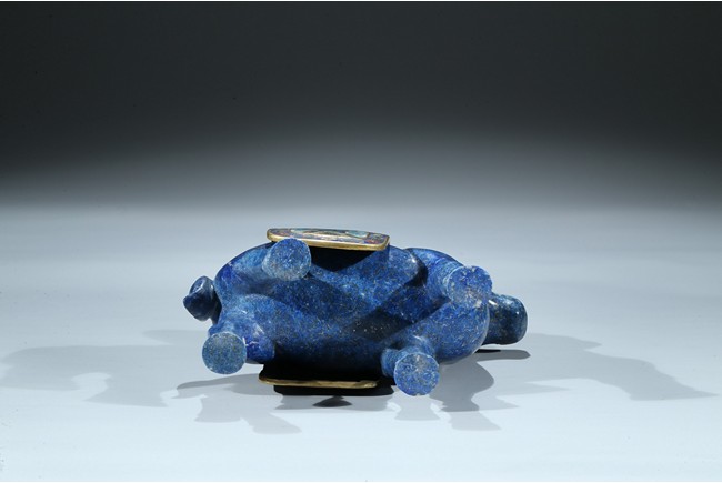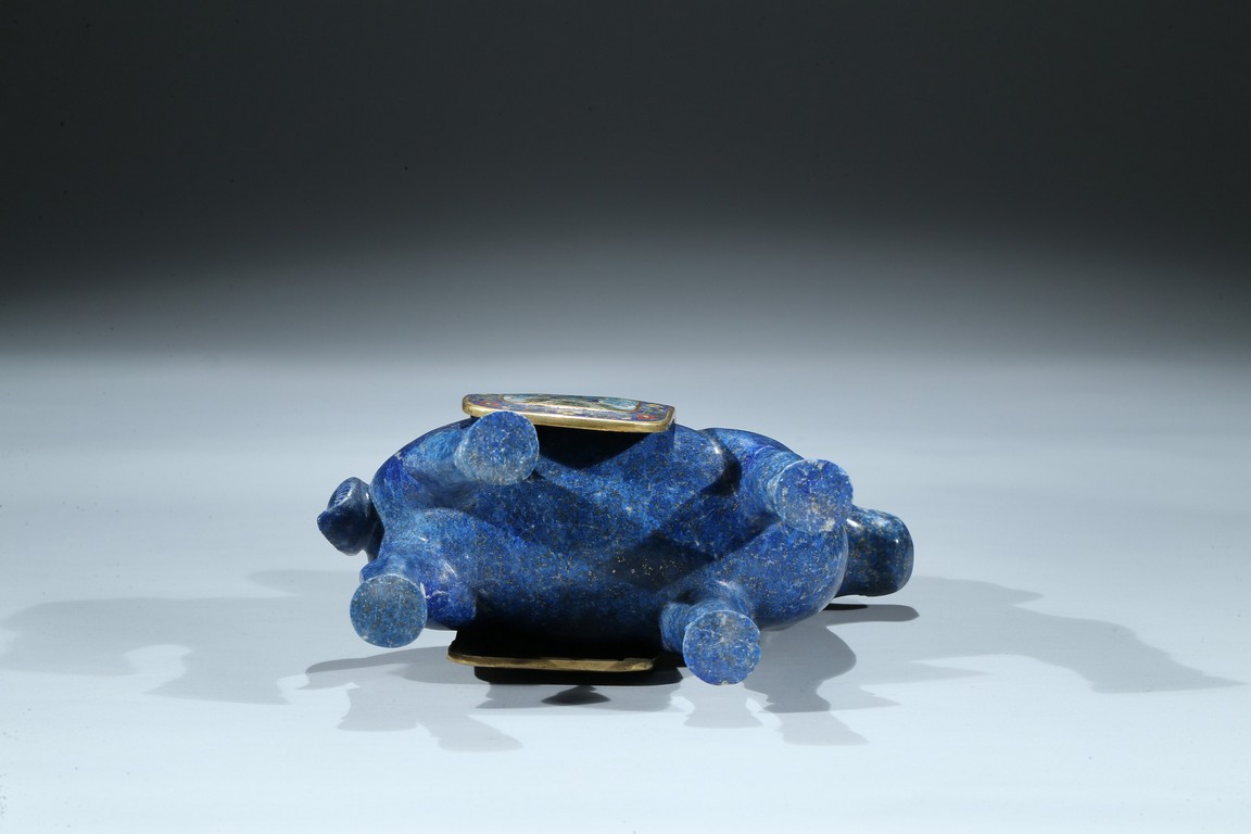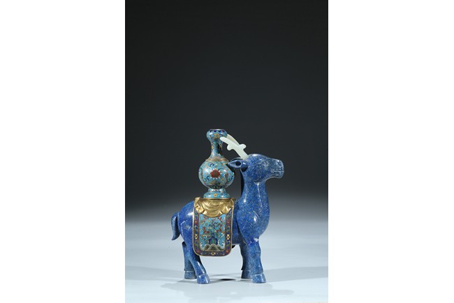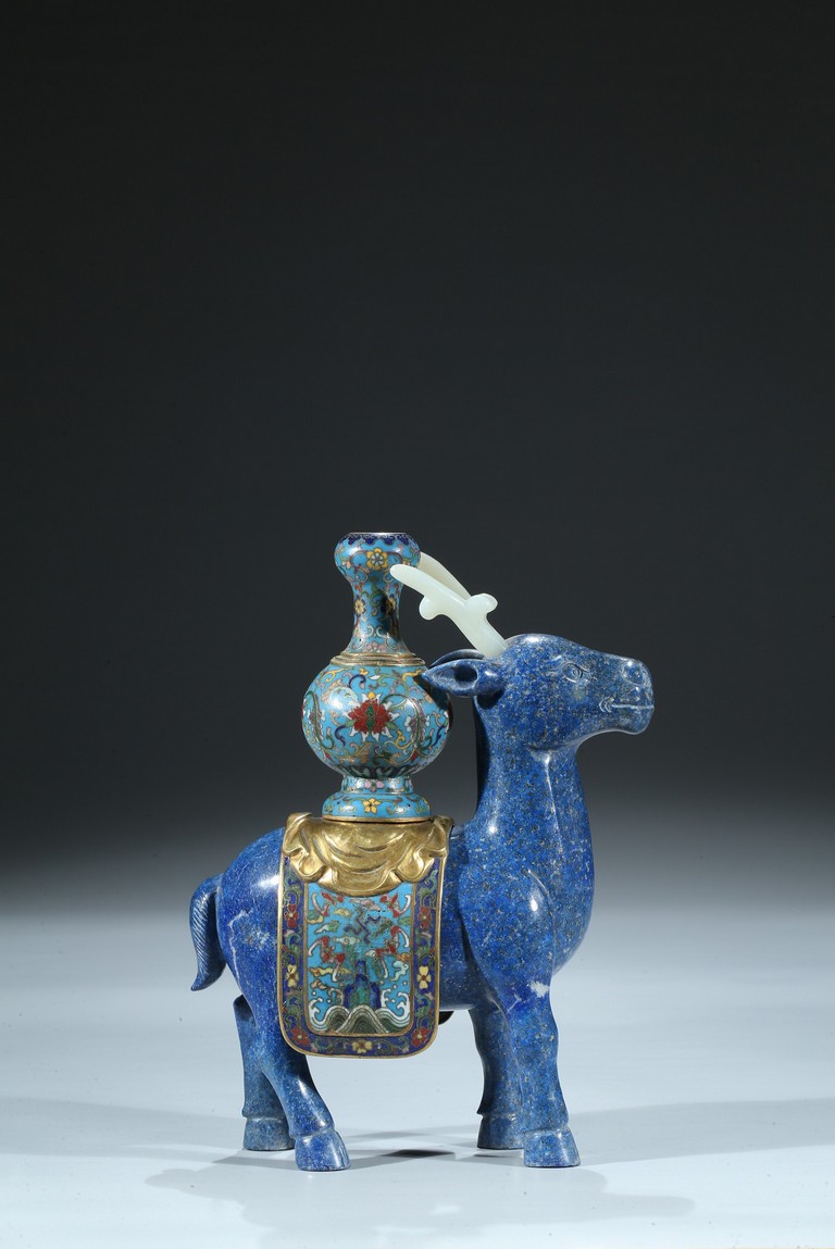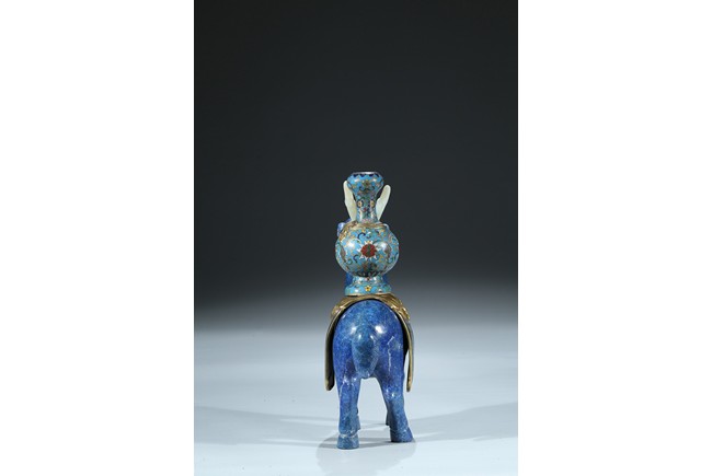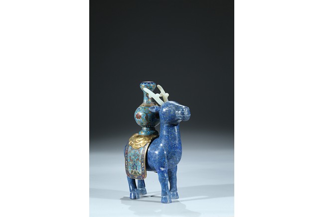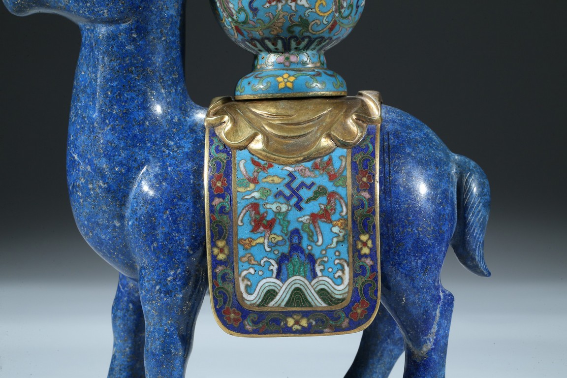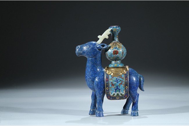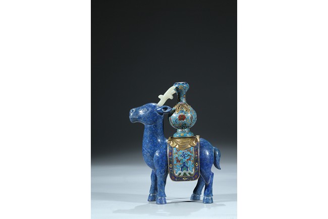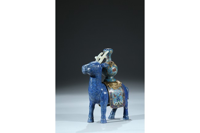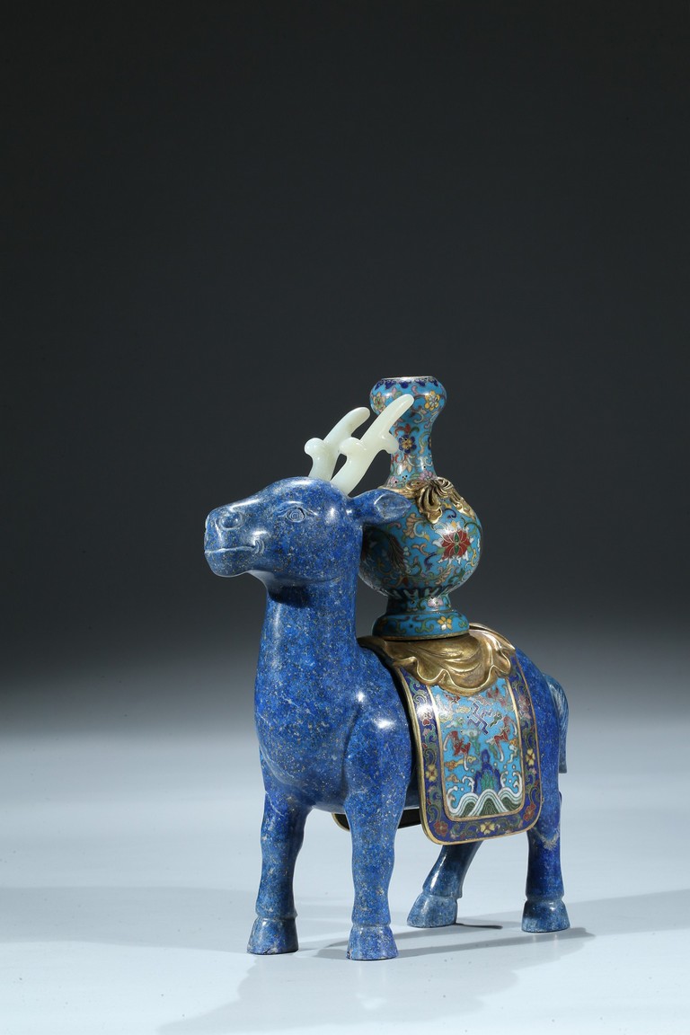 The deer is shown standing foursquare with head raised and white jade horns, its back draped with cloisonne enamel saddle blanket supporting a cloisonne enamel vase.