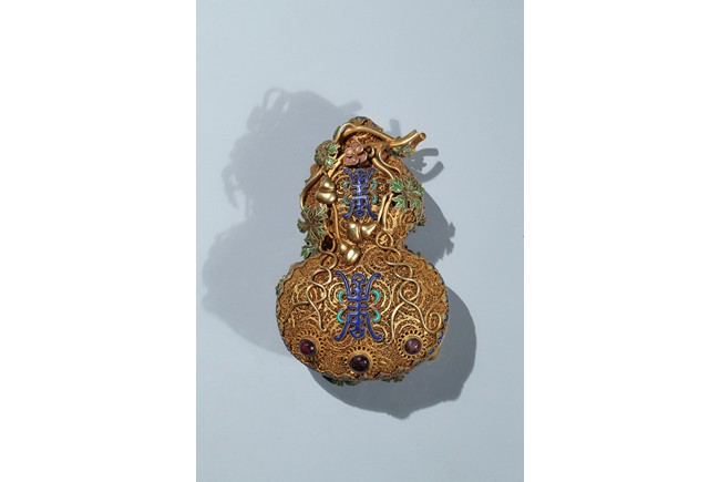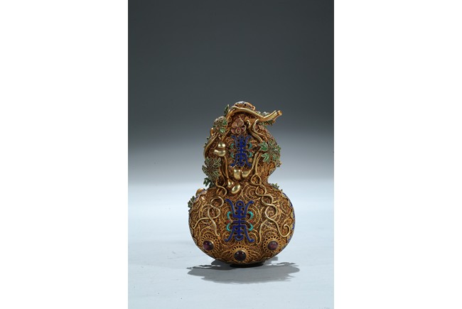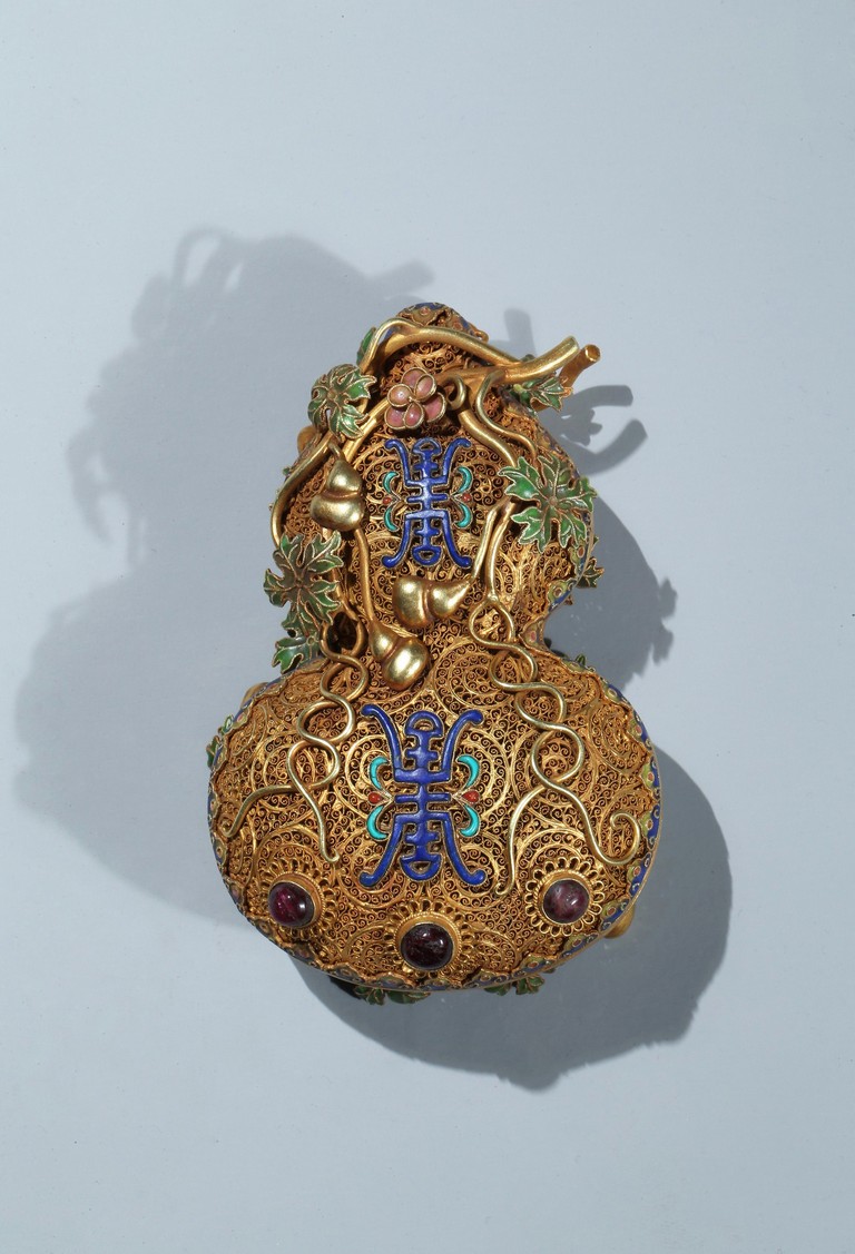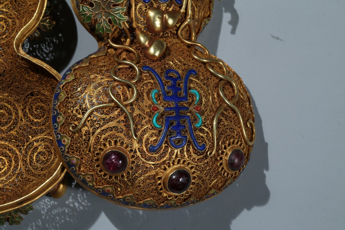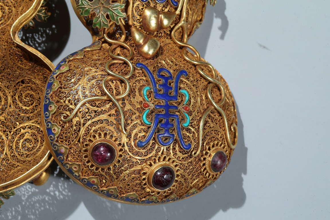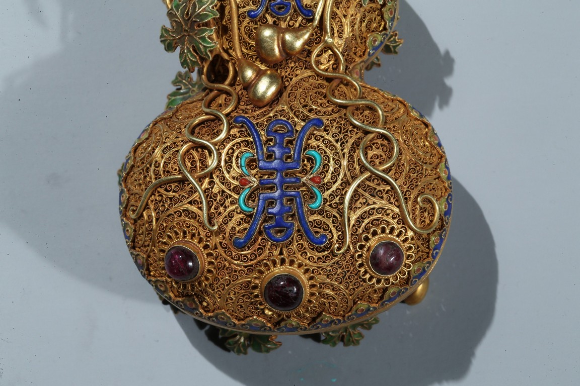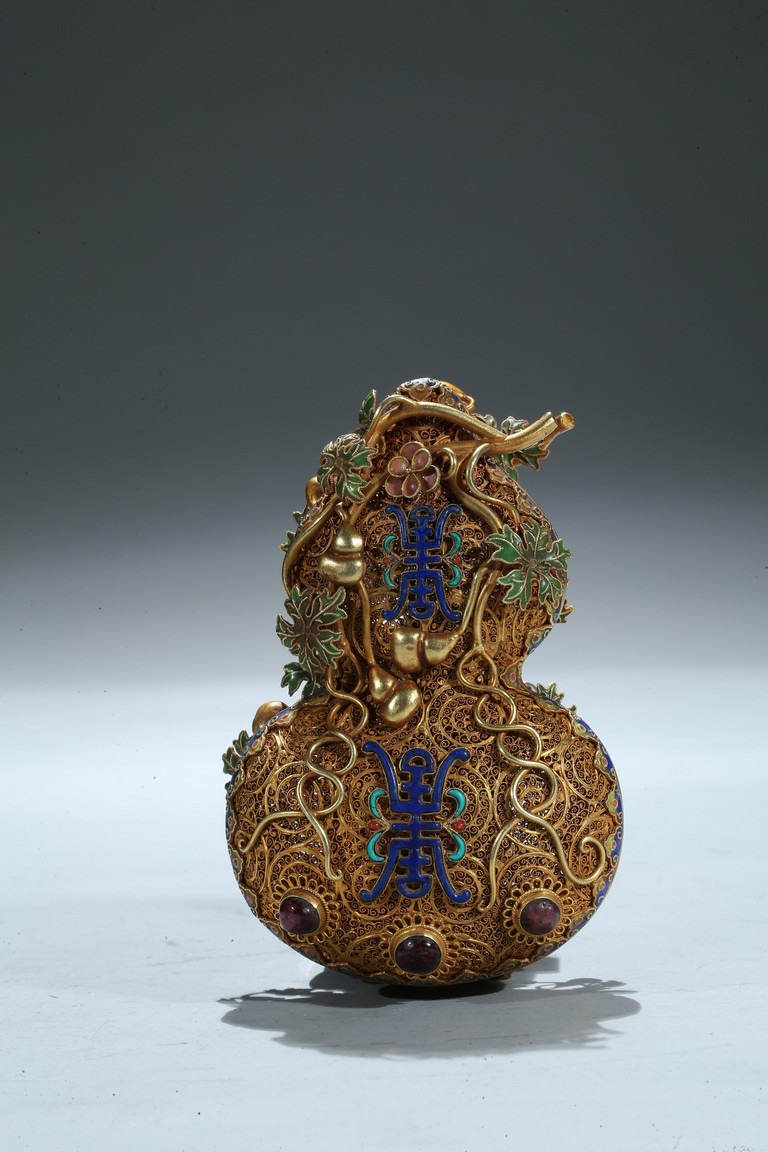 The double gourd is delicately modelled in gold wire as ground, the exterior finely inlaid with gems and enamels of various tones, including turquoise, lapis lazuli, agate, and tourmaline, to form two stylized shou character and smaller gourds borne on meandering stems. Qing Dynasty period.