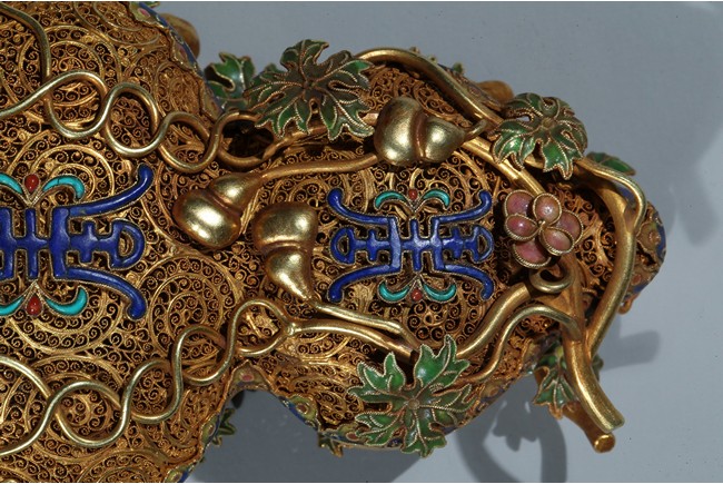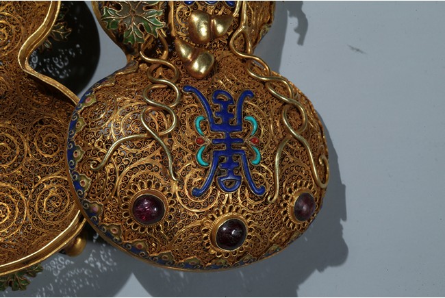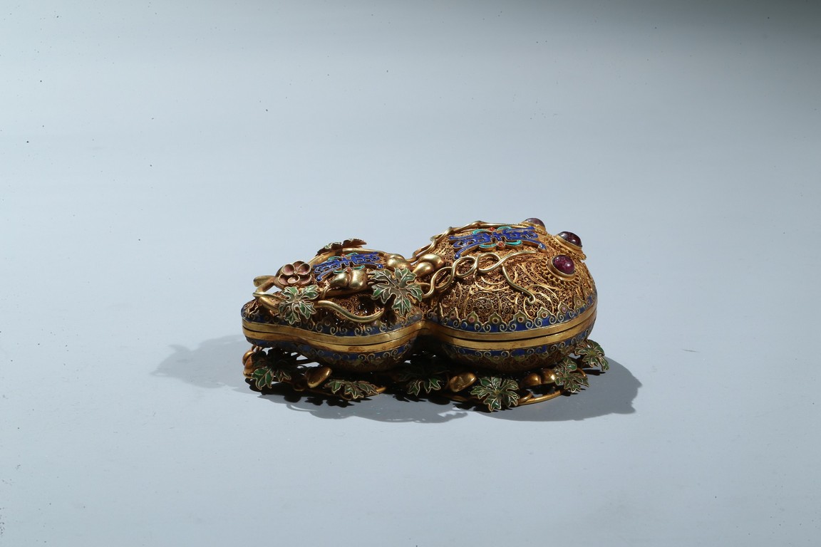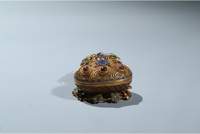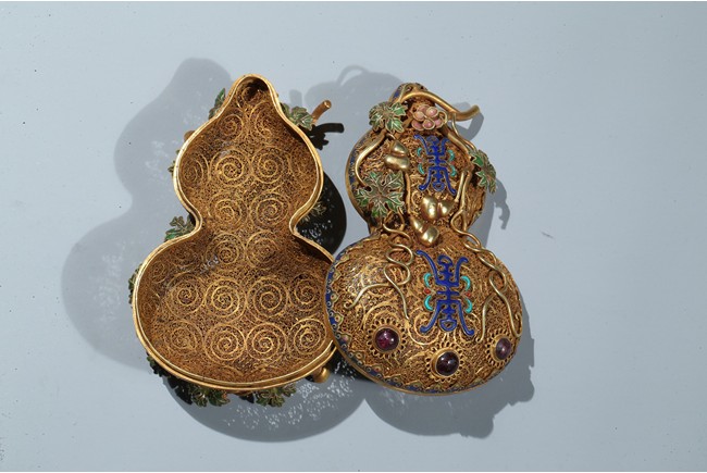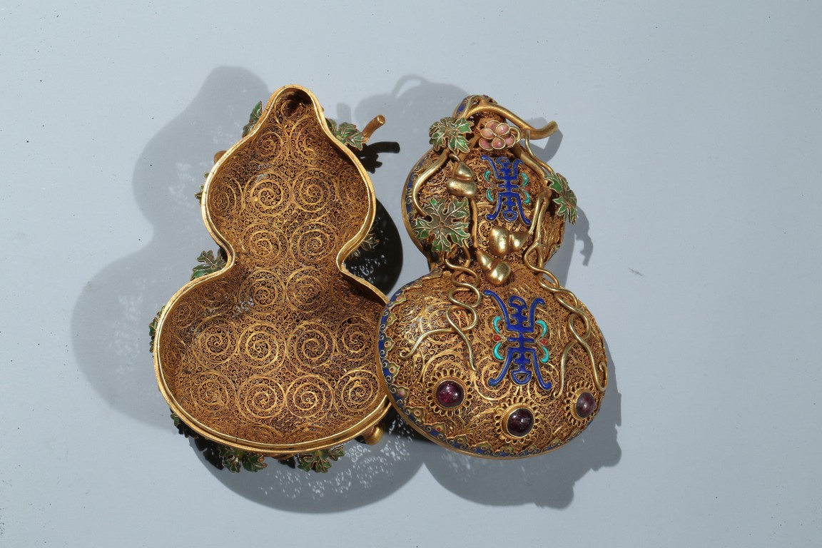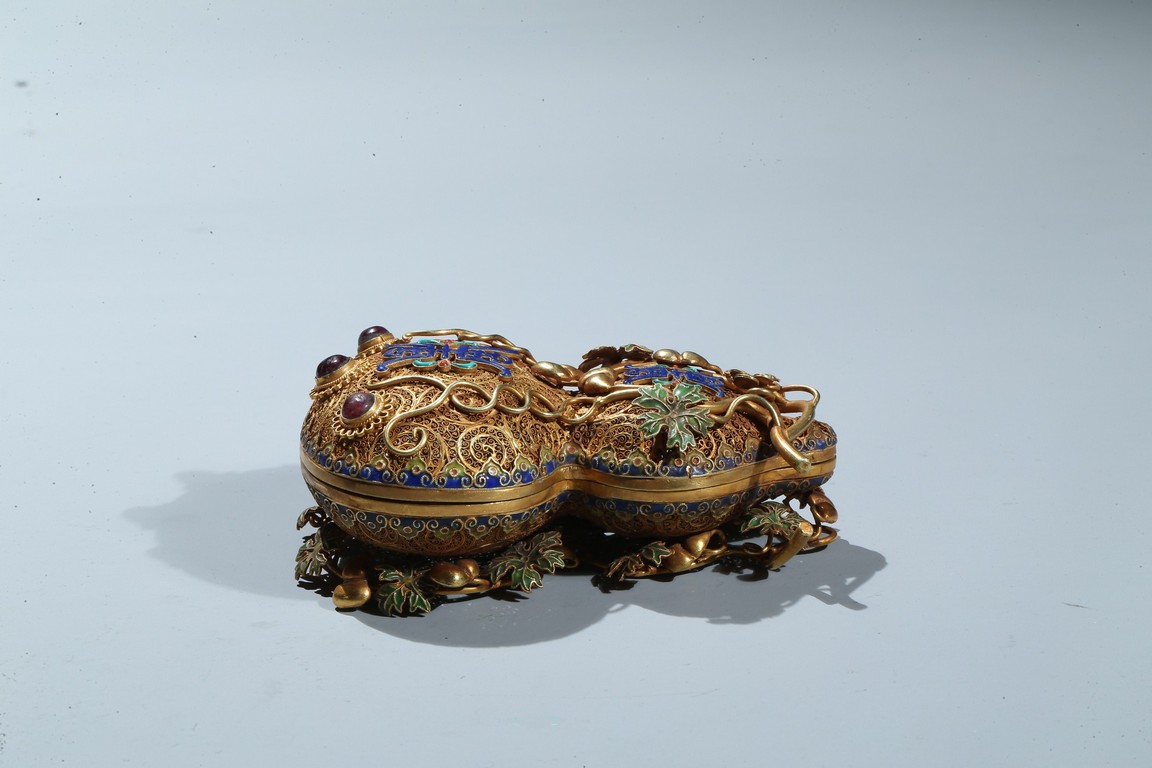 蓋盒取純金累絲而成,上鑲百寶,壓腰葫蘆形。上下分別鑲嵌青金石“壽”字,底部鑲嵌三顆尺寸碩大的紅寶石,葫蘆內側沿邊螺絲如意形燒藍一周。其色鮮艷動人,造型舒展灑麗,寓意吉祥。整器金碧生輝,色彩鮮明,工藝精巧,非皇家禦用之物不可望其項背,頂級選料加之宮廷花絲鑲嵌工藝,堪稱罕見奇珍。花絲鑲嵌之物歷來價值不菲。清雍正七年十月十六日,養心殿造辦處就曾記錄下這樣一份檔案:“太監劉希文交來:鑲嵌金累絲年年富貴簪一對,嵌珠四粒、紅寶石二塊,鑲嵌金累絲蘭花簪一對,嵌珠四粒、寶石二塊,梅花簪一對,葫蘆簪一對,每支嵌珠六粒,寶石二塊。傳旨:此簪做法甚好,著照此樣做些用,欽此。”這裏的“鑲嵌金累絲”指的就是花絲鑲嵌工藝。作為中國獨有的金銀加工技藝,“花絲鑲嵌”歷經了千年歲月的沈澱和洗禮。由於其用料過於珍奇,工藝極度復雜,歷史上向來是皇家禦用之物,只能由宮廷制作,成為財富與權力的象征。該葫蘆形蓋盒選料上乘,巧奪天工,正是此中極品。
