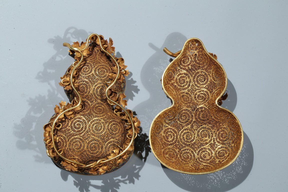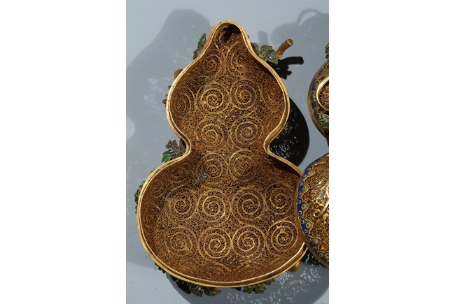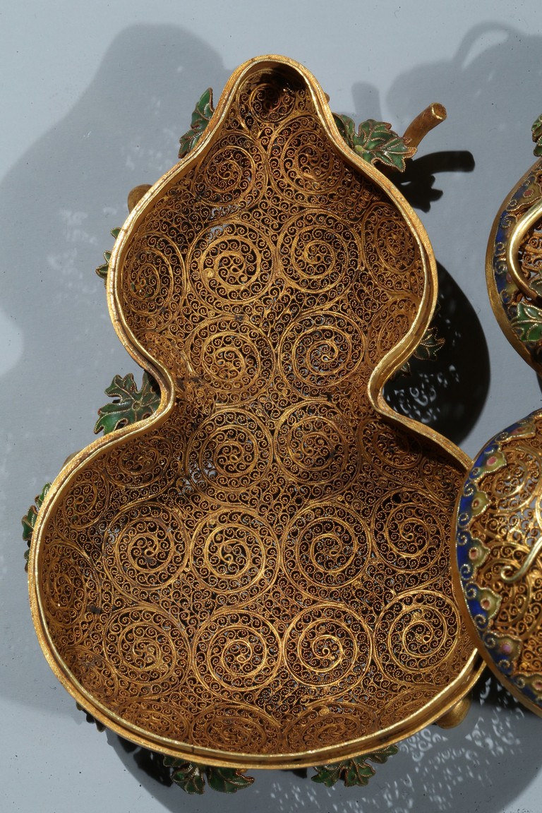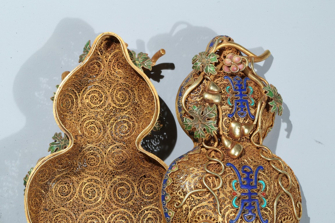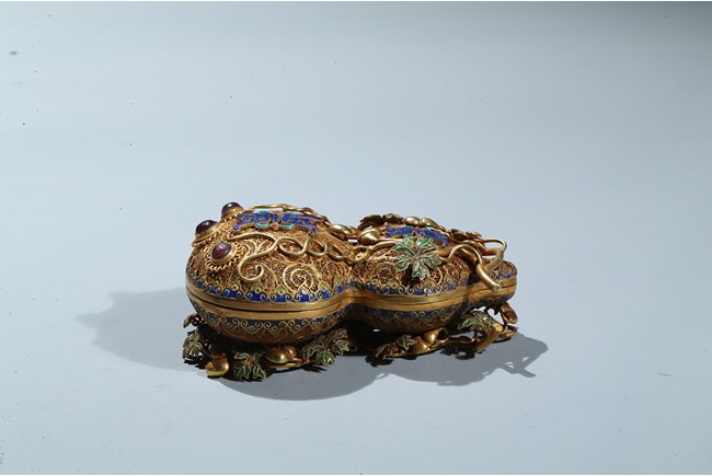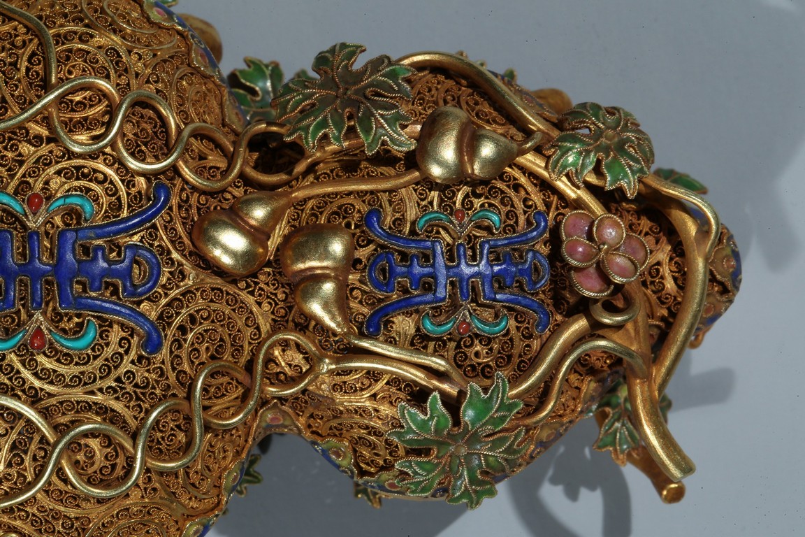 蓋盒取純金累絲而成,上鑲百寶,壓腰葫蘆形。上下分別鑲嵌青金石“壽”字,底部鑲嵌三顆尺寸碩大的紅寶石,葫蘆內側沿邊螺絲如意形燒藍一周。其色鮮艷動人,造型舒展灑麗,寓意吉祥。整器金碧生輝,色彩鮮明,工藝精巧,非皇家禦用之物不可望其項背,頂級選料加之宮廷花絲鑲嵌工藝,堪稱罕見奇珍。花絲鑲嵌之物歷來價值不菲。清雍正七年十月十六日,養心殿造辦處就曾記錄下這樣一份檔案:“太監劉希文交來:鑲嵌金累絲年年富貴簪一對,嵌珠四粒、紅寶石二塊,鑲嵌金累絲蘭花簪一對,嵌珠四粒、寶石二塊,梅花簪一對,葫蘆簪一對,每支嵌珠六粒,寶石二塊。傳旨:此簪做法甚好,著照此樣做些用,欽此。”這裏的“鑲嵌金累絲”指的就是花絲鑲嵌工藝。作為中國獨有的金銀加工技藝,“花絲鑲嵌”歷經了千年歲月的沈澱和洗禮。由於其用料過於珍奇,工藝極度復雜,歷史上向來是皇家禦用之物,只能由宮廷制作,成為財富與權力的象征。該葫蘆形蓋盒選料上乘,巧奪天工,正是此中極品。