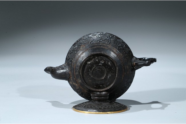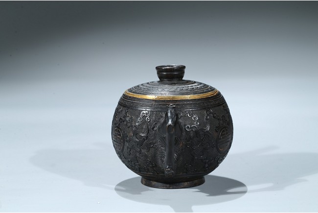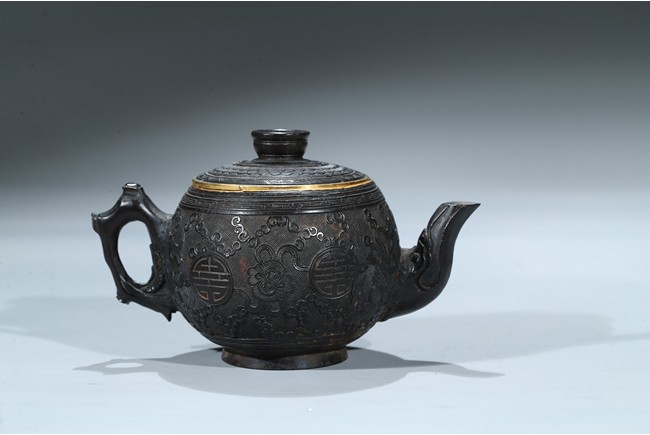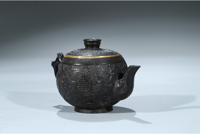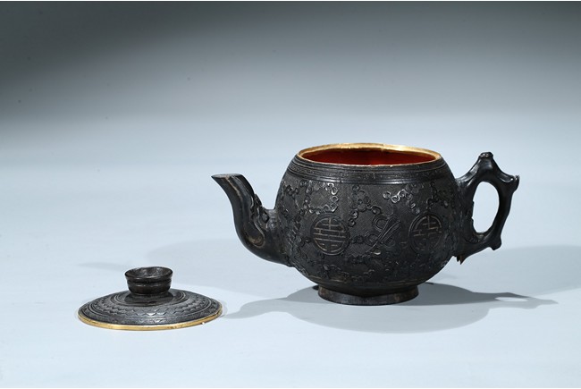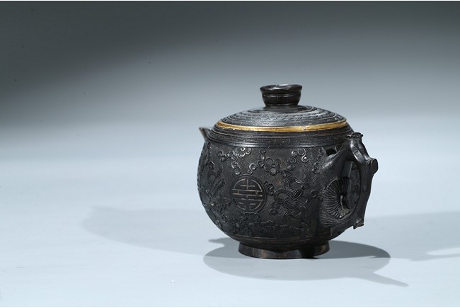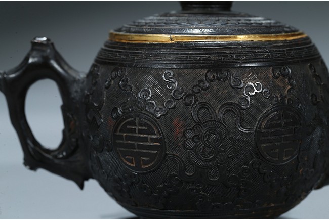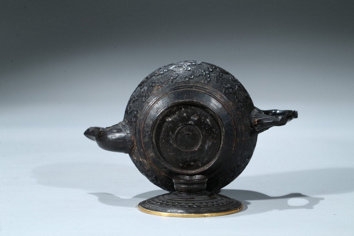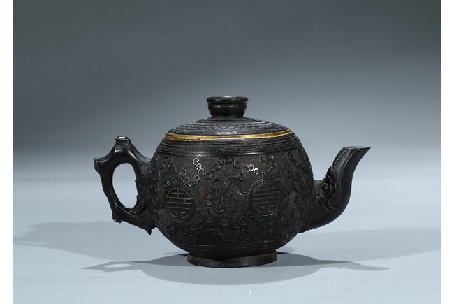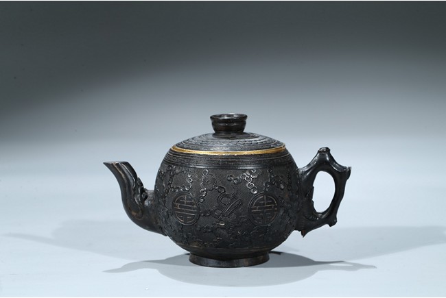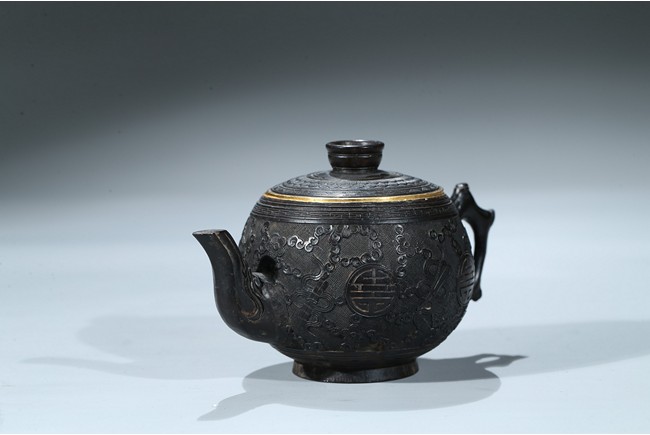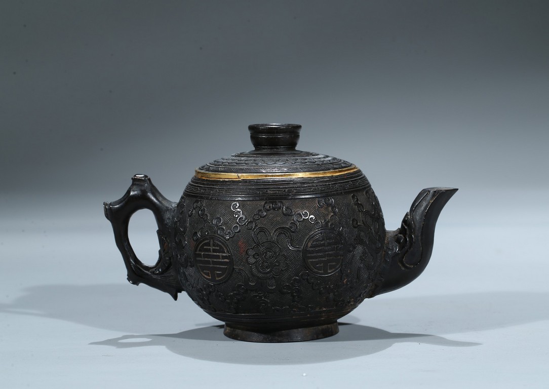 The globular body carved with shou medallions and auspicious objects joined together by a flower and scroll chain, reserved on a cross-hatch ground, the spout is carved as an tree trunk, and the handle as a leafy branch. Qing Dynasty Qianlong period.