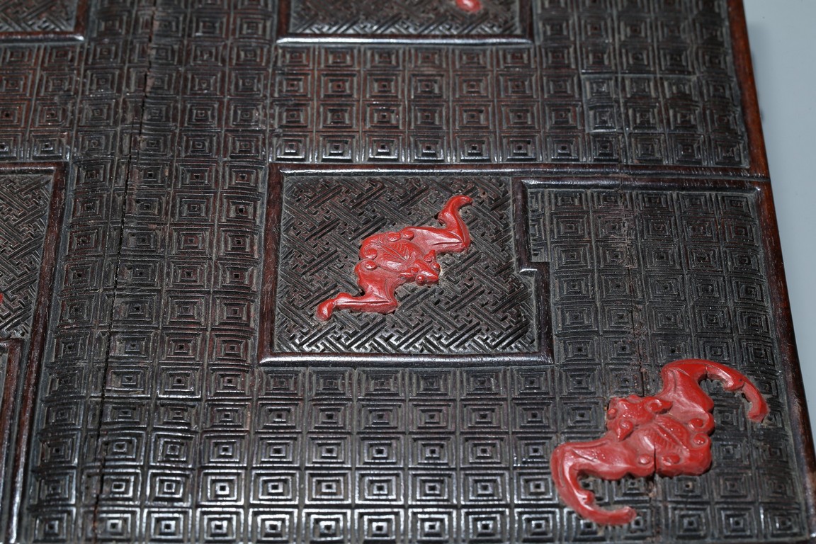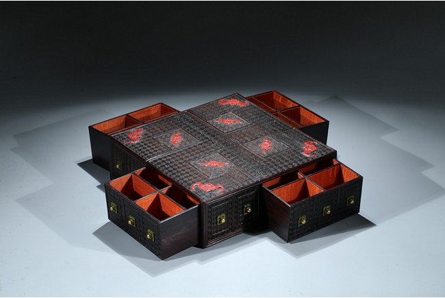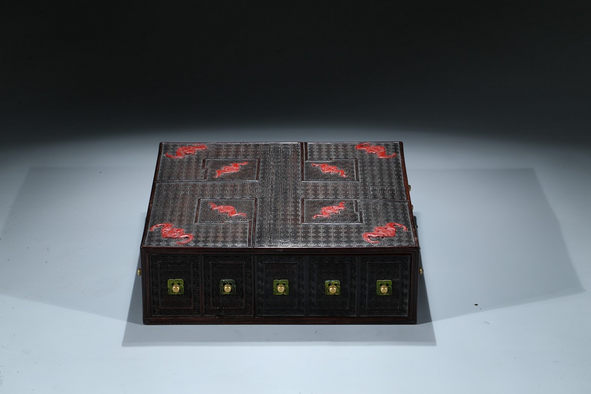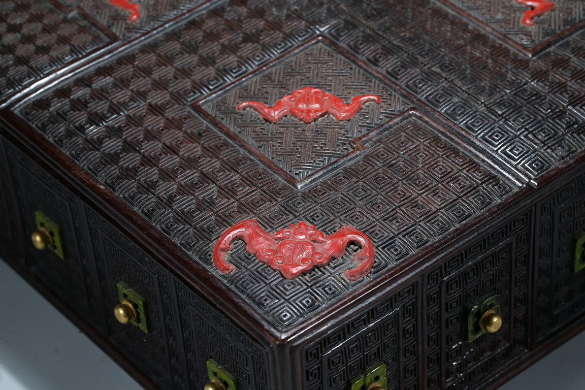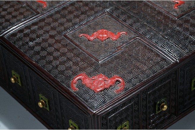 The square top inlaid with eight red cinnabar lacquered bat in flight reserve on key-fret zitan ground, each side with a four compartment drawer. Qing Dynasty period.