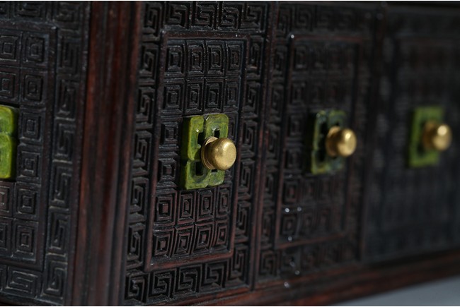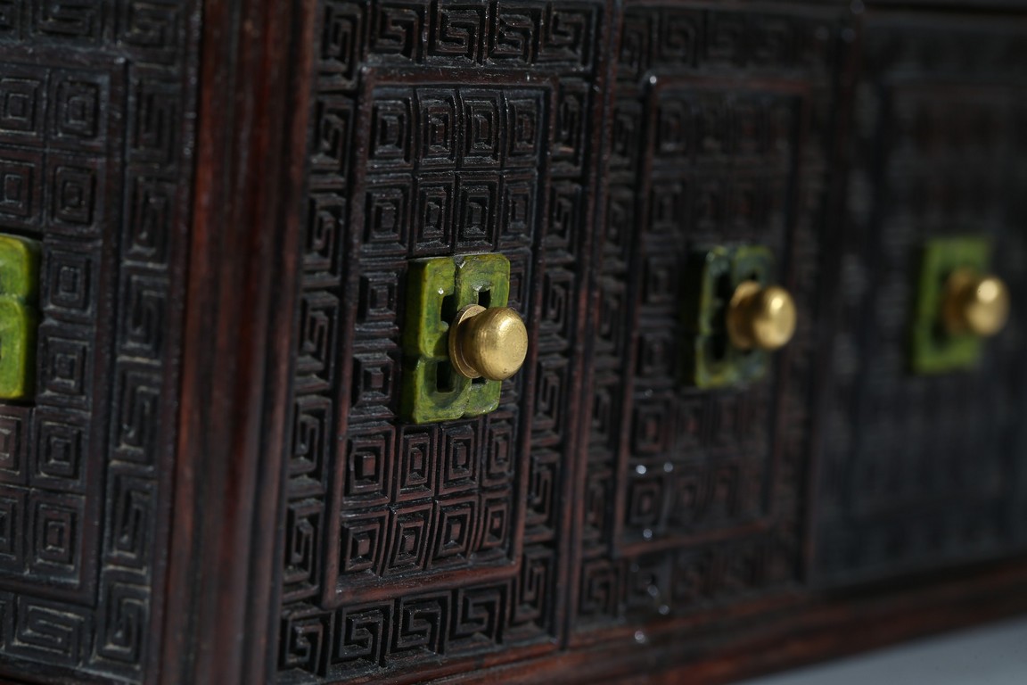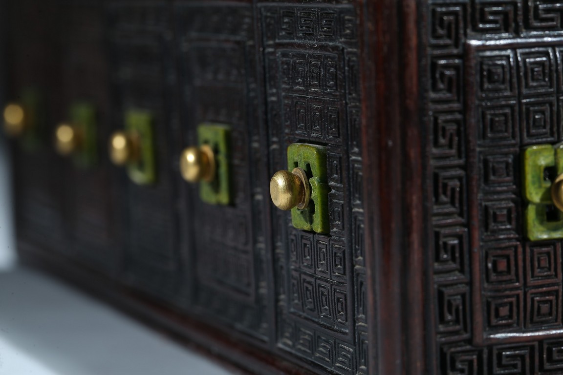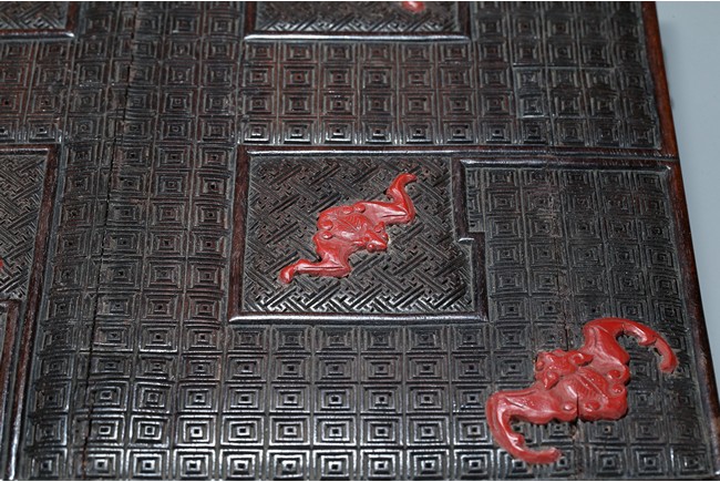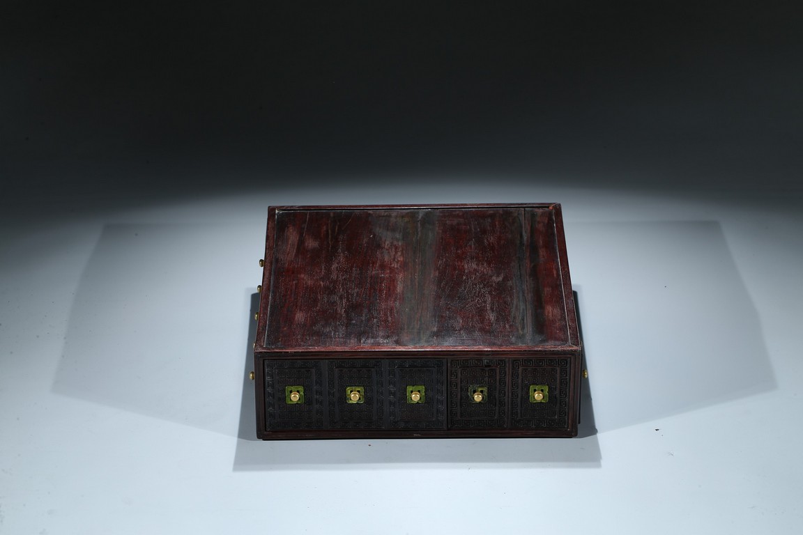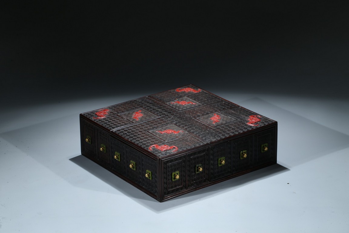明清以來,皇室、貴族對紫檀趨之若騖。乾隆時期百業興旺,國力充實,木質器物用料亦十分奢靡,紫檀工藝則發展得最為純粹和成熟。此紫檀盒正方形,造型別致。盒體四面各等分置五格長方形小門鈕,其中三格各巧作一抽履,可供開啟,造型別具一格。蓋面卍字、上浮雕剔紅蝙蝠飛向四面。有福從天降之寓意,盒身正面整體以變形回紋為地,整齊劃一,起到了襯托中間主題紋飾的作用。盒體、盒面滿工減地浮雕回紋,此盒設計巧妙,選材精良,刻工流暢。是不可多得的文房精品。