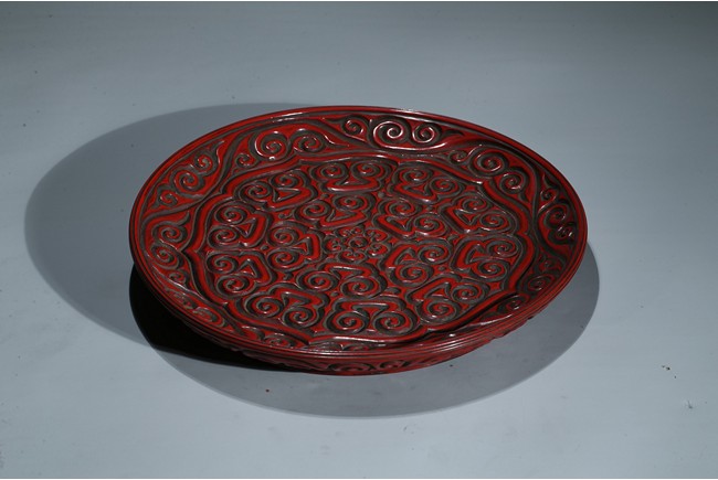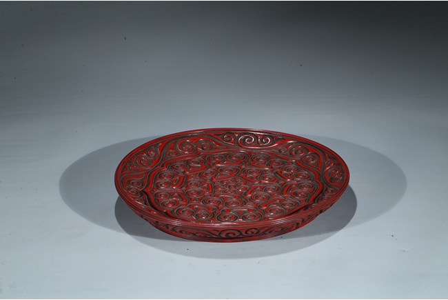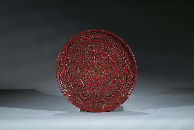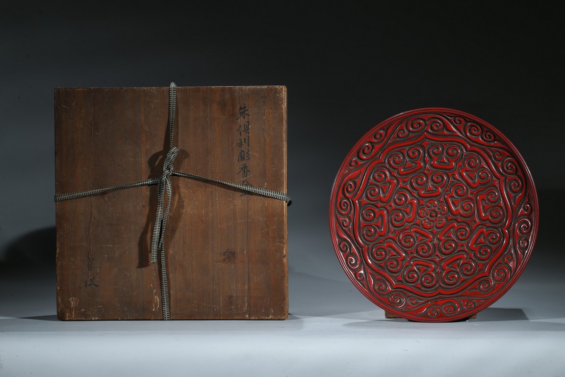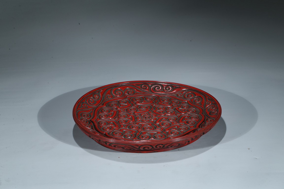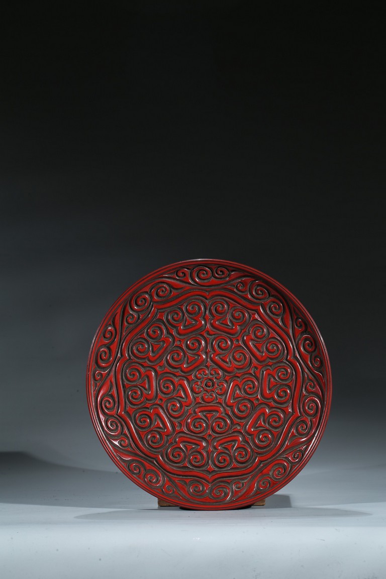 此件漆器為木胎,通體髹朱漆,從盤心至邊緣圓形對稱滿雕如意雲紋,盤身外臂剔刻如意雲頭紋。花紋側面露出有規律的朱漆線兩道,呈現出剔紅工藝特有的裝飾性。底髹宗漆。此盤造型規矩飽滿,剔刻紋飾厚重,漆面包漿亮麗,整體美觀大方。充分展現了中國剔紅工藝的優秀水平,是一件不可多得的漆器精品。漆器剔紅技法成熟於宋元時期,發展於明清兩代。明黃成《髹飾錄》中寫道:“宋元之制,藏鋒清楚,隱起圓滑,纖細精致。”元代剔紅以厚葉肥花、姿態艷麗為勝。此盤髹漆肥厚,漆色純正潤美,圖紋別致,雕工純熟,藏鋒不露、磨工圓滑。制者觀察入微,可謂技臻藝絕。來源:美國中西部私人收藏 Provenance: Property from a private Midwestern collection