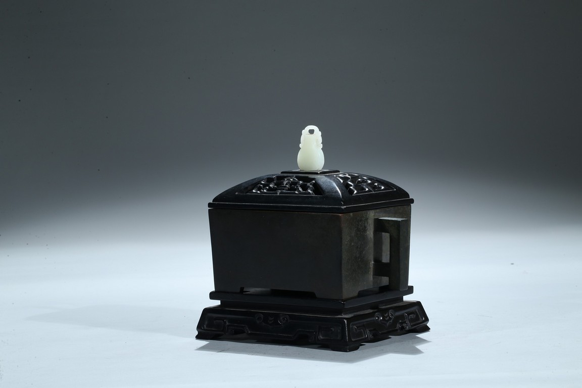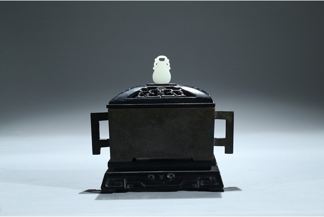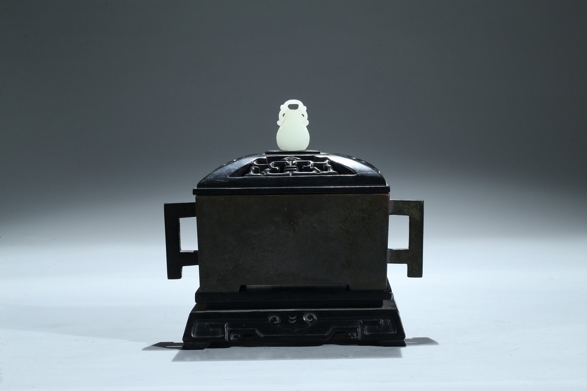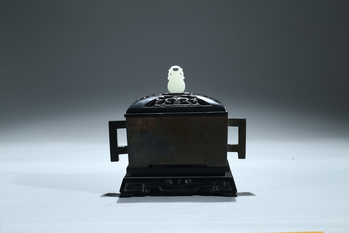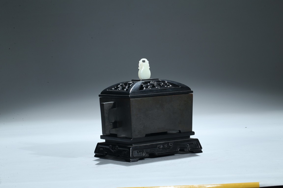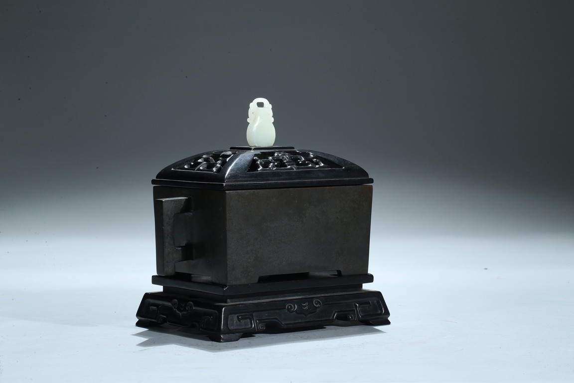 Of rectangular section, supported on four bracket feet, the sides set with angular loop handles, fitted with a hardwood cover with openwork design and surmounted with a white jade finial, base with four characters 'Yong shi zhi bao', all raised on a conforming hardwood base. Qing Dynasty period.
