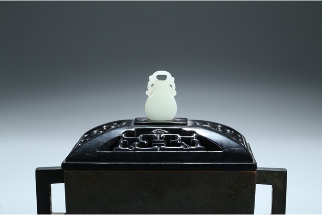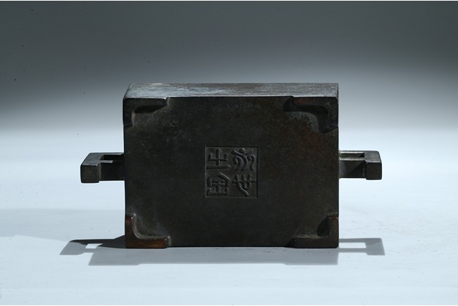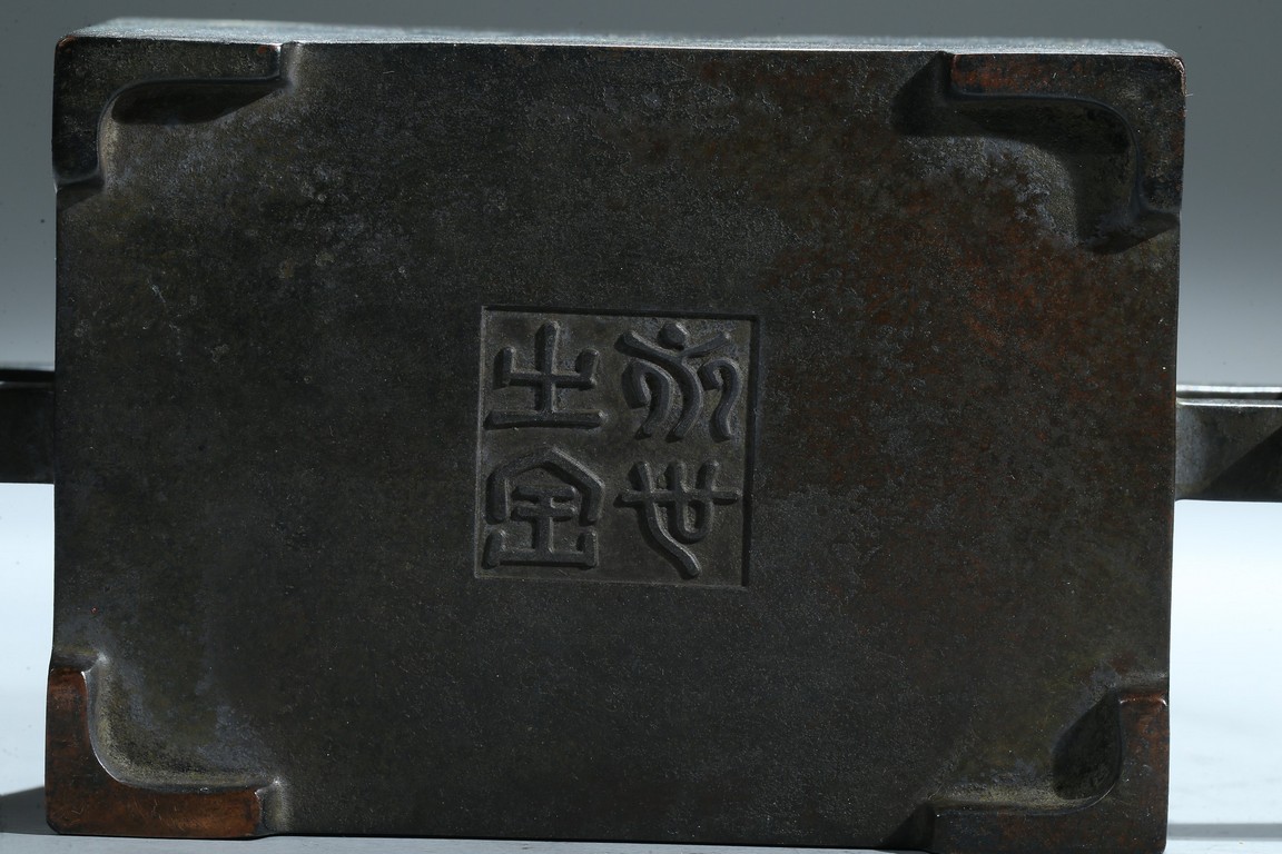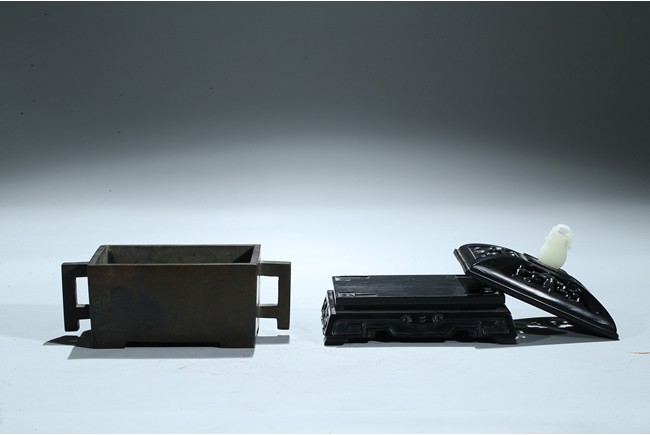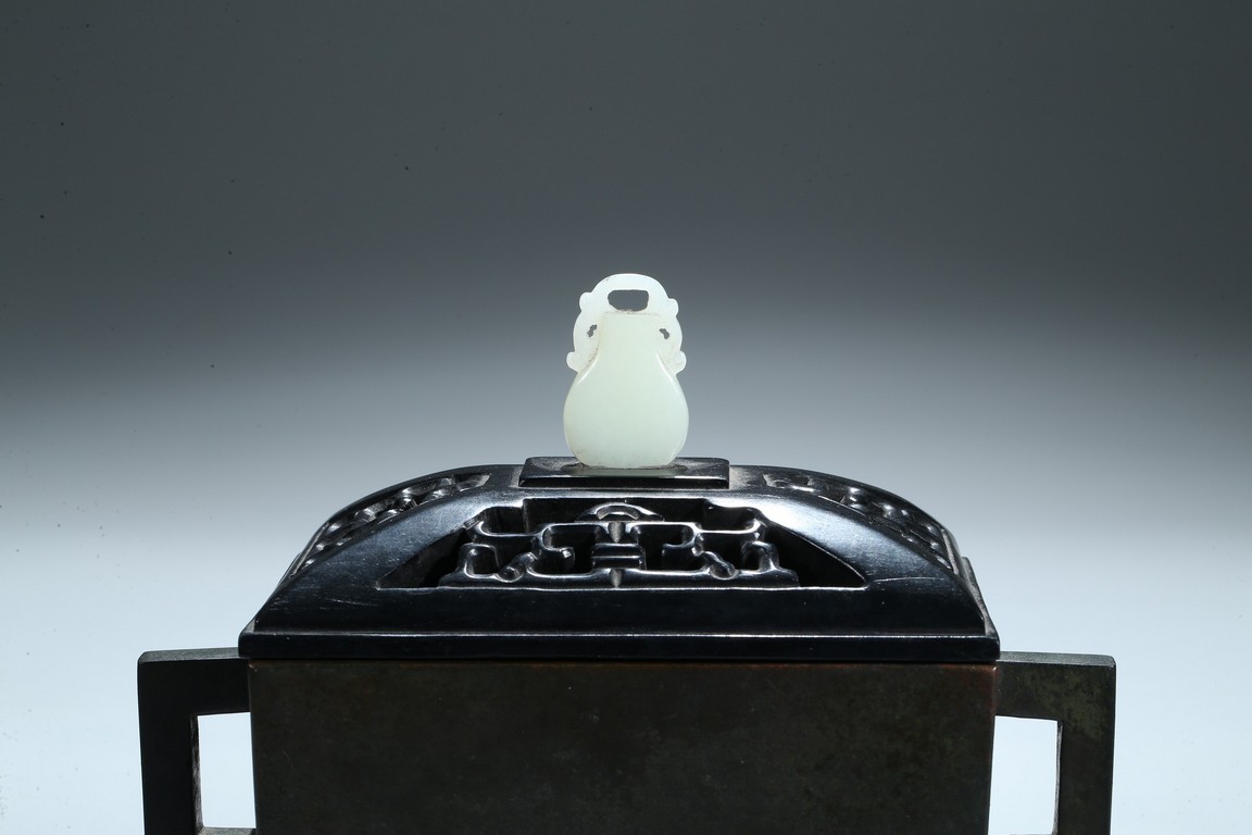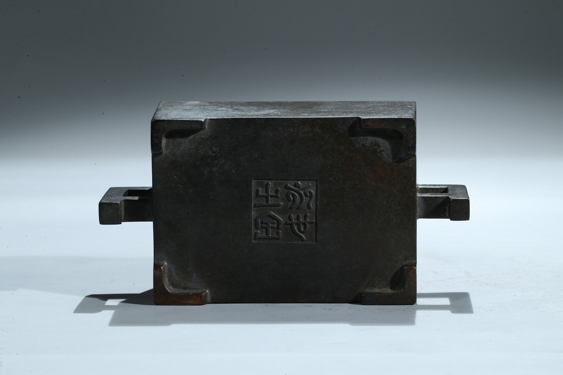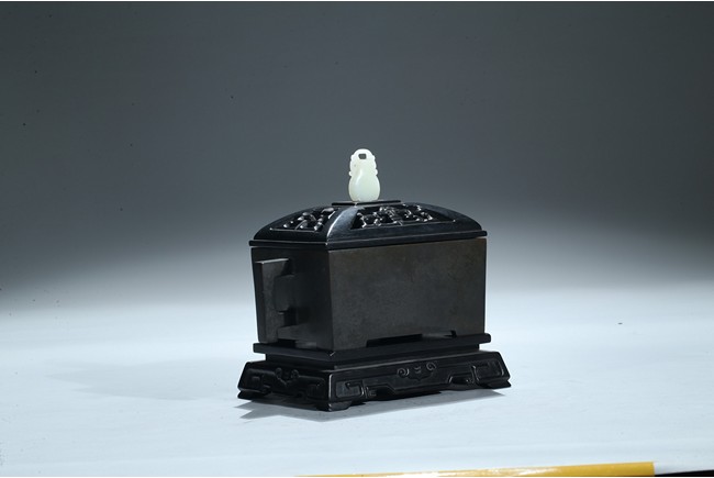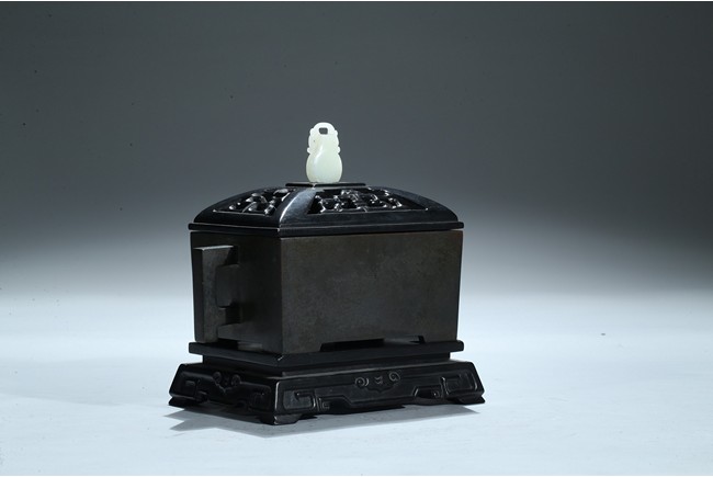 Of rectangular section, supported on four bracket feet, the sides set with angular loop handles, fitted with a hardwood cover with openwork design and surmounted with a white jade finial, base with four characters 'Yong shi zhi bao', all raised on a conforming hardwood base. Qing Dynasty period.