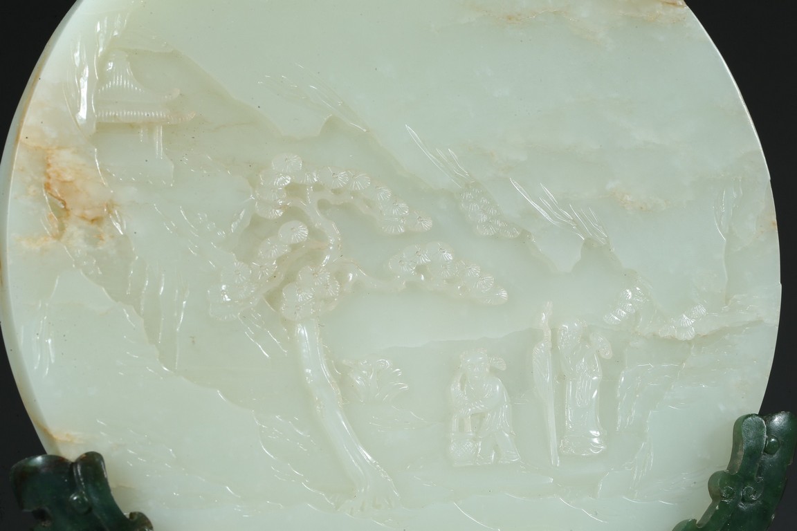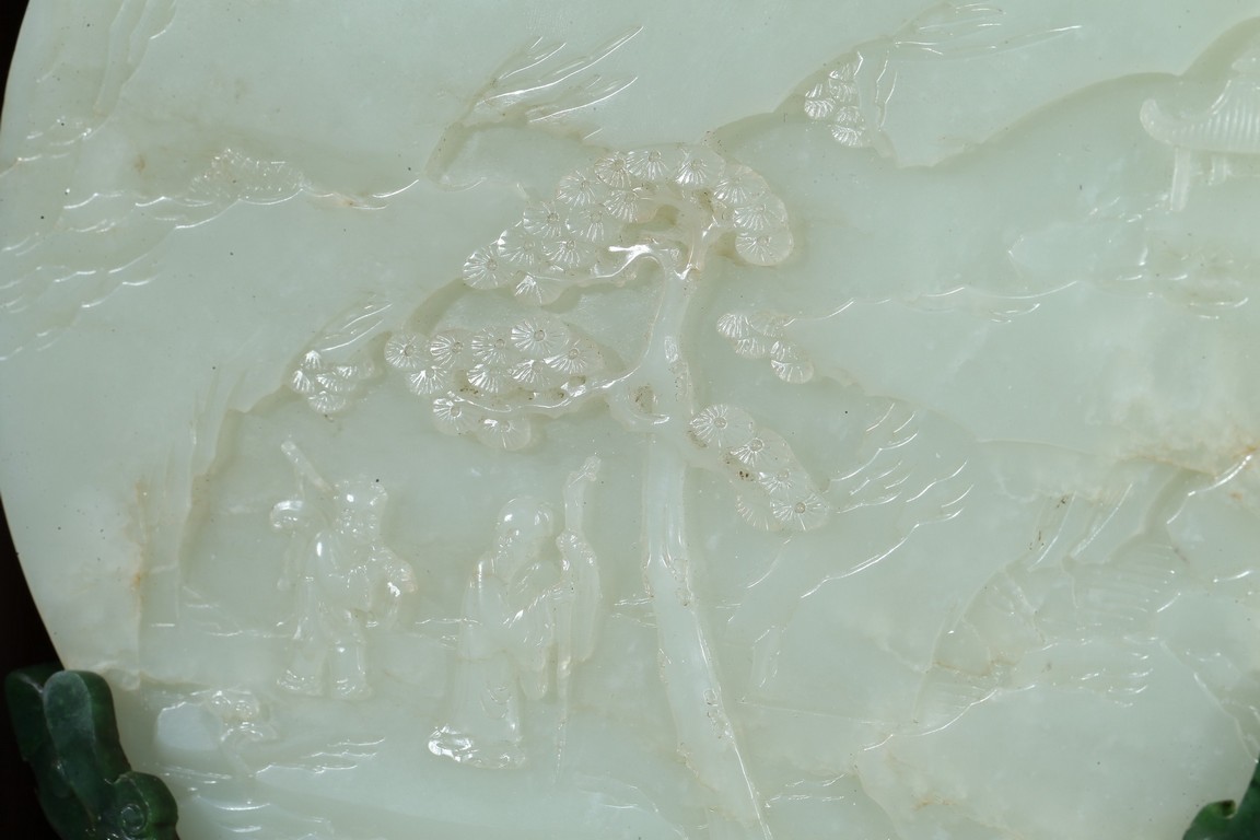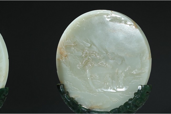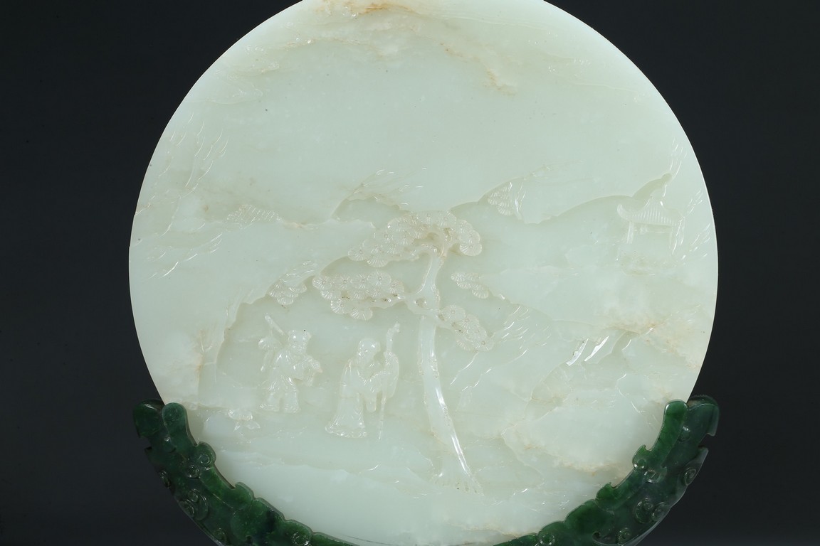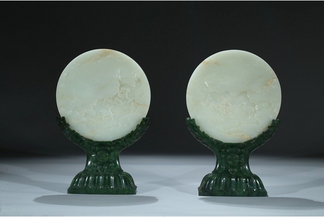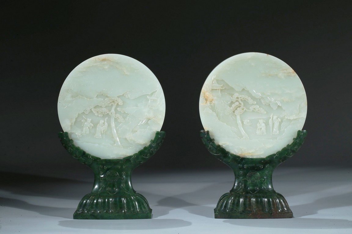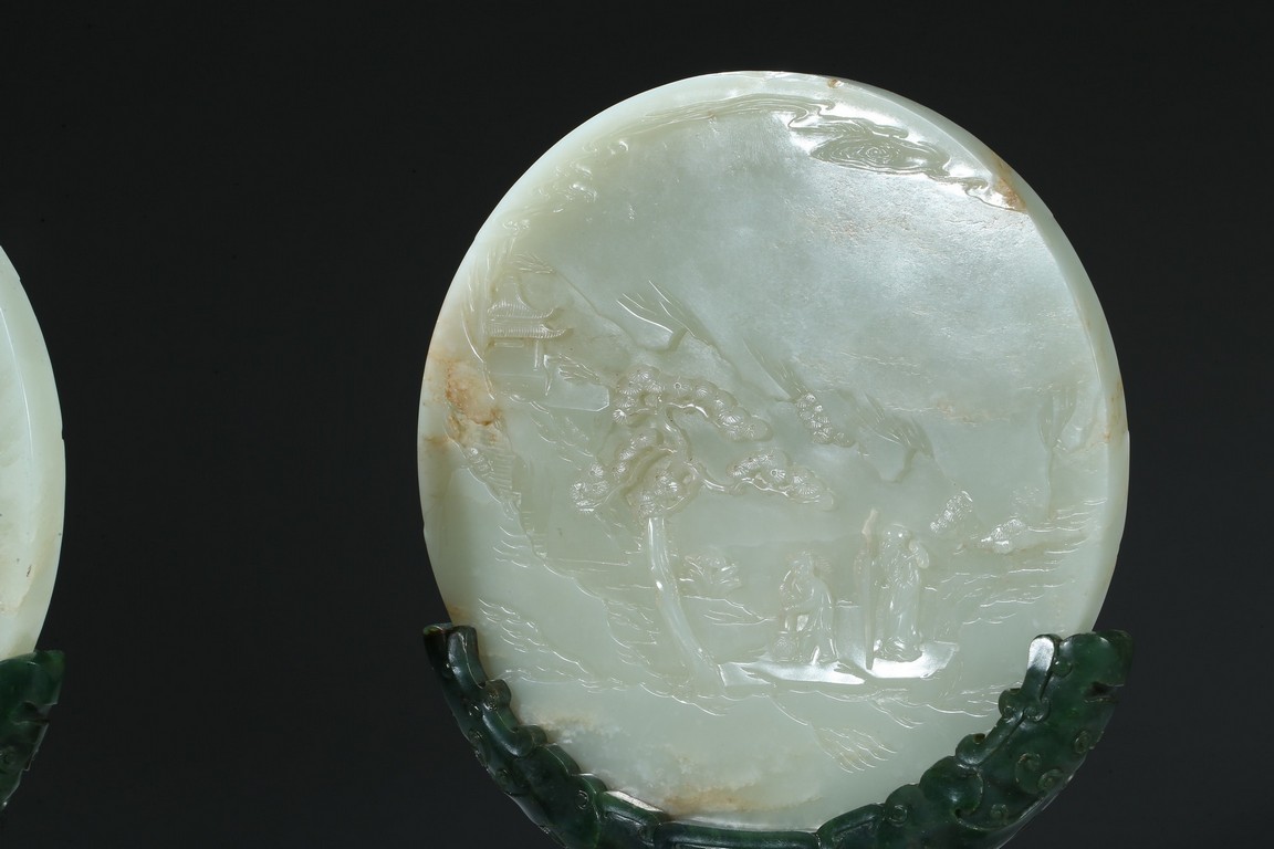 Each circular panel intricately worked on both sides, the front depicting an elderly figure holding a lingzhi branch and a wood staff, accompanied by a young child holding a basket, all set within a dense deeply worked mountainous landscape, with overhanging rockwork, gnarled pine and wutong trees and with pavilions rising in the distance, the reverse worked with crane on rocky and deer on rocky outcrop, respectively, all supported on spinach green jade stand carved with a shou medallion to the center above lotus petal formed base. Qing Dynasty Qianlong period.