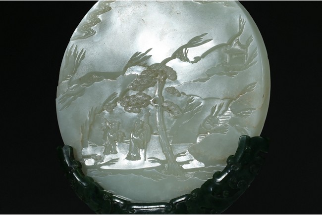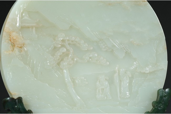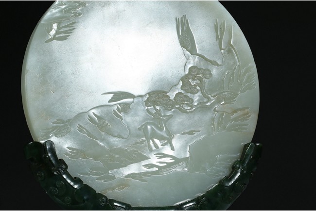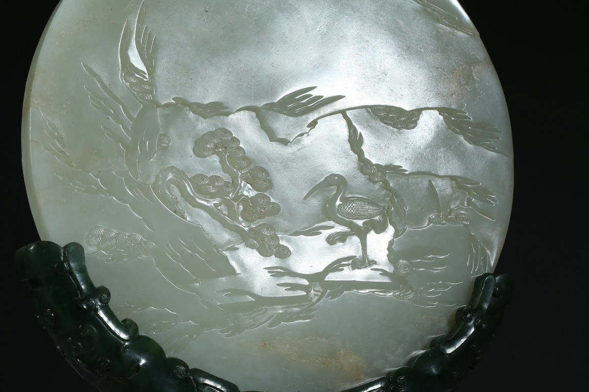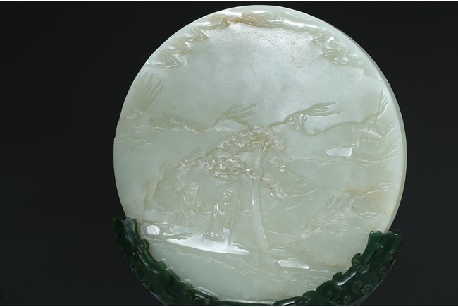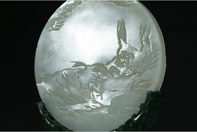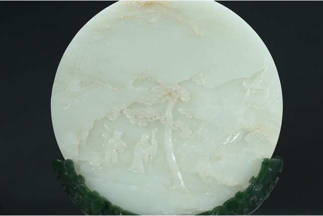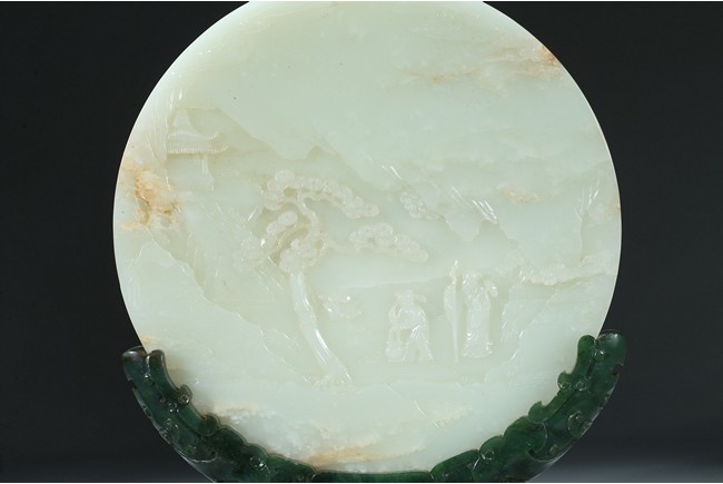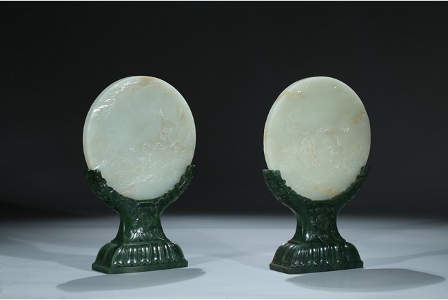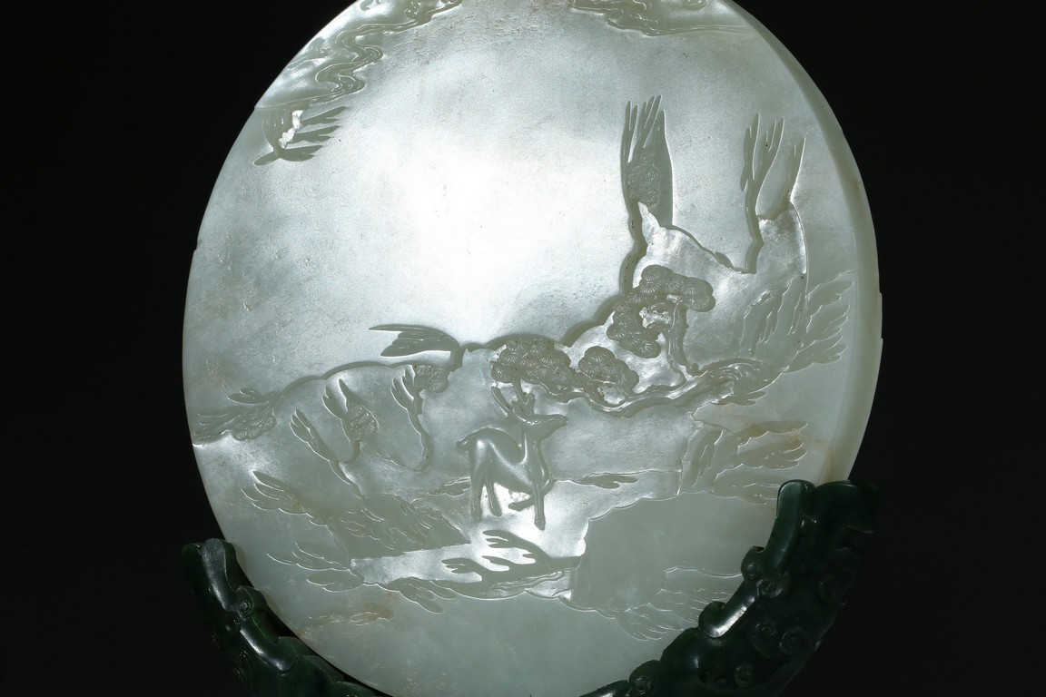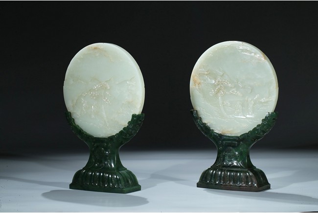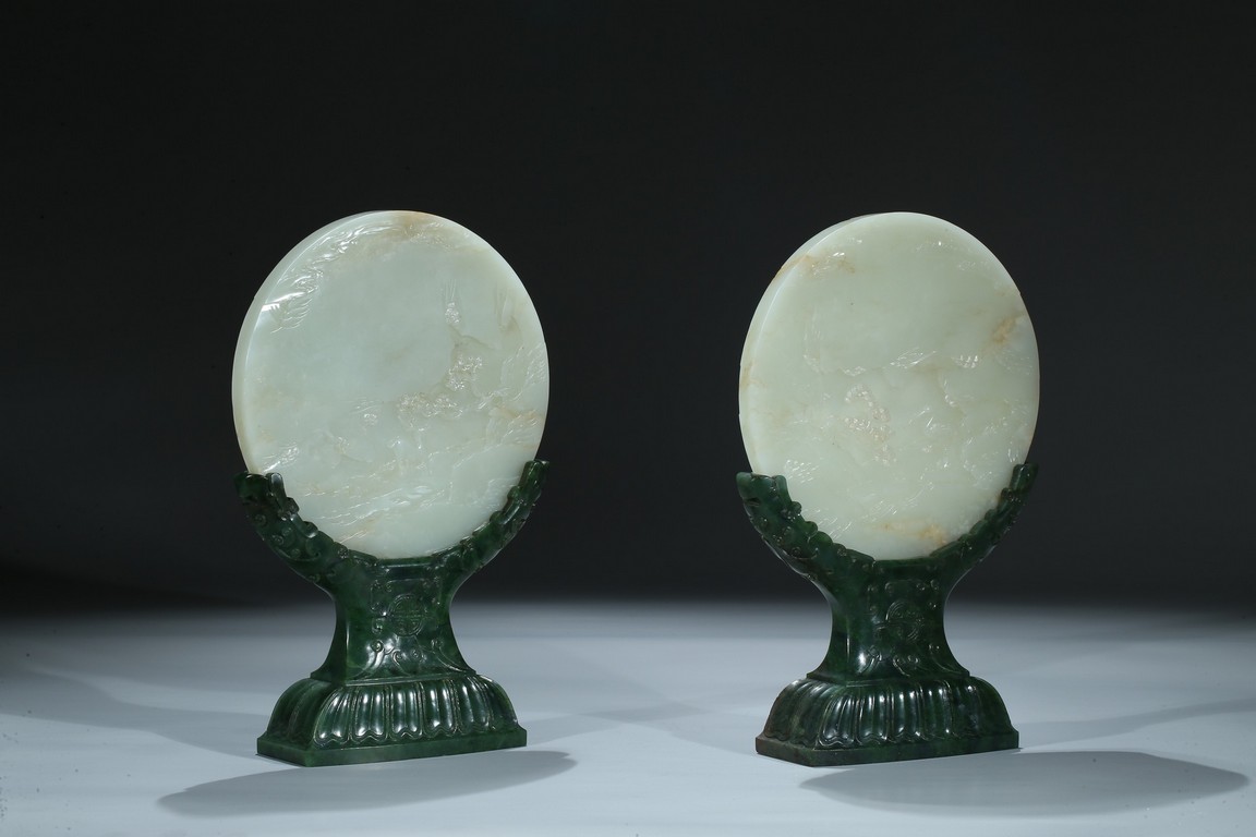 Each circular panel intricately worked on both sides, the front depicting an elderly figure holding a lingzhi branch and a wood staff, accompanied by a young child holding a basket, all set within a dense deeply worked mountainous landscape, with overhanging rockwork, gnarled pine and wutong trees and with pavilions rising in the distance, the reverse worked with crane on rocky and deer on rocky outcrop, respectively, all supported on spinach green jade stand carved with a shou medallion to the center above lotus petal formed base. Qing Dynasty Qianlong period.