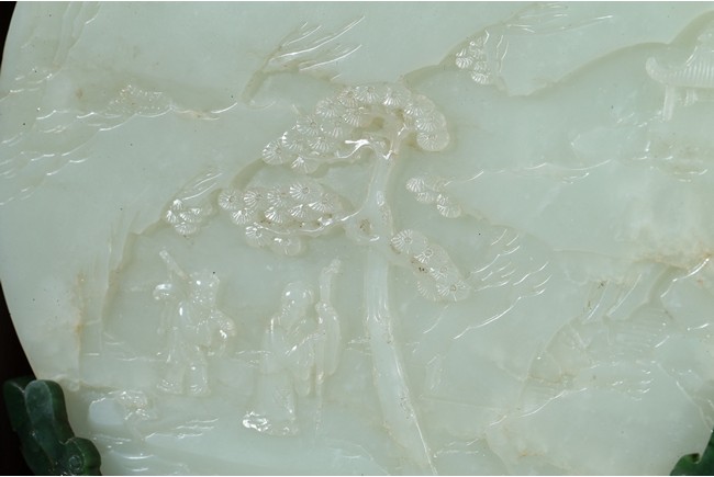 這對清乾隆時期的白玉山水人物圓插屏,和田白玉籽料,致密溫潤,純潔無瑕,色澤瑩亮。器形周正巧妙,做工細膩精致,插屏一面雕山水人物圖景,布局嚴謹而有法度,工整莊重,一派皇家氣度。另一面雕刻古松仙鶴,刀工細膩,刻畫清晰,疏落有致,自然清新。底座和田碧玉雕琢而成,底座中間浮雕團壽靈芝紋飾,近足處浮雕蓮瓣紋一周,極盡華美,奪人珠目。該插屏體量較大,器體渾圓,用材之精,實屬罕見。山水人物畫面寧靜優美,巖石挺拔嶙峋,松樹枝幹彎曲遒勁,枝葉繁茂,蔚然成峰;溪水淙淙,祥雲遊蕩,山巒起伏、古松參天、亭臺樓閣、蒼穹玉宇。總之,該器造型規矩,端莊大方,穩重典雅,雕工嫻熟,圓屏心兩面紋飾均采用多層浮雕技法琢刻。山石人物的塑造均自然流暢,風貌古雅,取材獨特,造型奇巧玲瓏,展示出清代雕刻工藝的繁榮,實為不可多得的一件經典佳作。可參考香港佳士得 2007年11月 拍品號1511 成交價HKD 18,247,500。來源:南加州聖地亞哥家族舊藏 Compare a similar pair of white jade circular table screens, sold in Christie’s Hong Kong, November 2007, Lot 1511, sold for HKD 18,247,500. Privenance: Private family collection, San Diego, California