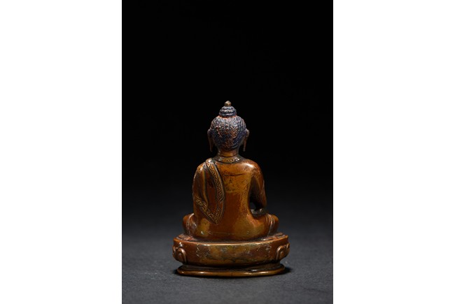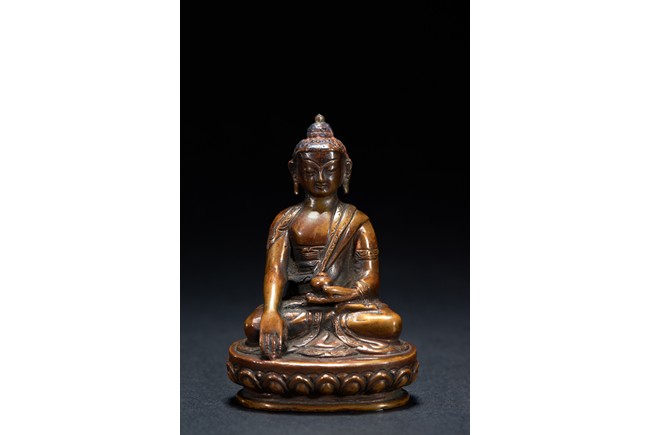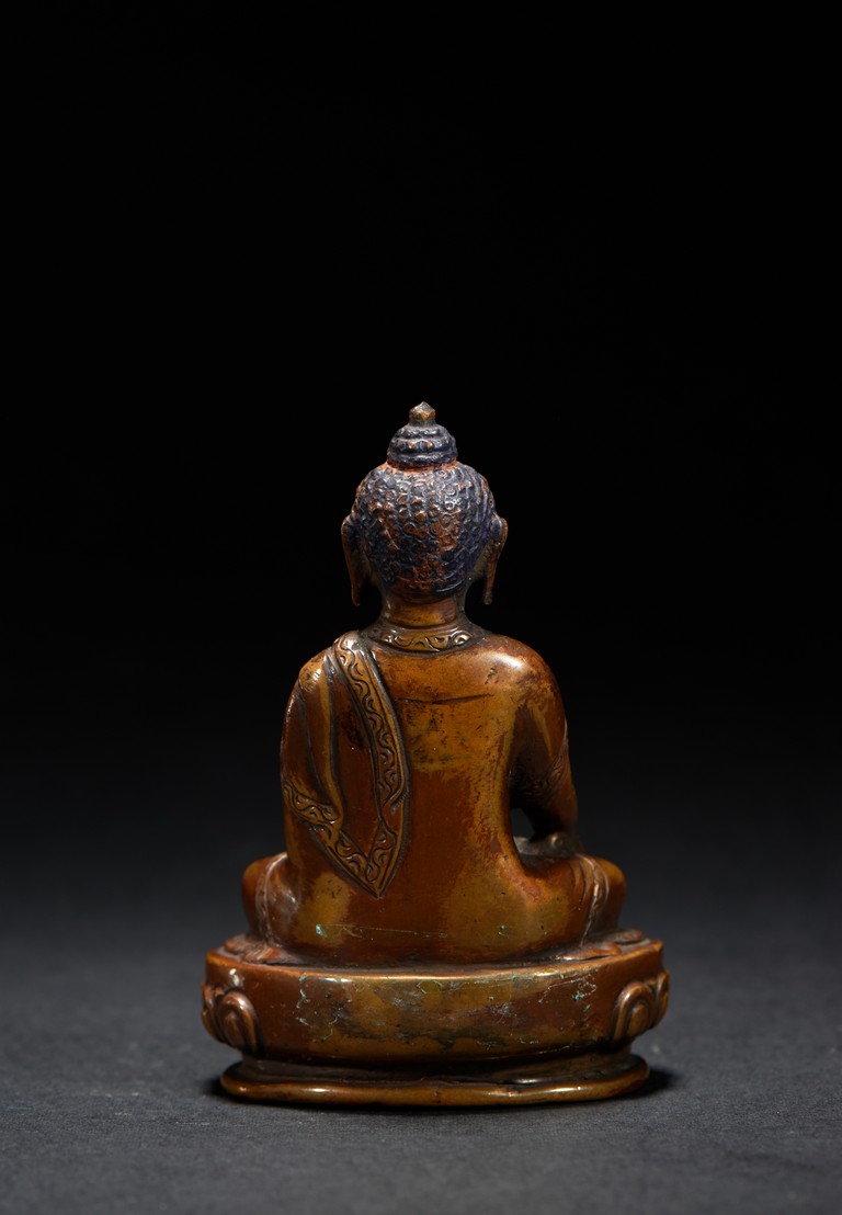 Shown seated upon a lotus throne in dhyanasana,right hand in bhumisparsa the other supporting an alms bowl,he has a meditative expression and is dressed in a robe draped over his left shoulder. Qing Dynasty period.