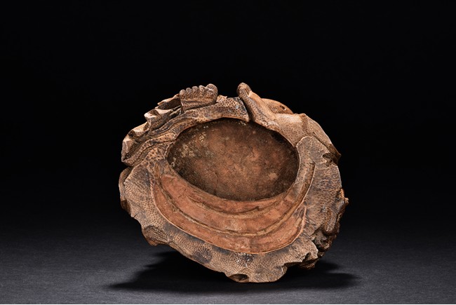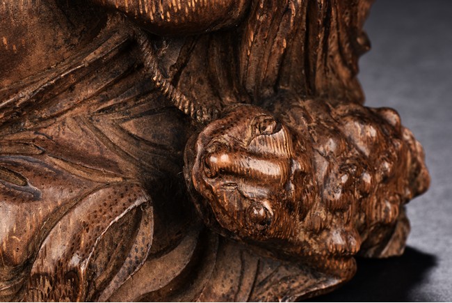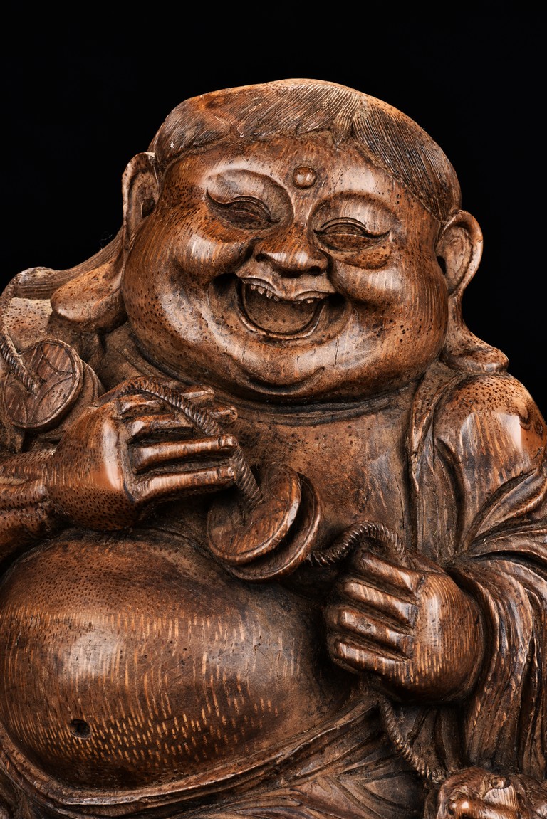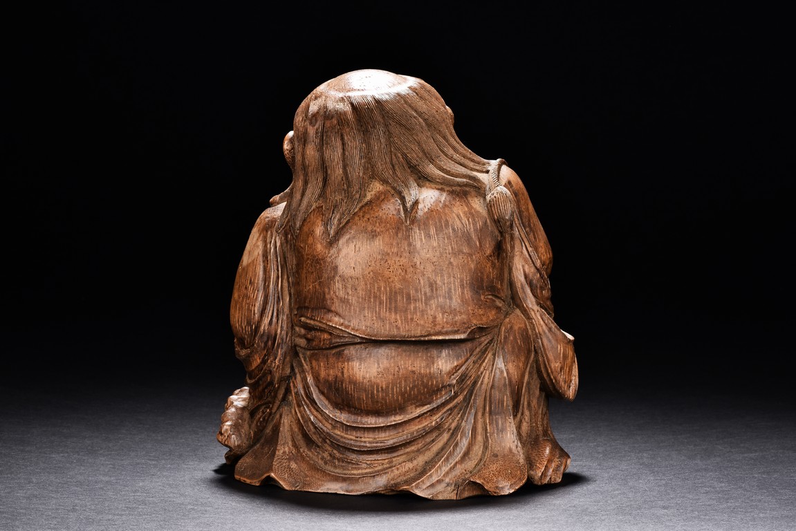 Carved from bamboo in the figure of Liu Hai,his is shown with a laughing expression and wearing loose robe exposing belly,holding a string of coins with both hands with a golden toad behind him. Qing Dynasty period