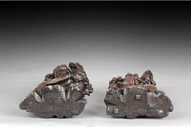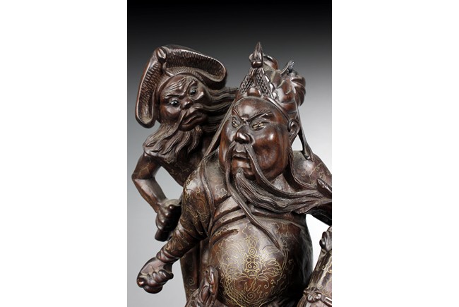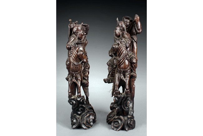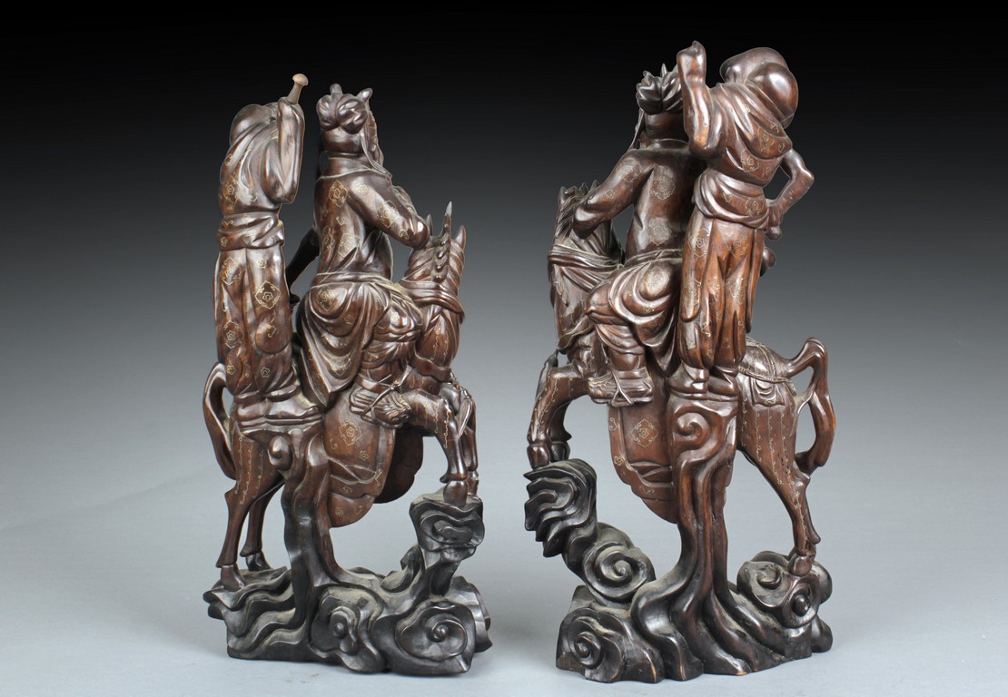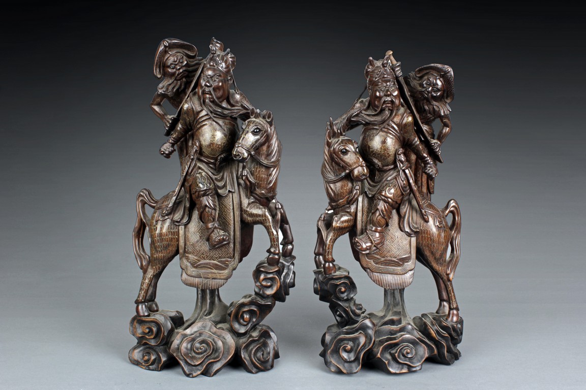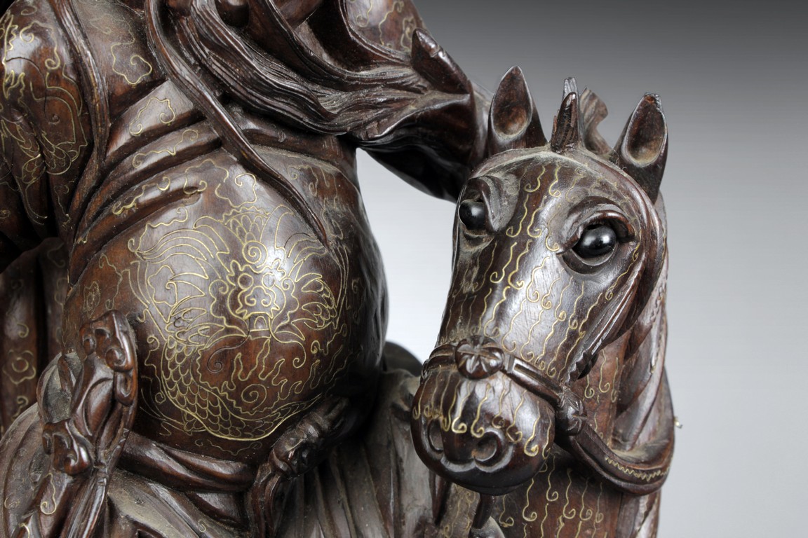 The figure depicts Guan Yu,wearing armor with cloth on top,is mounted on a horse on top of clouds,while Zhou Cang with machete is seen standing on the clouds behind Guan Yu; silver lines inset into wood to create delicate patterns. Qing Dynasty period.