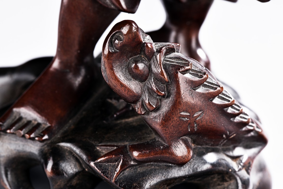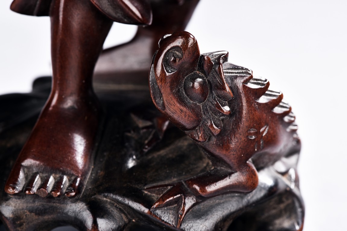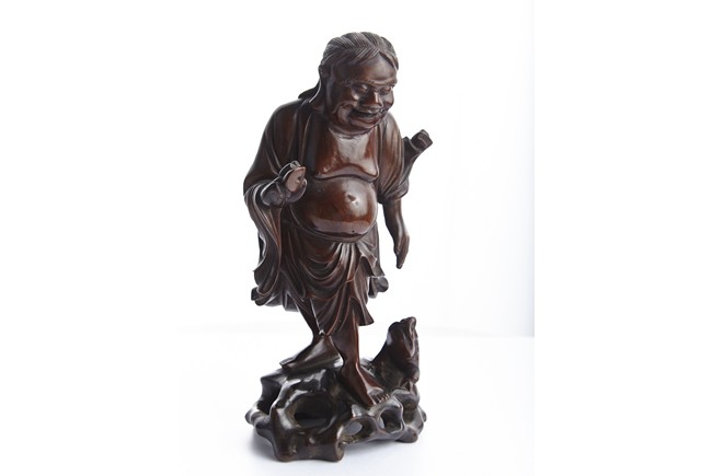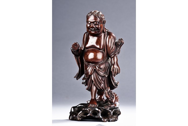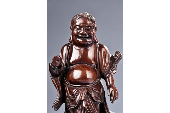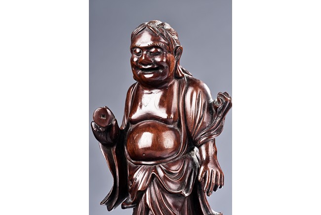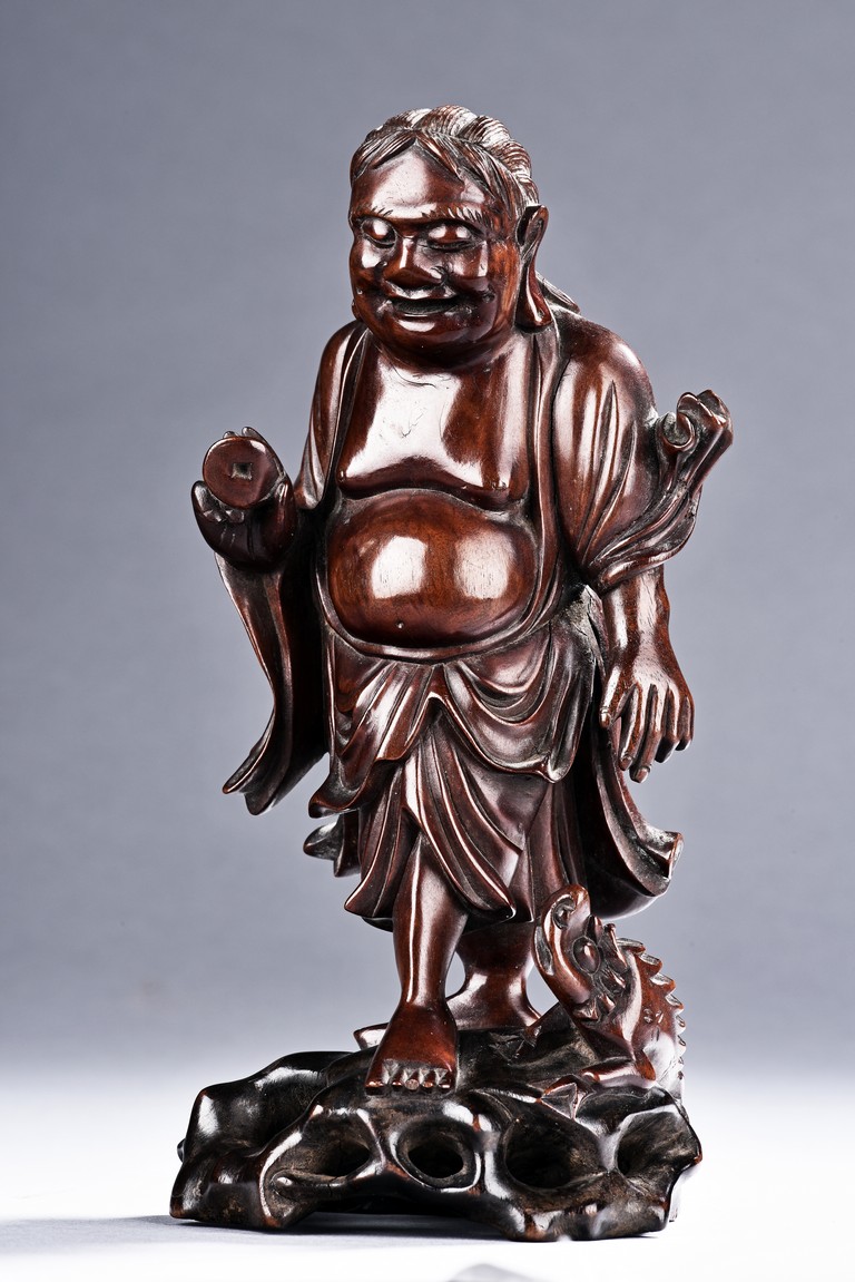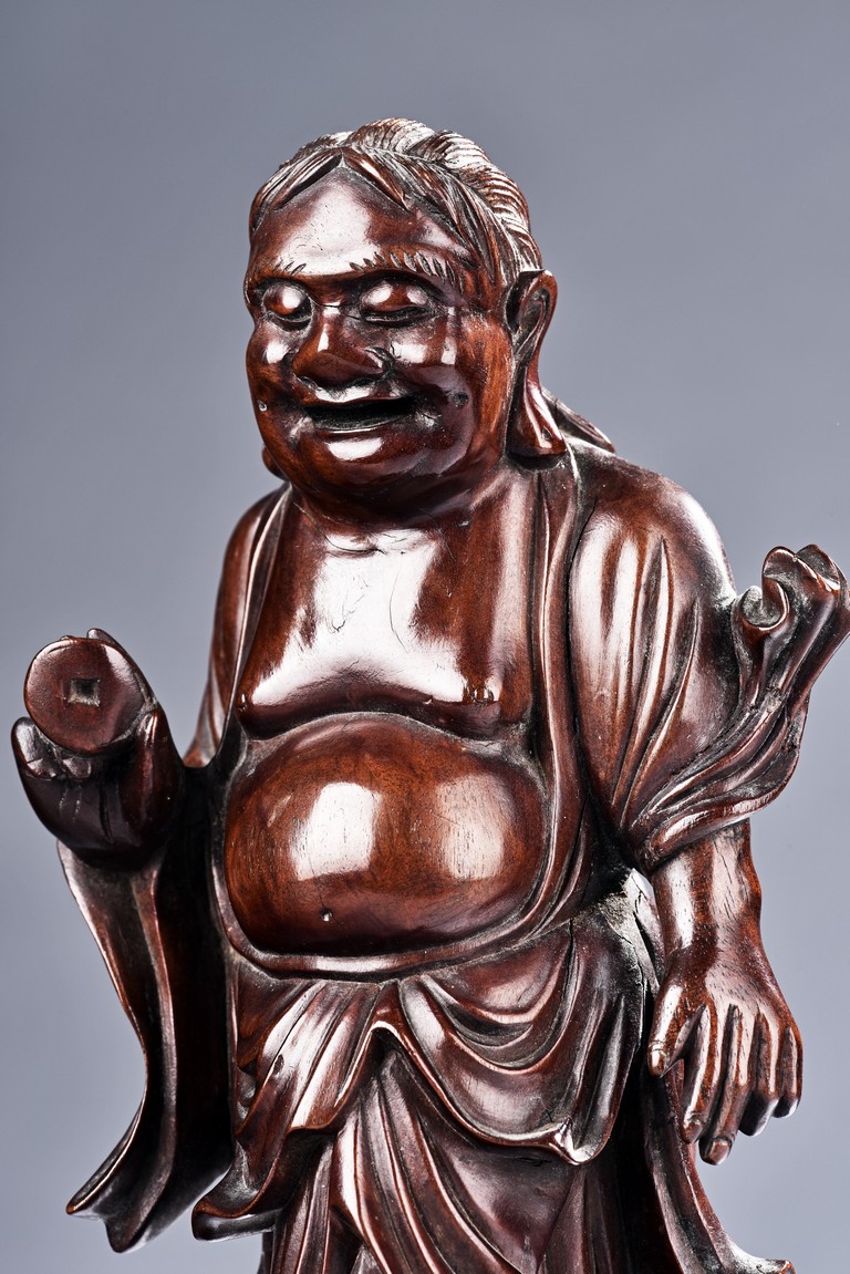 Shown standing on base with golden toad on his left,his right hand holding a coin,wearing long robes exposing belly,the face with laughing expression with mouth open,hair finely incised. Republic period.