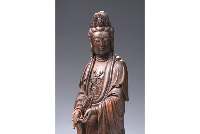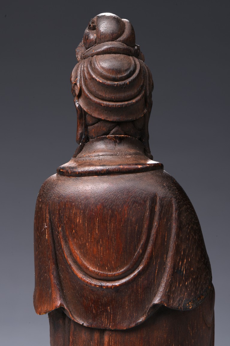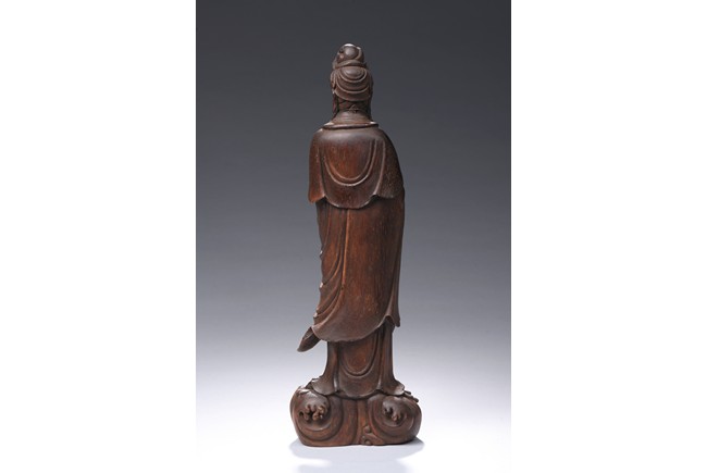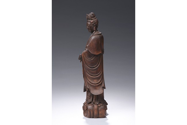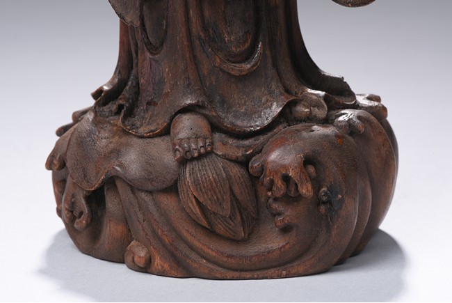 The Guanyin is carved standing upon cresting foam,her right hand holding the sacred vase downward,wearing long robe with graceful folds,the head turned slightly to the left and framed by an elaborate coiffure,the face with benevolent expression with downcast eyes. Qing Dynasty period.