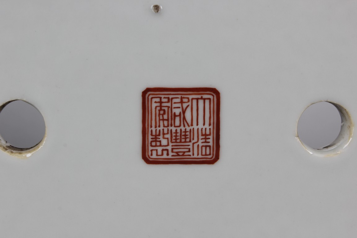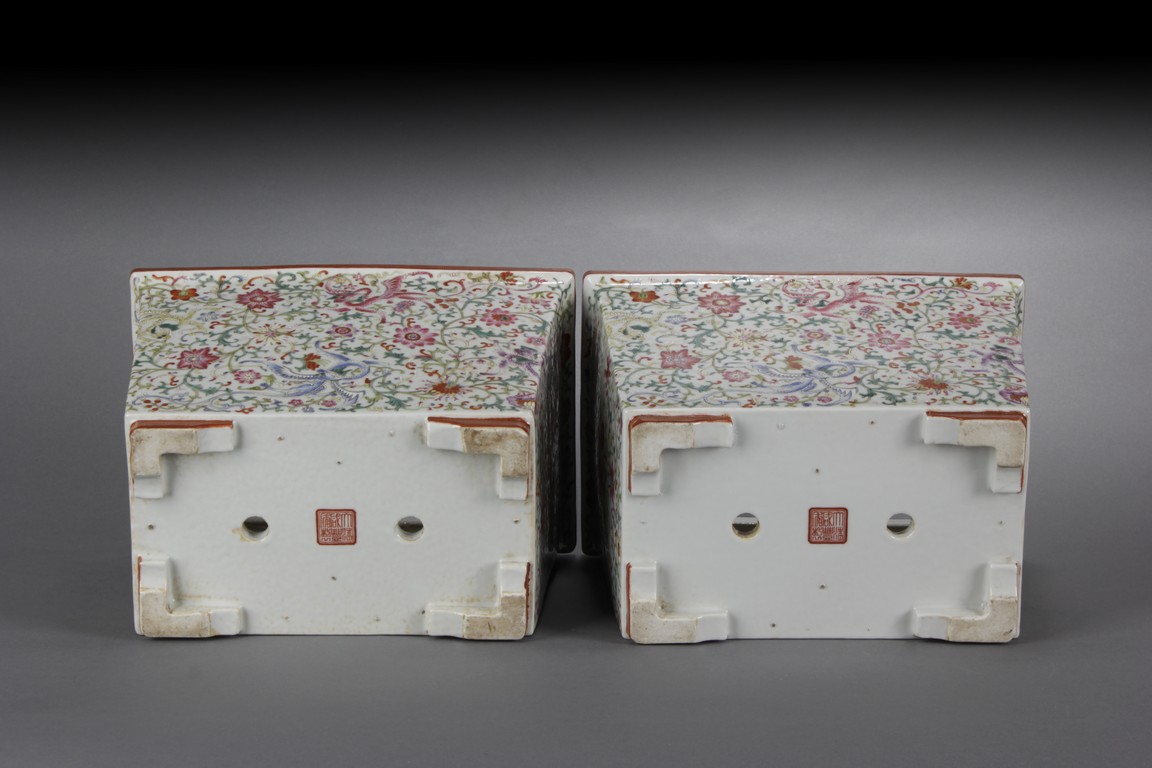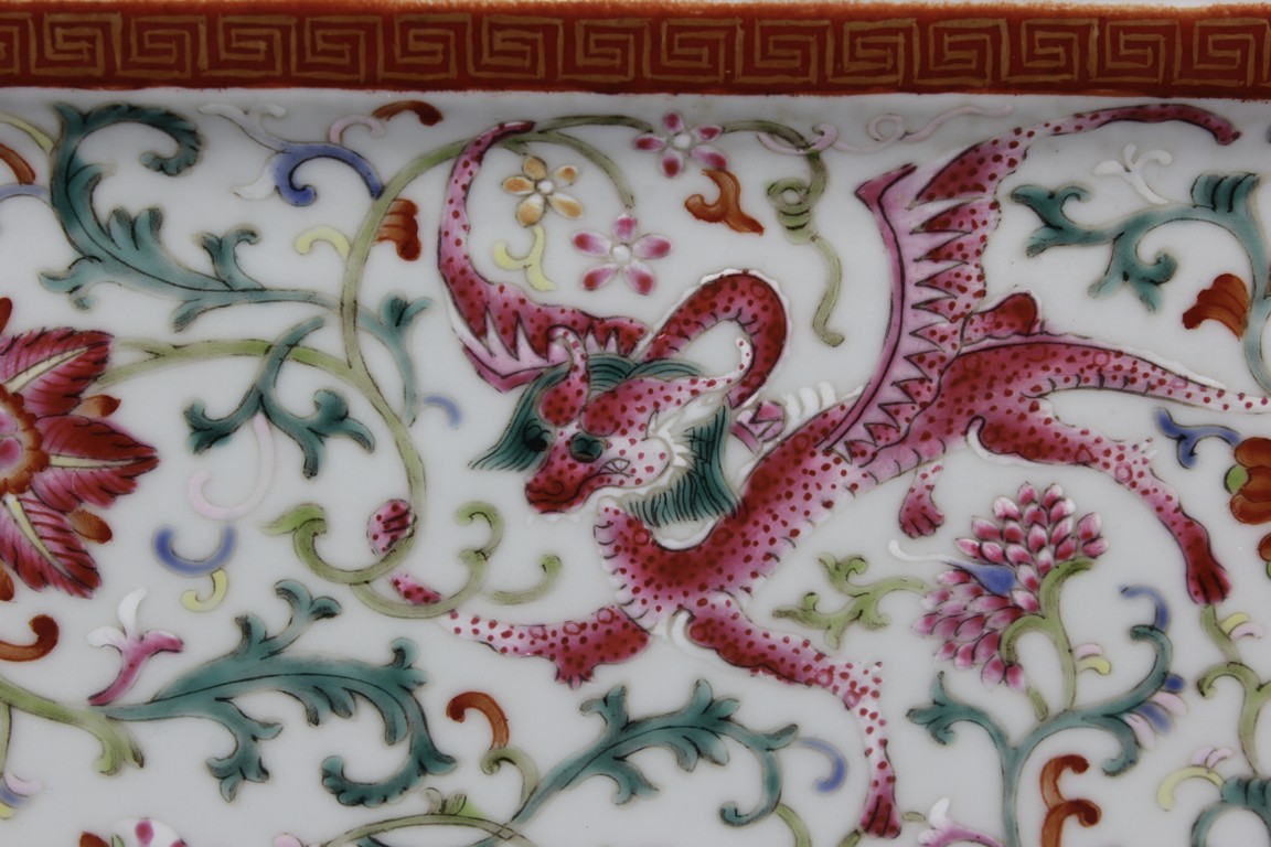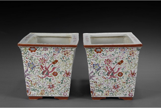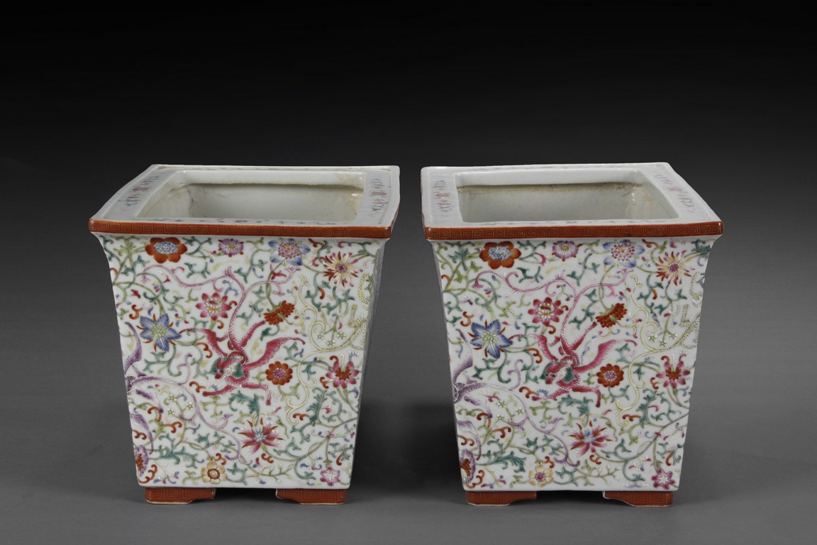 Of tapering rectangular form,the body painted with twisted chilong amidst dense lotus flowers and vines,the lipped rim painted with peony flowers and vines,the bottom bears six characters 'XIANFENG' mark. Late Qing Dynasty period.