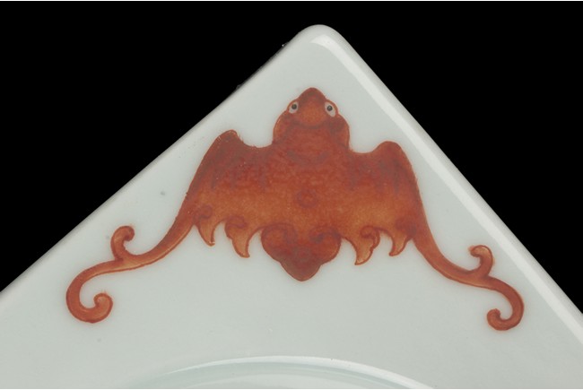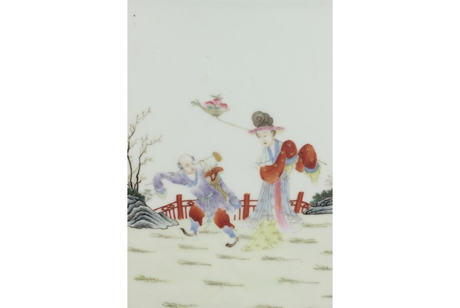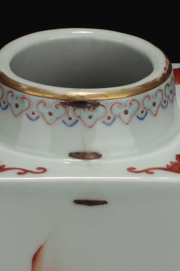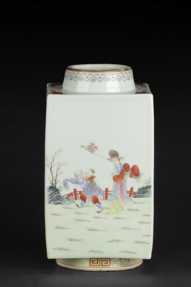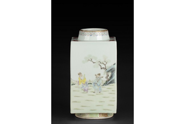 Of rectangular from,each side of the exterior painted with two Immortals in garden setting,the ring foot with key-fret patterns,shoulder with an bat in each corner,and neck with Ruyi head patterns,bottom bears six characters 'QIANLONG' mark. Repairs on the neck/rim. Qing Dynasty period.