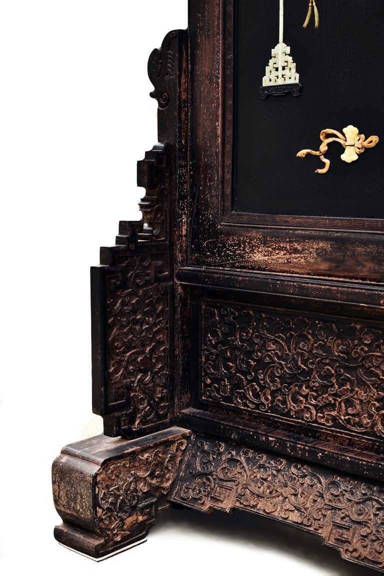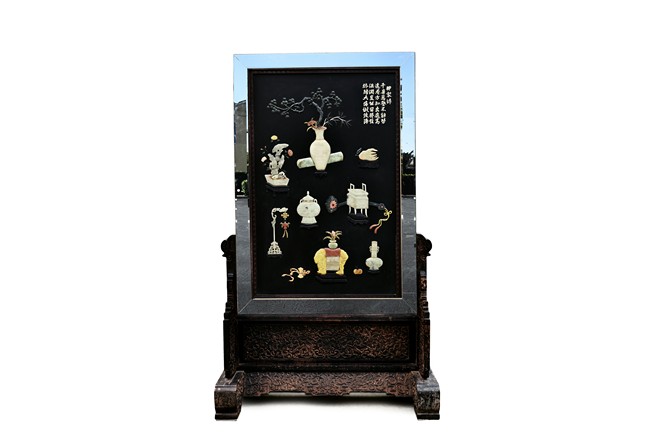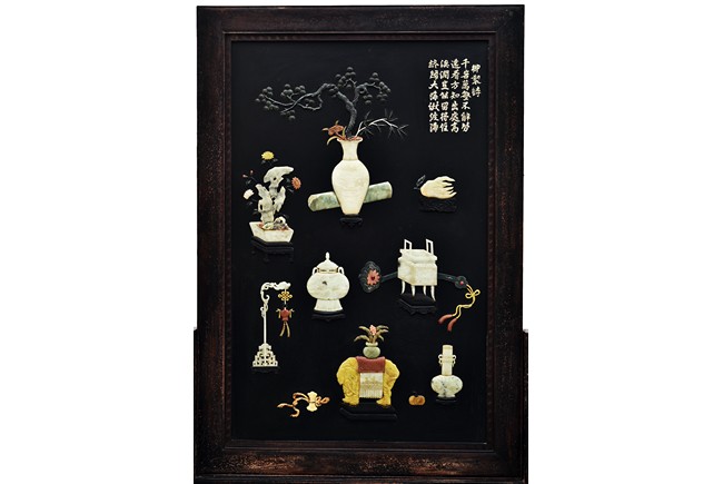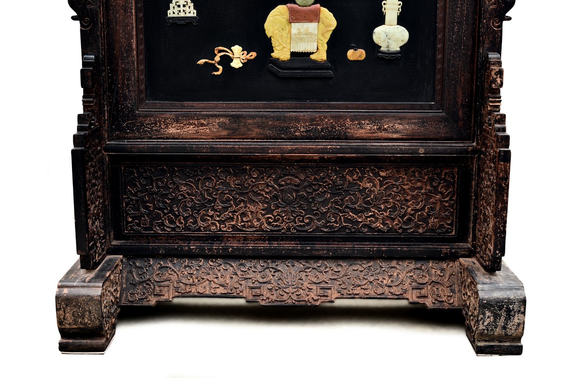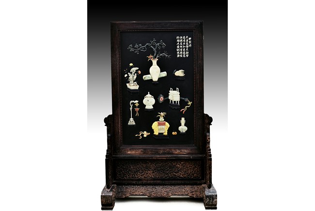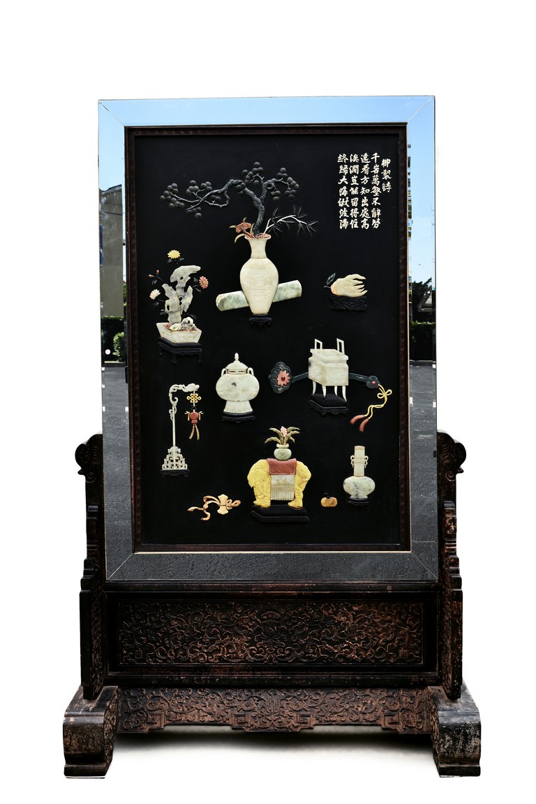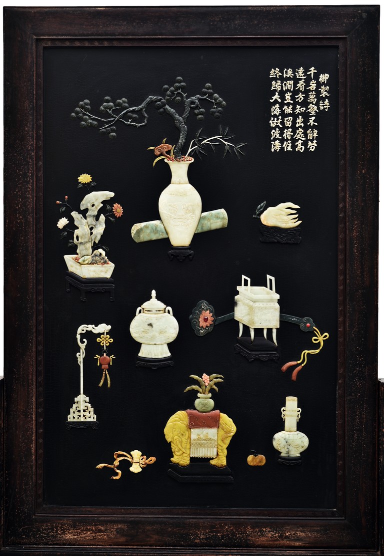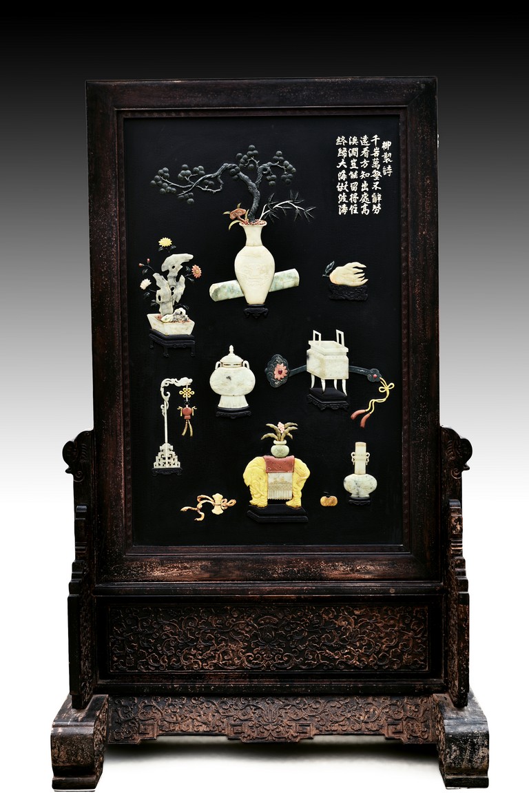 The panel is finely inlaid in white jade,yellow jade,spinach jade,black jade,and agate with precious and scholarly objects,including a yellow jade elephant,back draped with white jade and agate blanket,supporting a spinach jade vase containing flower and leaves; an archaistic white jade vessel ding and a spinach jade ruyi with yellow jade tassel; a white jade 'buddhist hand' on a black jade stand,etc. The upper right hand further embellished in white jade with an imperial poem. The reverse gilt-painted with scene of mountains and islands landscape,all reserved on black lacquer ground and set into a hongmu base carved on the aprons and spandrels with intricate stylized floral scrolls. Qing Dynasty period.
