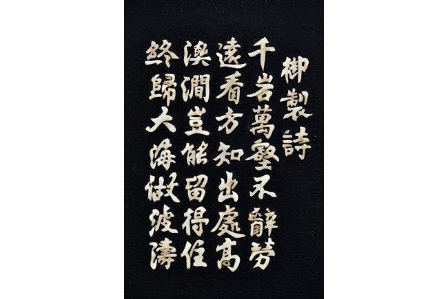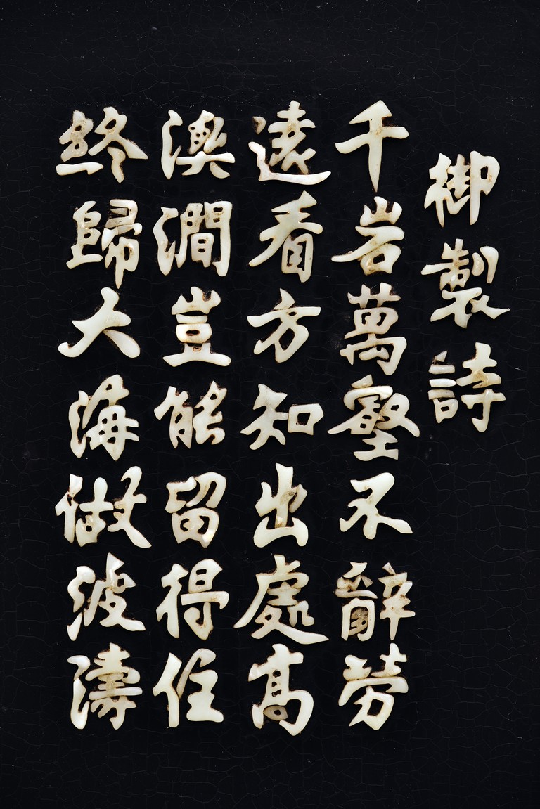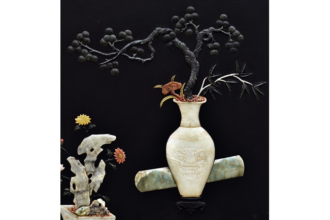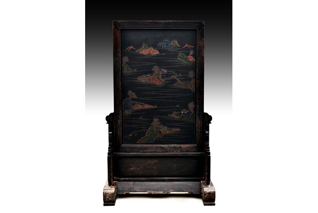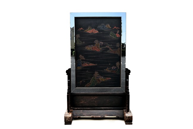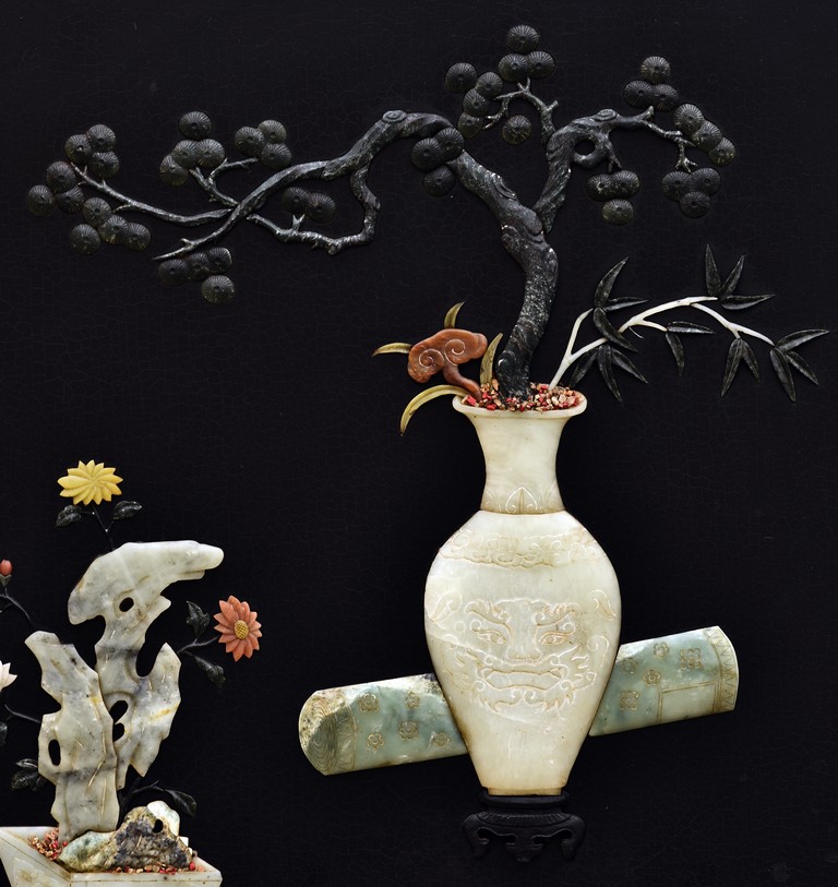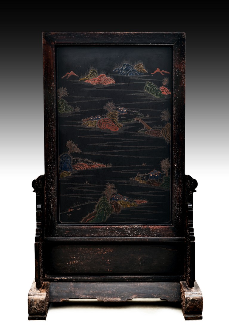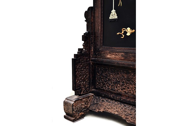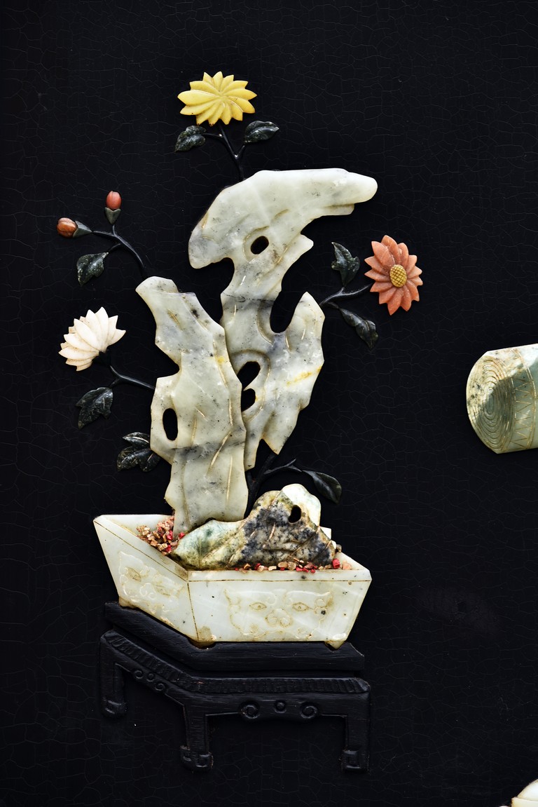 The panel is finely inlaid in white jade,yellow jade,spinach jade,black jade,and agate with precious and scholarly objects,including a yellow jade elephant,back draped with white jade and agate blanket,supporting a spinach jade vase containing flower and leaves; an archaistic white jade vessel ding and a spinach jade ruyi with yellow jade tassel; a white jade 'buddhist hand' on a black jade stand,etc. The upper right hand further embellished in white jade with an imperial poem. The reverse gilt-painted with scene of mountains and islands landscape,all reserved on black lacquer ground and set into a hongmu base carved on the aprons and spandrels with intricate stylized floral scrolls. Qing Dynasty period.
