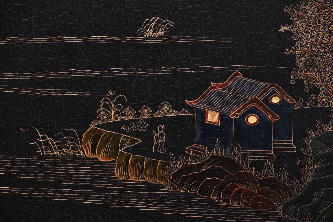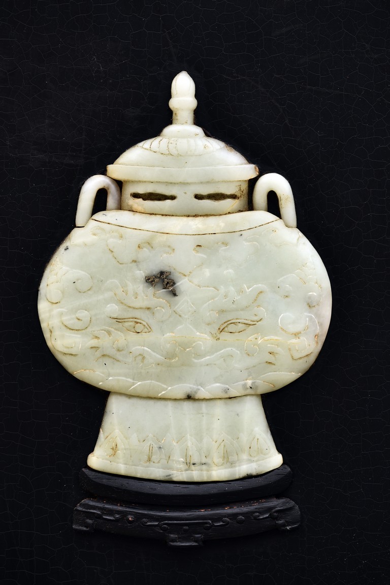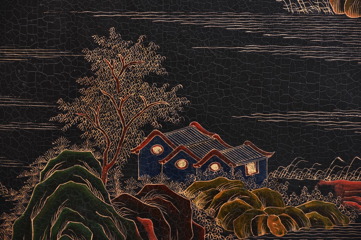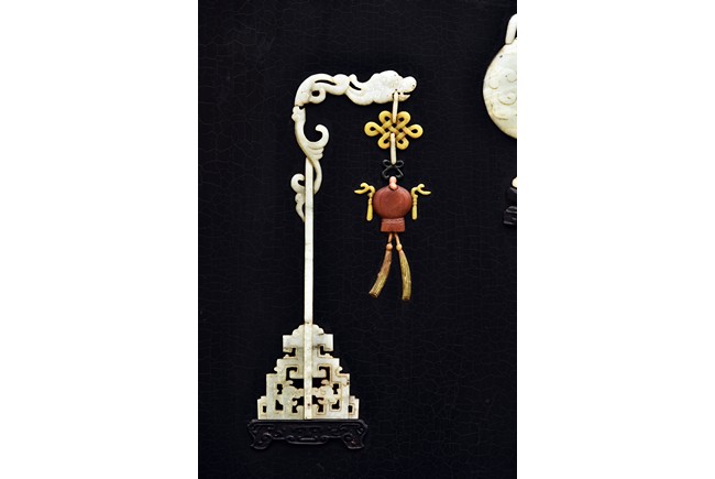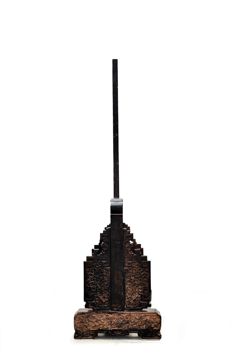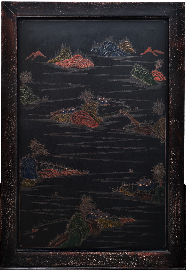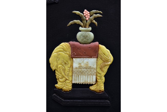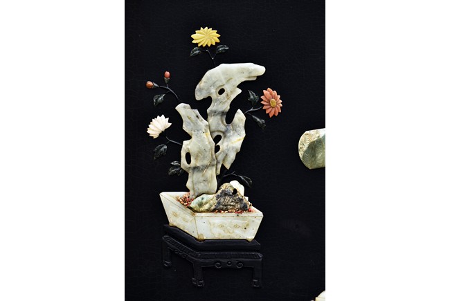 The panel is finely inlaid in white jade,yellow jade,spinach jade,black jade,and agate with precious and scholarly objects,including a yellow jade elephant,back draped with white jade and agate blanket,supporting a spinach jade vase containing flower and leaves; an archaistic white jade vessel ding and a spinach jade ruyi with yellow jade tassel; a white jade 'buddhist hand' on a black jade stand,etc. The upper right hand further embellished in white jade with an imperial poem. The reverse gilt-painted with scene of mountains and islands landscape,all reserved on black lacquer ground and set into a hongmu base carved on the aprons and spandrels with intricate stylized floral scrolls. Qing Dynasty period.