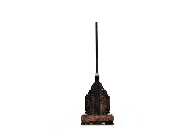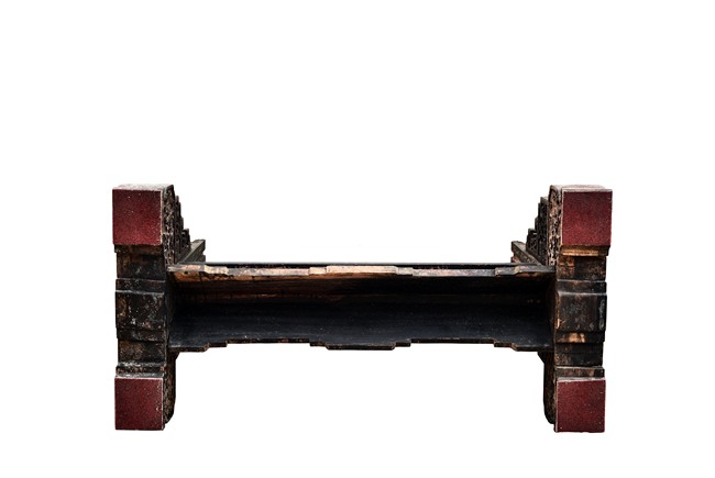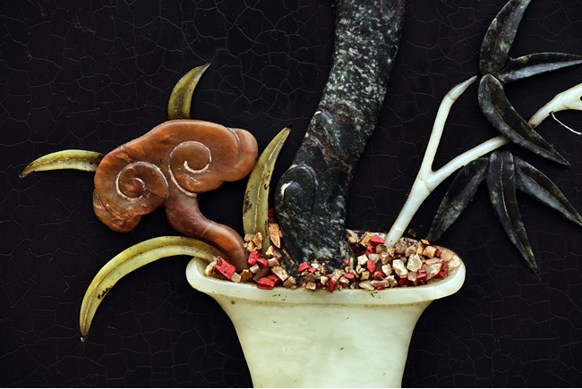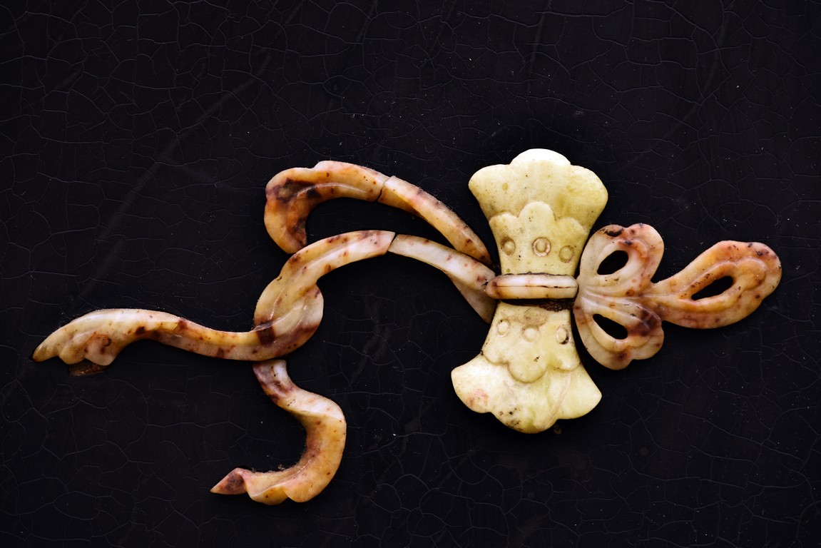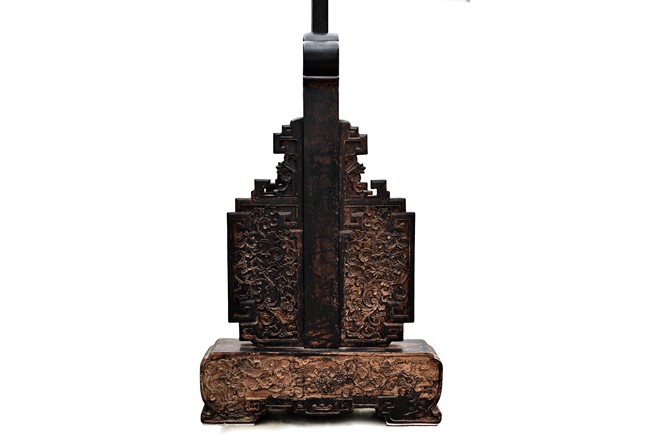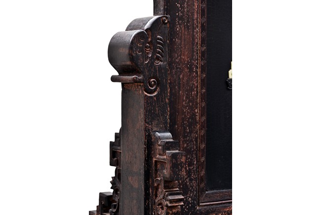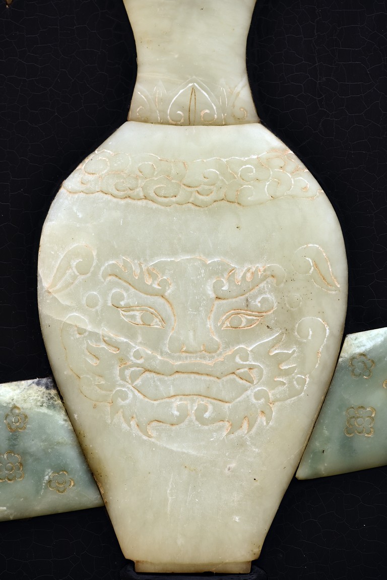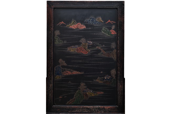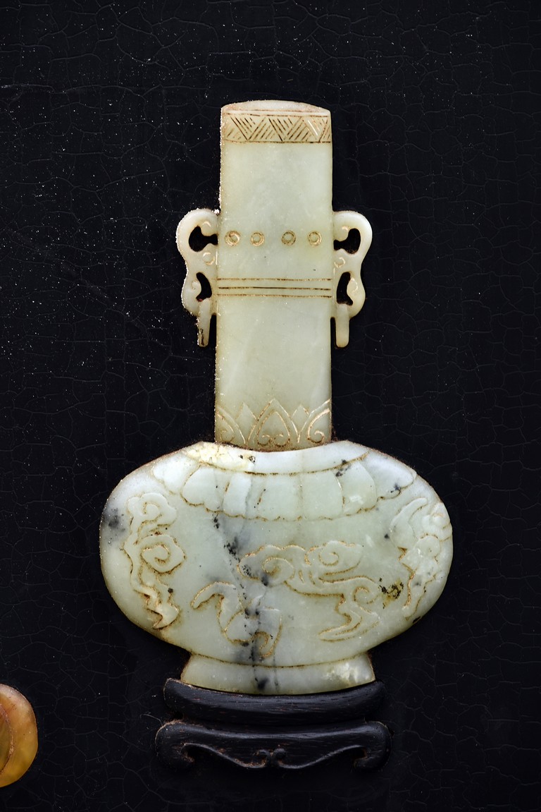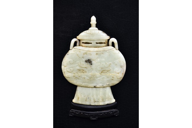 The panel is finely inlaid in white jade,yellow jade,spinach jade,black jade,and agate with precious and scholarly objects,including a yellow jade elephant,back draped with white jade and agate blanket,supporting a spinach jade vase containing flower and leaves; an archaistic white jade vessel ding and a spinach jade ruyi with yellow jade tassel; a white jade 'buddhist hand' on a black jade stand,etc. The upper right hand further embellished in white jade with an imperial poem. The reverse gilt-painted with scene of mountains and islands landscape,all reserved on black lacquer ground and set into a hongmu base carved on the aprons and spandrels with intricate stylized floral scrolls. Qing Dynasty period.
