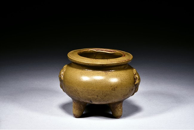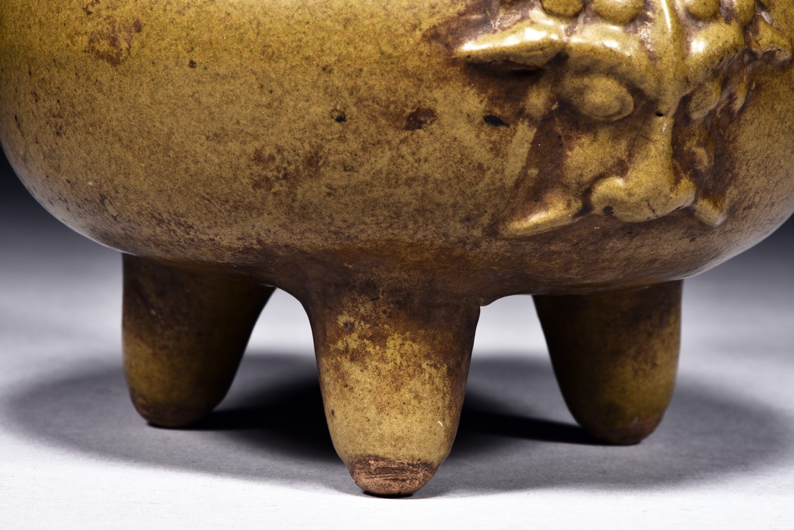 Raised on three feet,of compressed globular form flanked by two raised lion motif,overall covered in tea dust glaze. Qing Dynasty period.