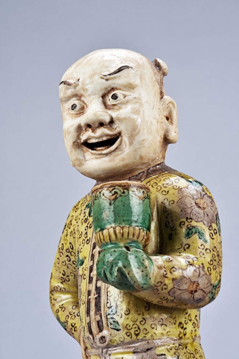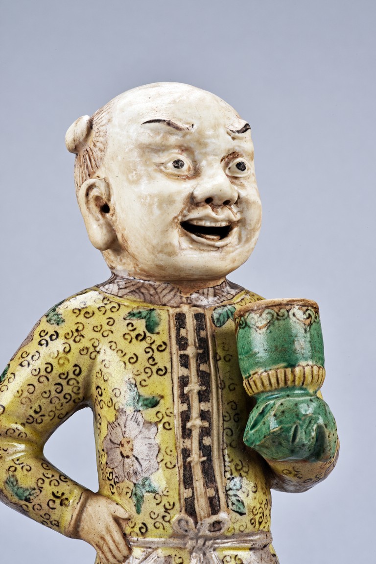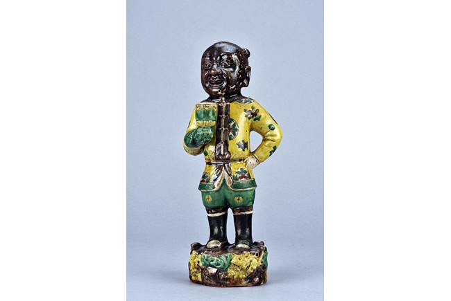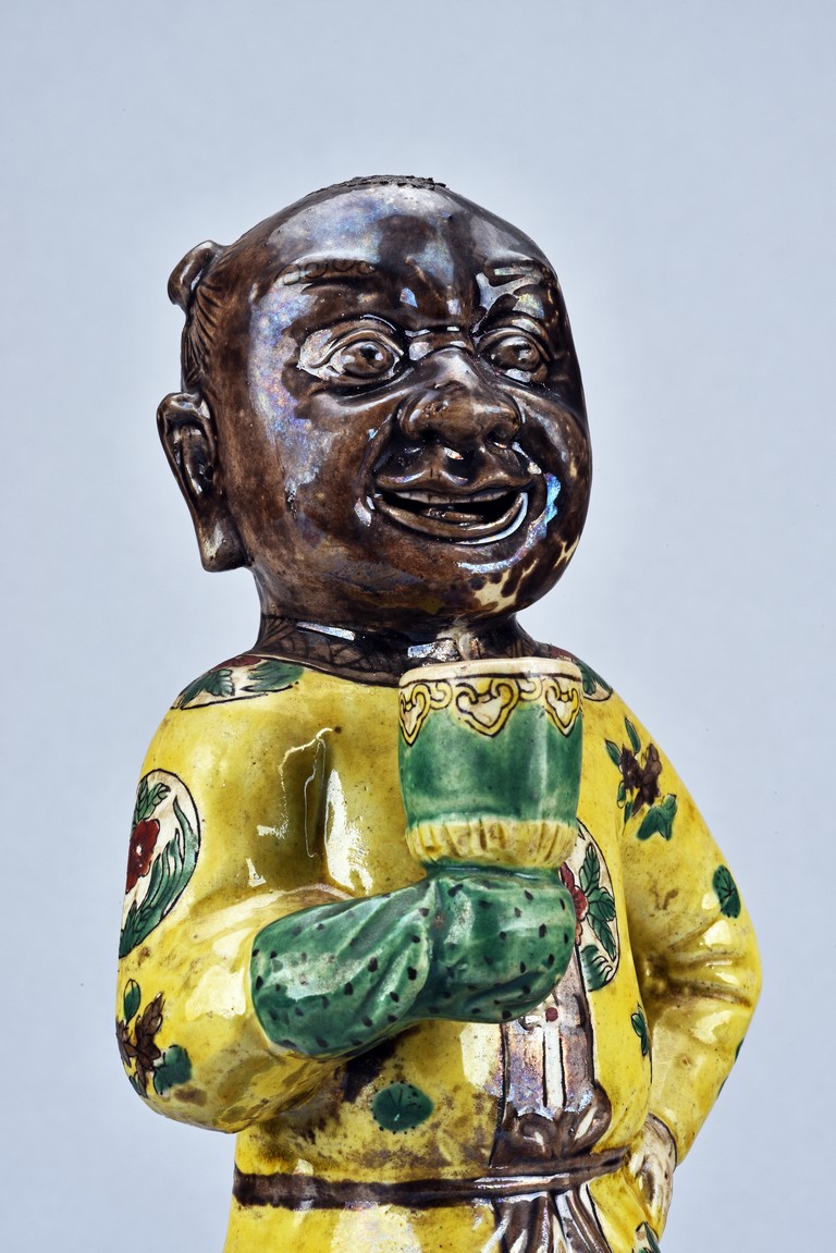 Each is modelled standing straight and holding a cup on one hand,wearing clothes enamelled in yellow and green and decorated with floral pattern,one with black,the other with white face Republic period.