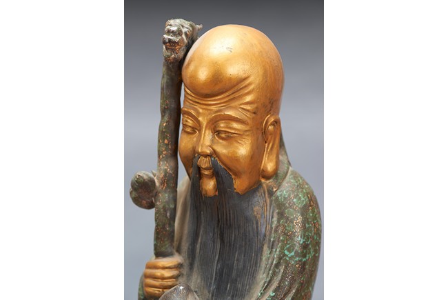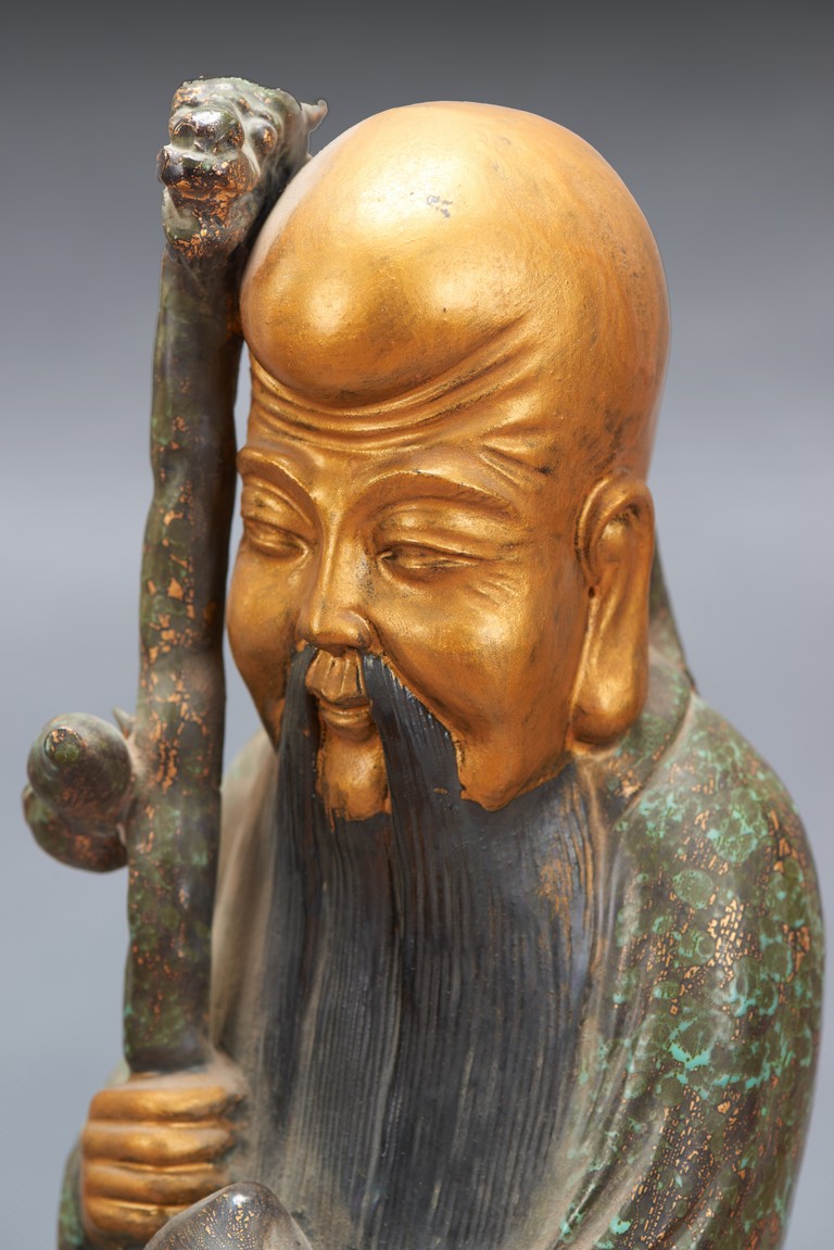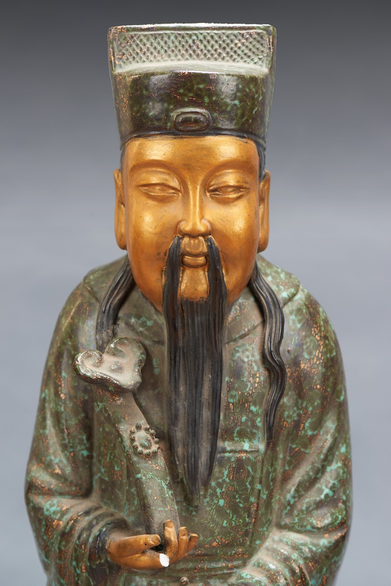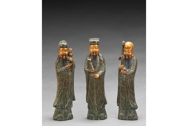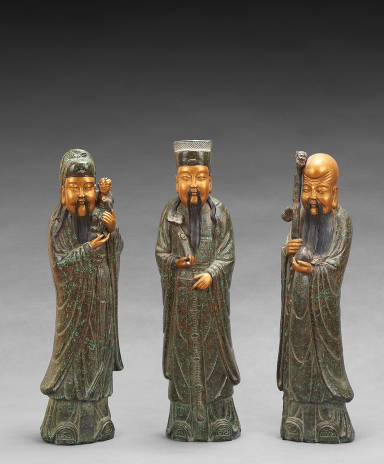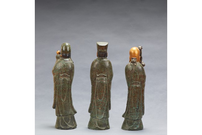 The group comprises of three large glazed immortal figures,fu,lu,and shou,each representing prosperity,status and longevity,each wearing long robe with elegant folds,glazed with flecks of robin's egg blue,the face richly painted in gilt,the underside impressed with four character mark 'Fujian Hui Guan' which may be translated as Hokkien Association. Qing Dynasty period.