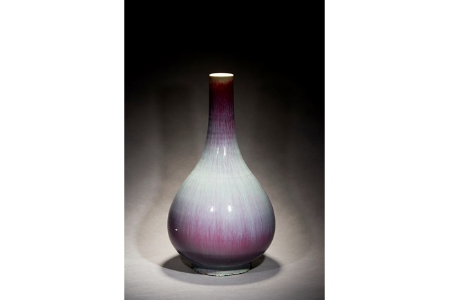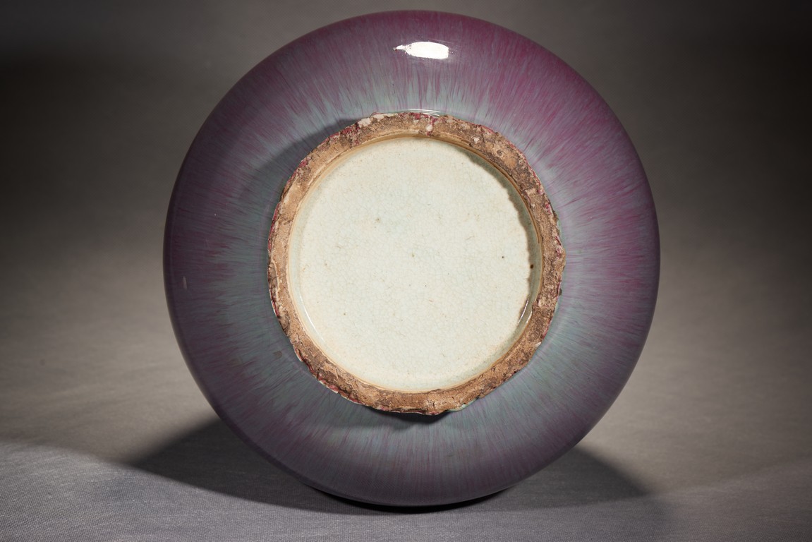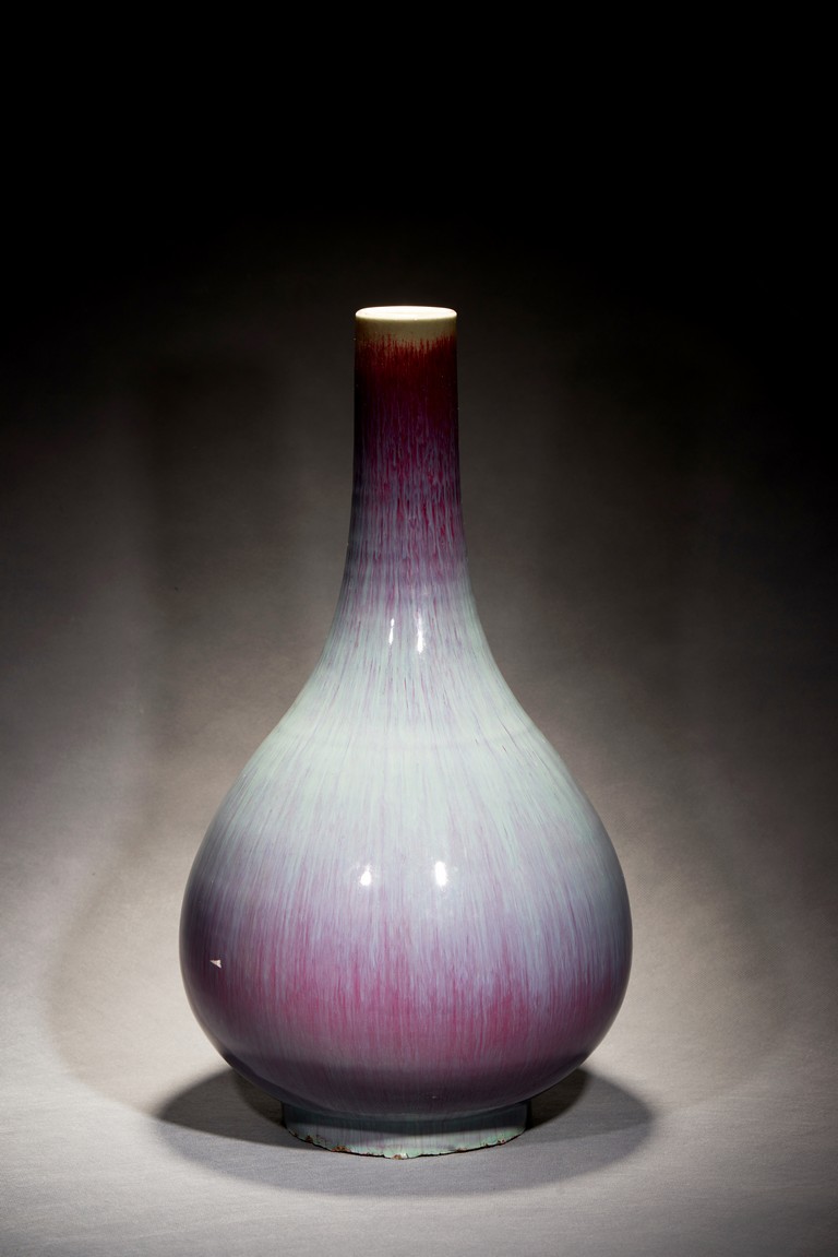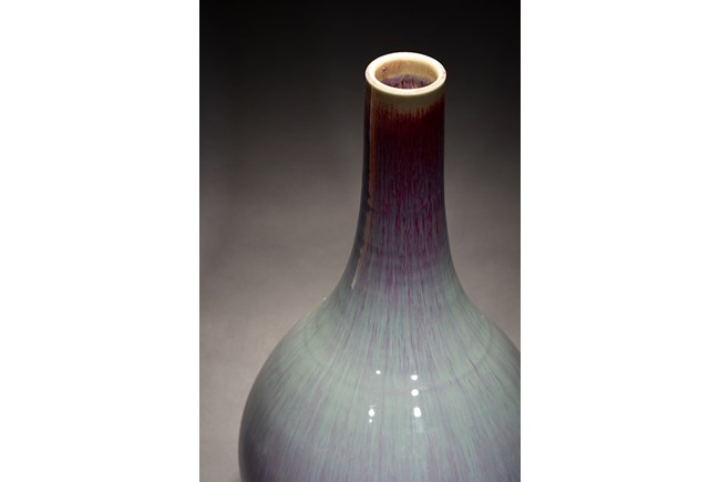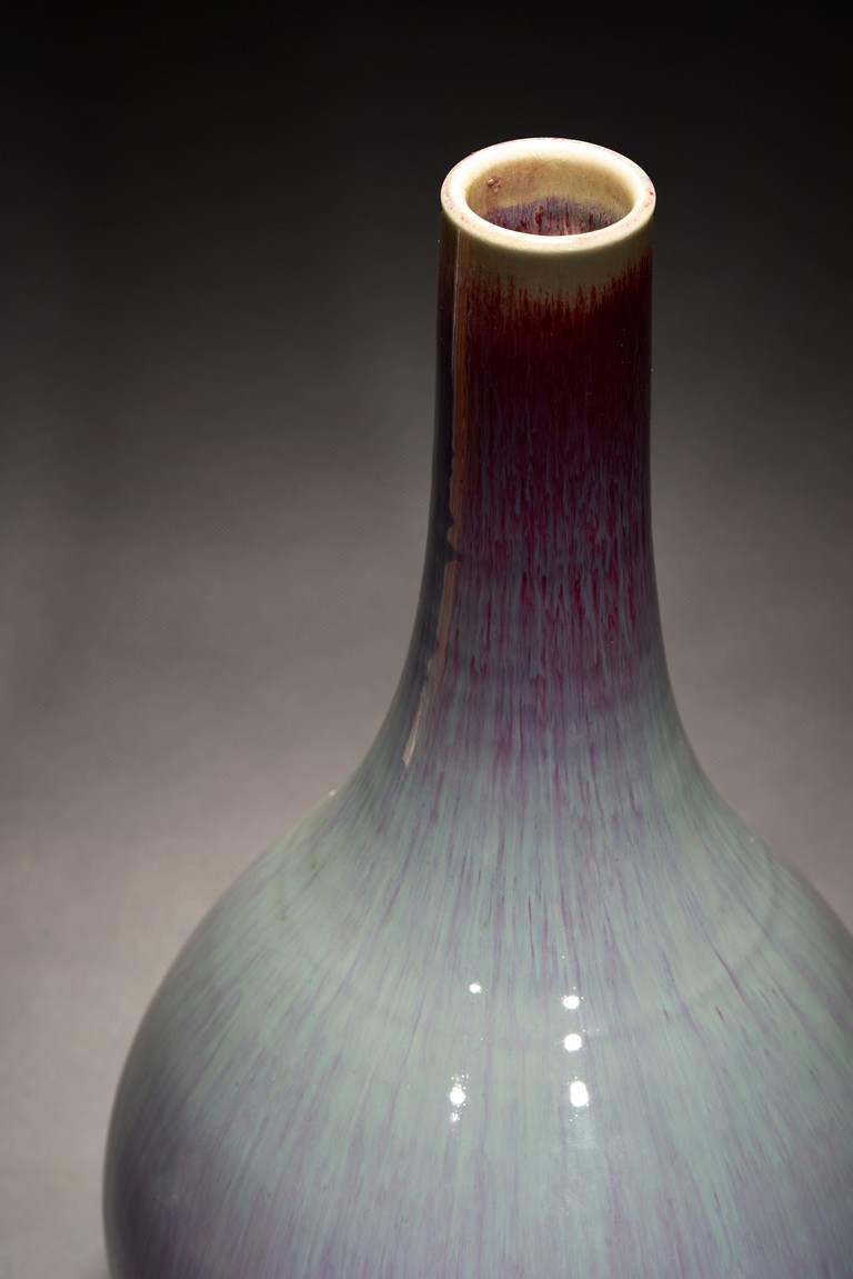 Elegantly potted with a tall tapering cylindrical neck and set on a cylindrical foot,covered with milky blue tone thinning towards mouth rim and base which glazed in attractive purplish lavender tone. Late Qing Dynasty period.