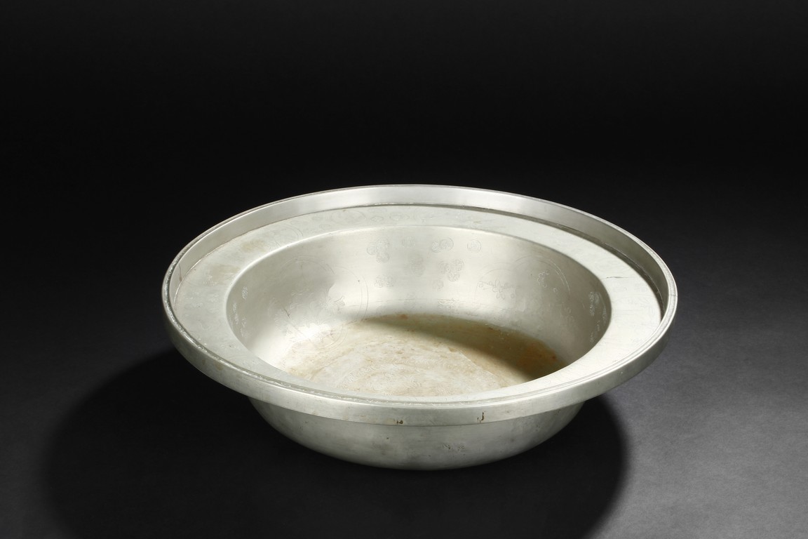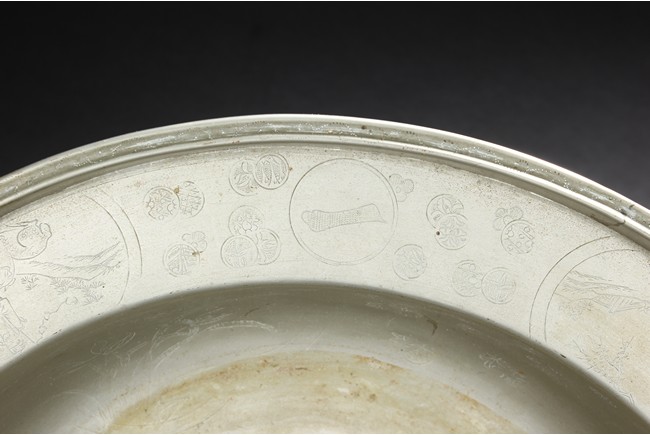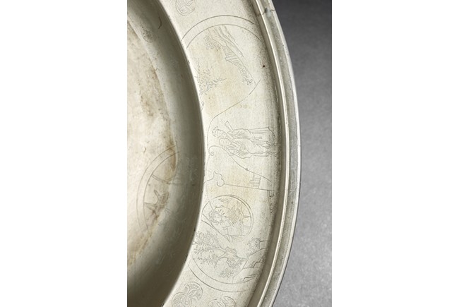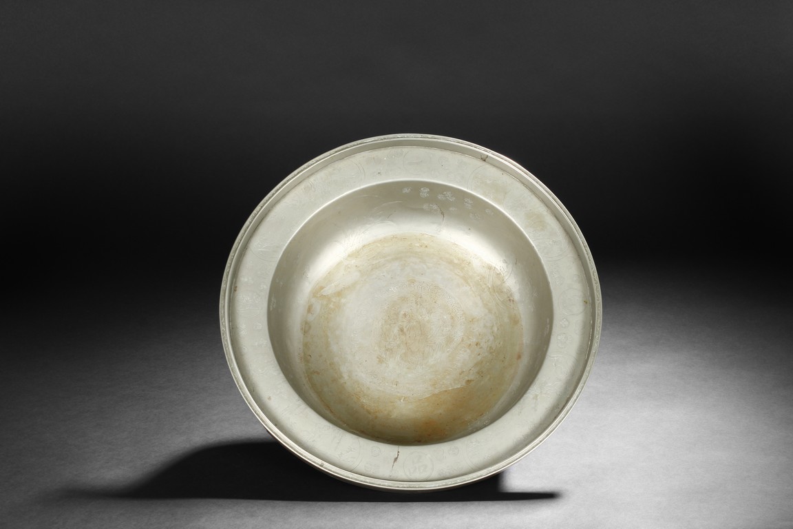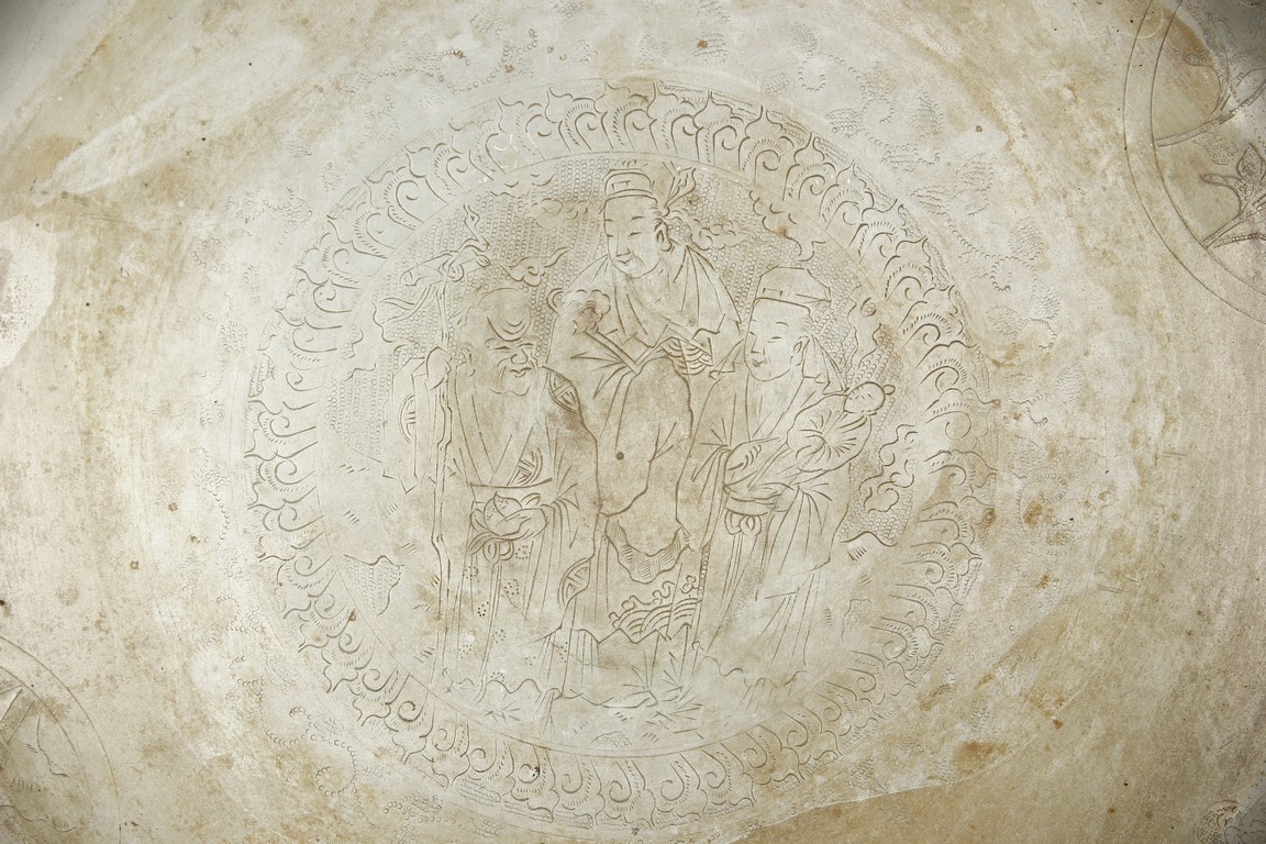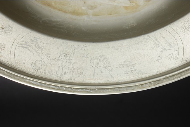 The interior finely incised with fu lu shou in a roundel,the mouth rim further decorated with story scenes and four roundels enclosing the four character Yi Pin Dang Chao,the underside base inscribed with inscriptions. Qing Dynasty period.